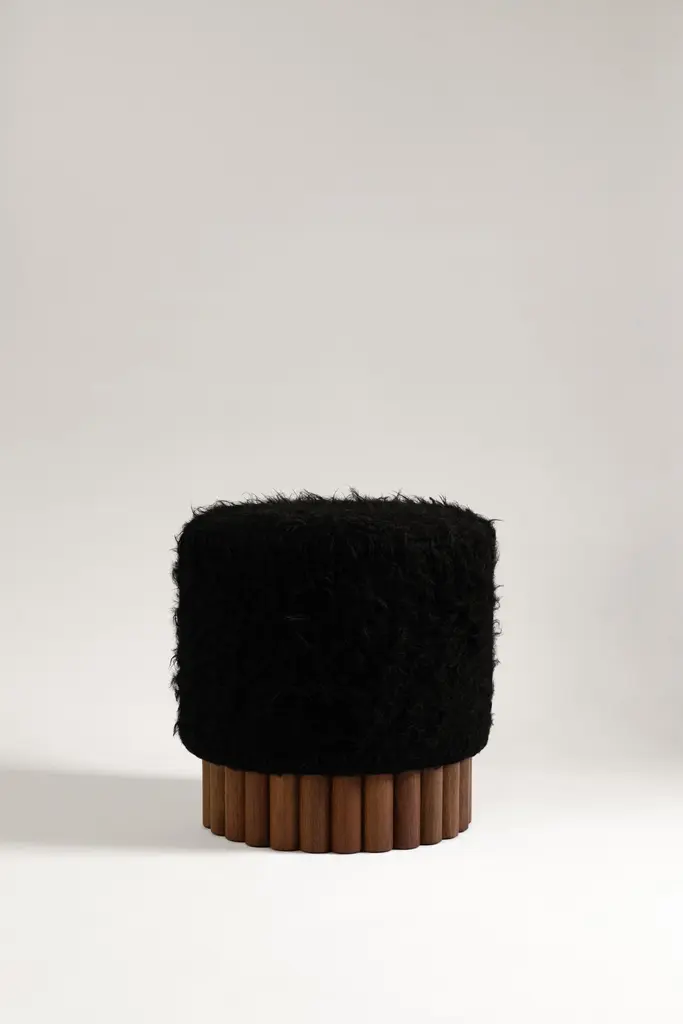 LOTO collection is the result of exploration using slender wooden dowels to compose different planes and shapes. Contrasted with materials, textures and effects, we have achieved a collection of statement pieces that are both elegant and enjoyable.LOTO poufs are circular poufs are warm and inviting, upholstered with the coziest materials that cover most of the pouf's surface leaving only the slightest peek of its wooden rod base, to highlight the contrast of the two different textures.Available in a variety of natural upholsteriesWoolen fabric, Long pile shag wool, Linen, Boucle, Leather, Sunbrella, Velvet.Solid wood rods base options Beech Wood, Tzalam Wood, or Black Finished Oak Wood.