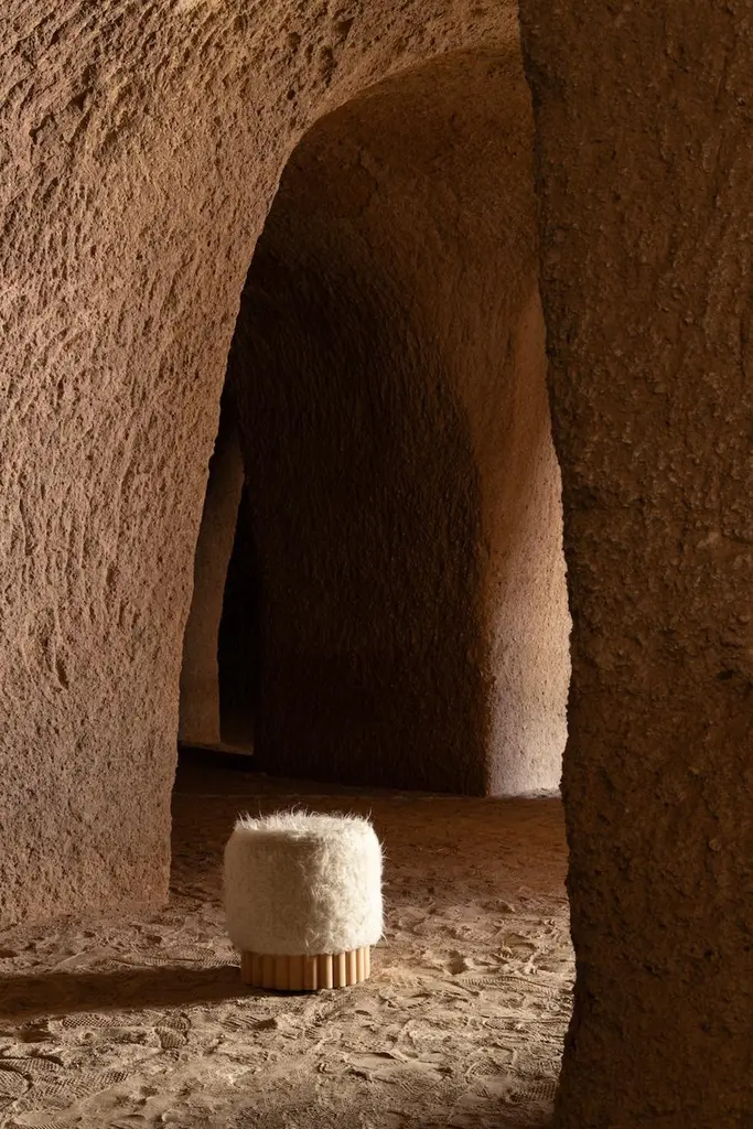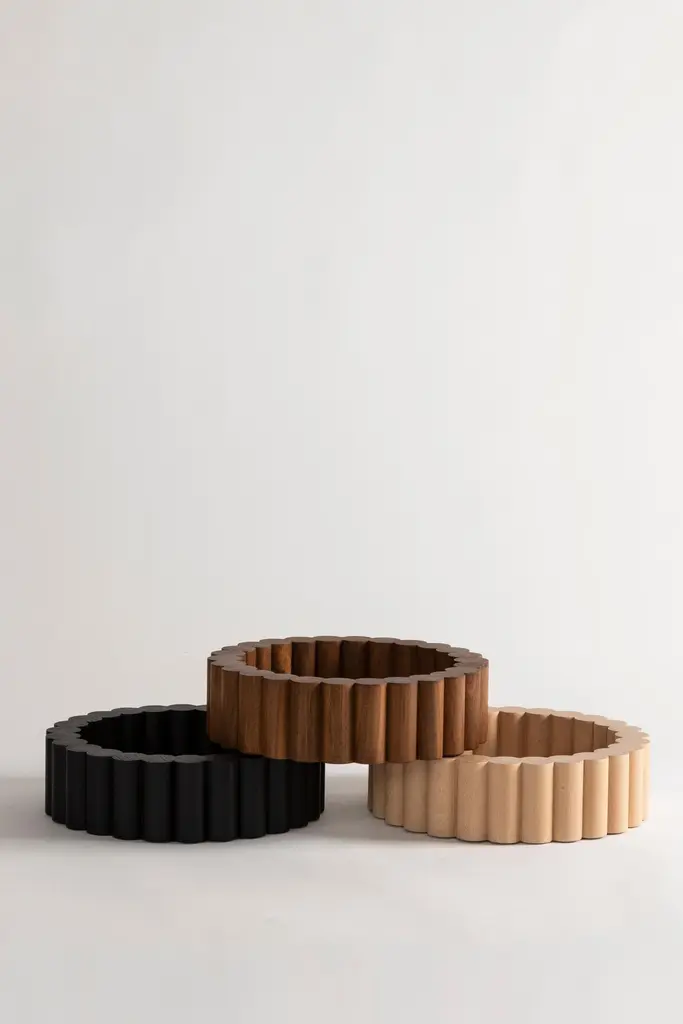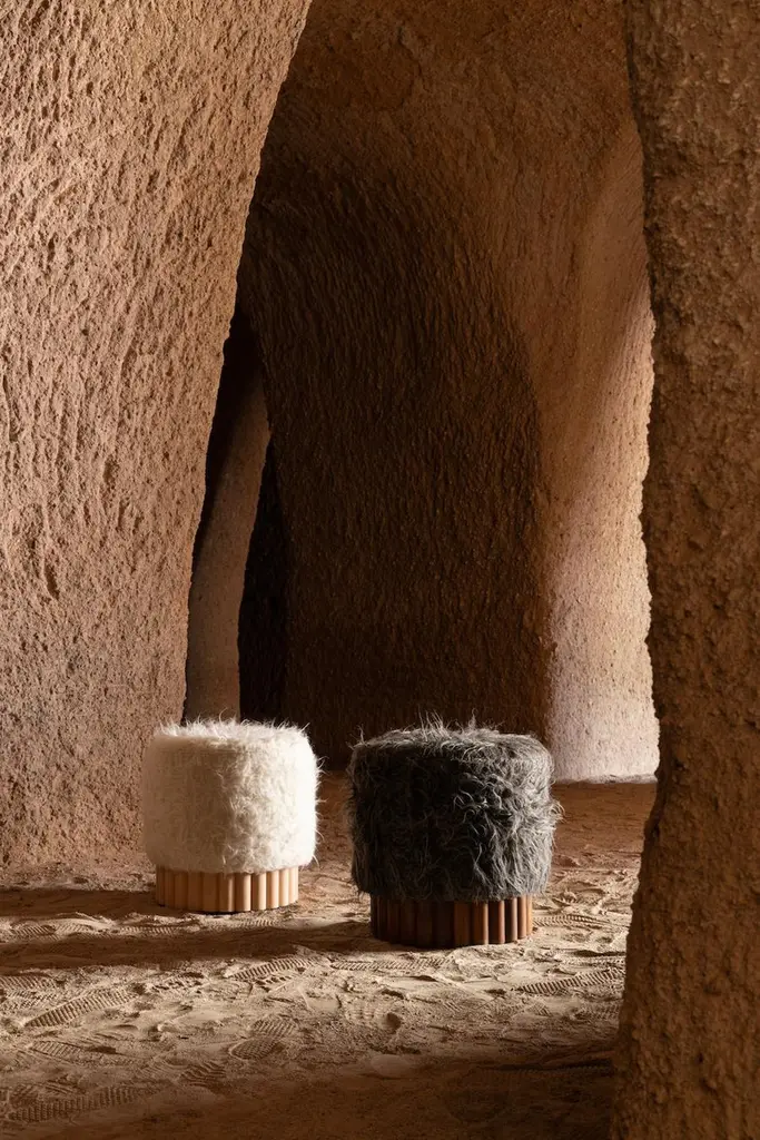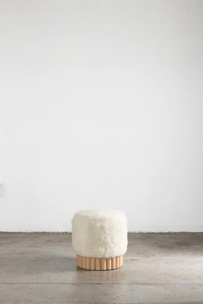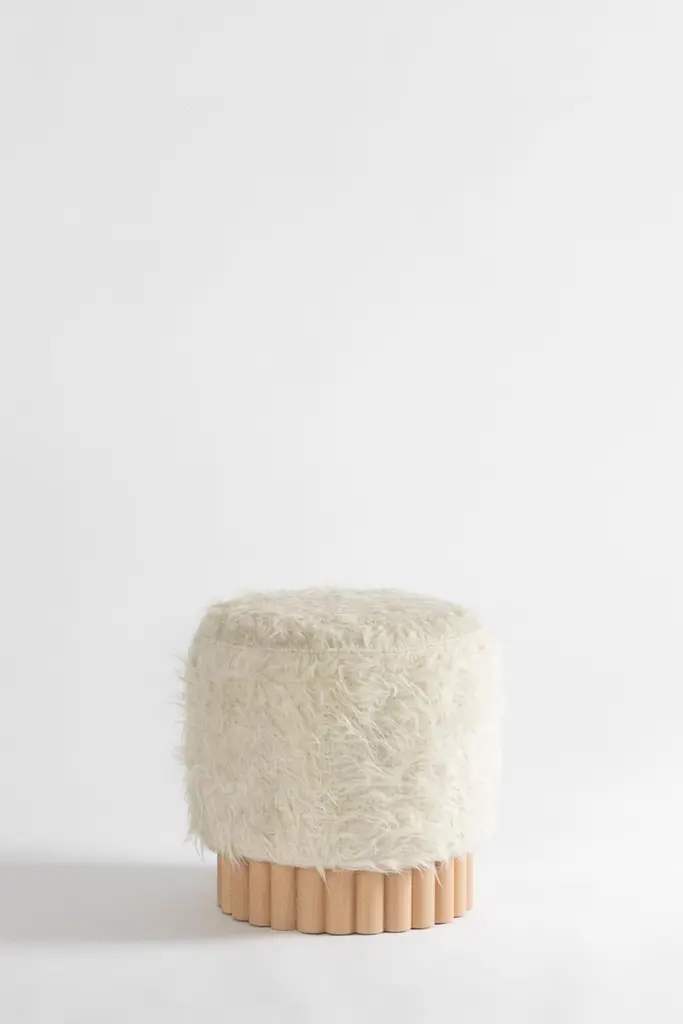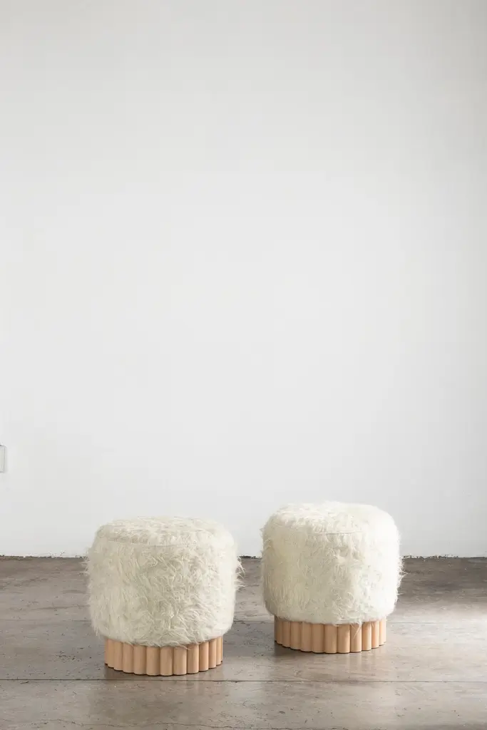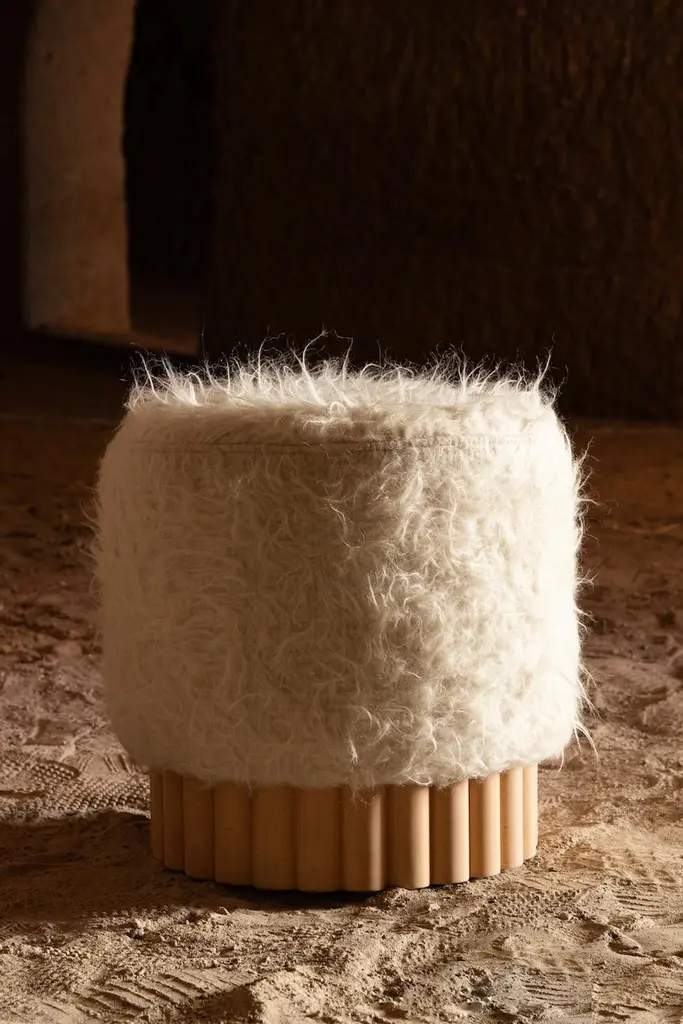LOTO collection is the result of exploration using slender wooden dowels to compose different planes and shapes. Contrasted with materials, textures and effects, we have achieved a collection of statement pieces that are both elegant and enjoyable.LOTO poufs are circular poufs are warm and inviting, upholstered with the coziest materials that cover most of the pouf's surface leaving only the slightest peek of its wooden rod base, to highlight the contrast of the two different textures.Available in a variety of natural upholsteriesWoolen fabric, Long pile shag wool, Linen, Boucle, Leather, Sunbrella, Velvet.Solid wood rods base options Beech Wood, Tzalam Wood, or Black Finished Oak Wood.