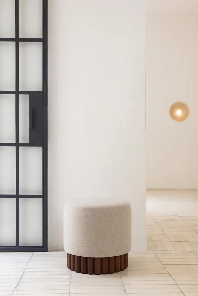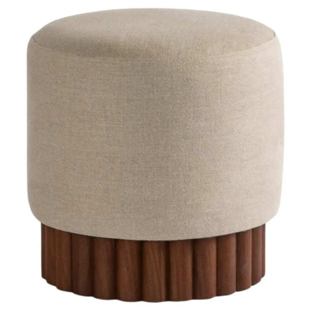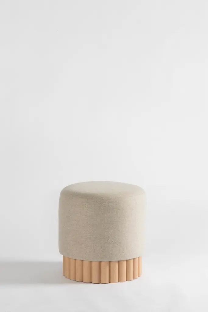 LOTO collection is the result of exploration using slender wooden dowels to compose different planes and shapes. Contrasted with materials, textures and effects, we have achieved a collection of statement pieces that are both elegant and enjoyable.LOTO poufs are circular poufs are warm and inviting, upholstered with the coziest materials that cover most of the pouf's surface leaving only the slightest peek of its wooden rod base, to highlight the contrast of the two different textures.Available in a variety of natural upholsteriesWoolen fabric, Long pile shag wool, Linen, Boucle, Leather, Sunbrella, Velvet.Solid wood rods base options Beech Wood, Tzalam Wood, or Black Finished Oak Wood.