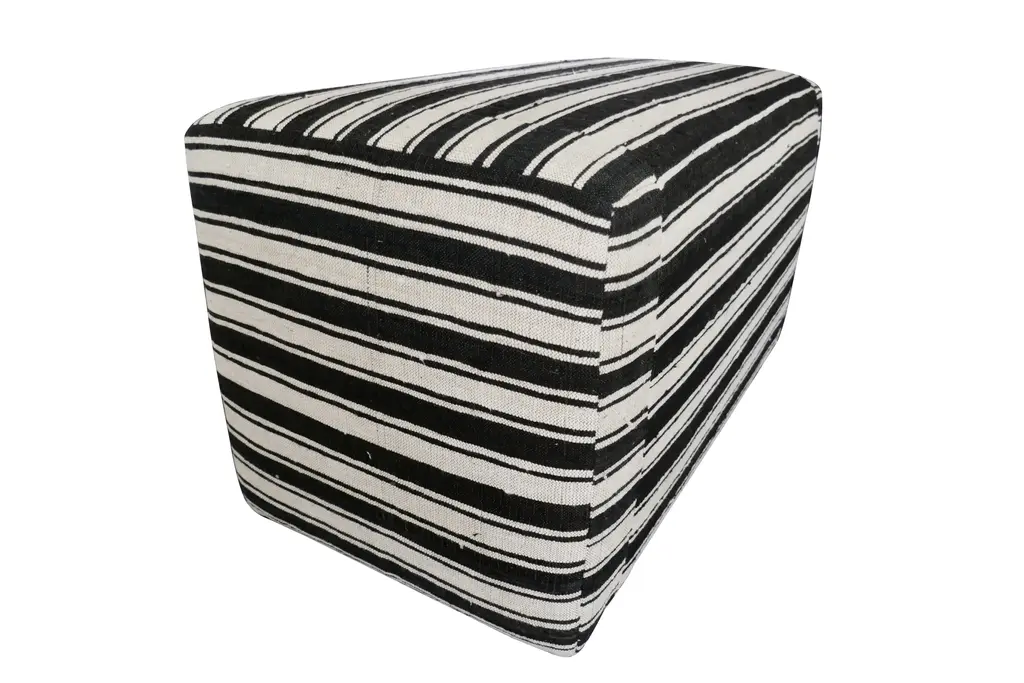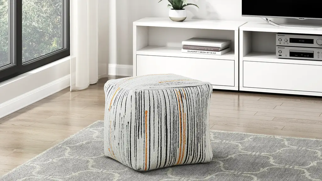 Whether the Lucian Pouf serves to provide stylish accent to your home's decor, convenient seating when the need arises, or as perfect place to put up your feet, the square accent pouf's versatility of purpose makes it a convenient addition to your space. The pouf is covered in a multi-hued orange, black, and white jacquard fabric upholstery.