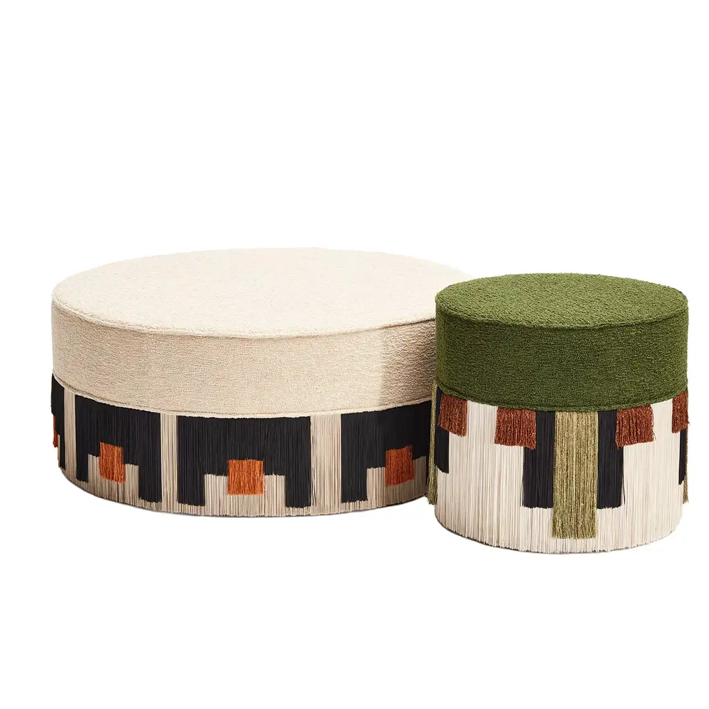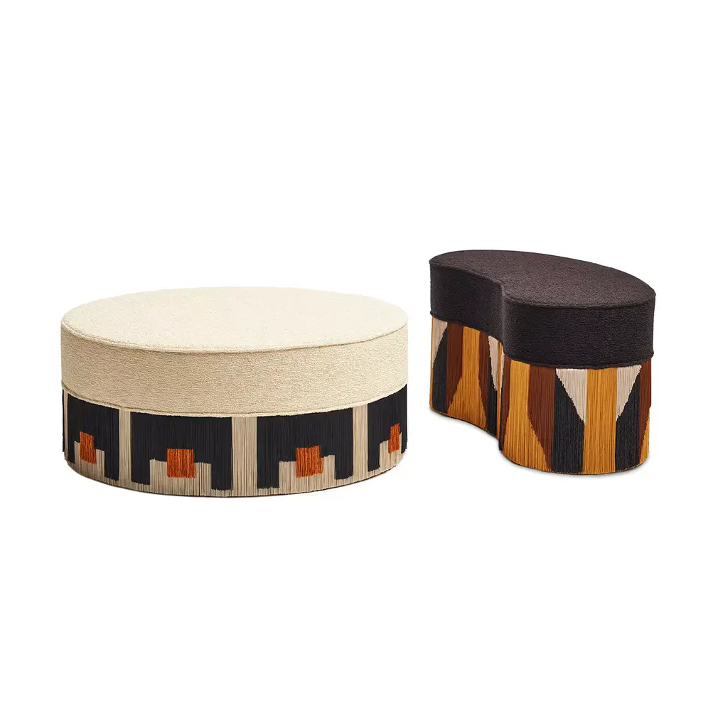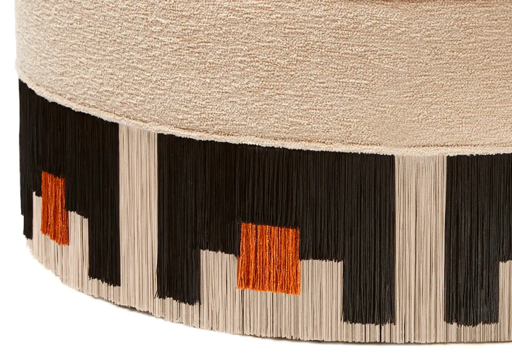 This remarkable Mali pouf by Lorenza Bozzoli is entirely handcrafted, signed, and numbered by this versatile artist. Showcasing a plushy beige upholstered seat, with a geometric pattern viscose and lurex fringe skirt, this piece will be a unique decorative accent in a contemporary space. Customization is available, please contact the Concierge for information.