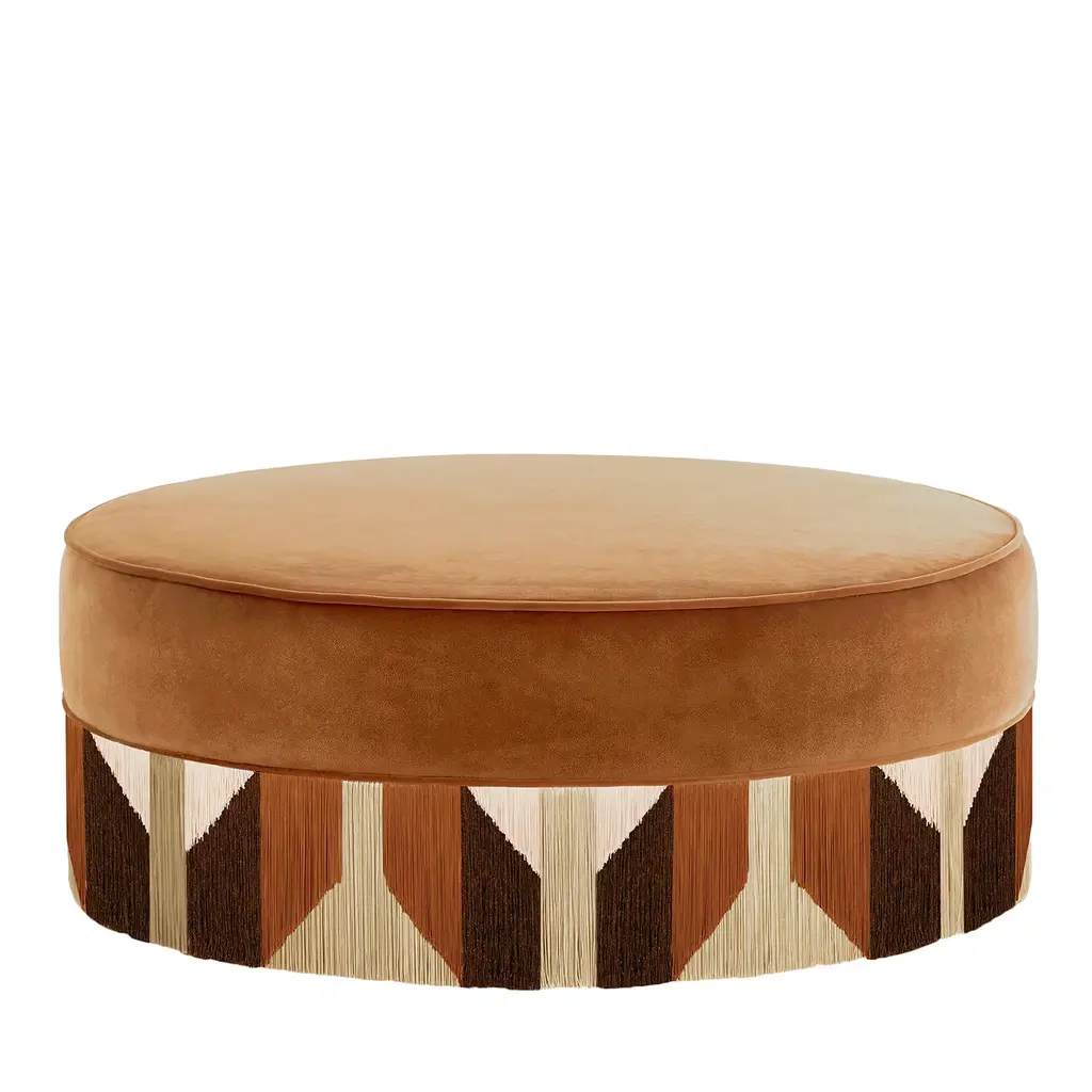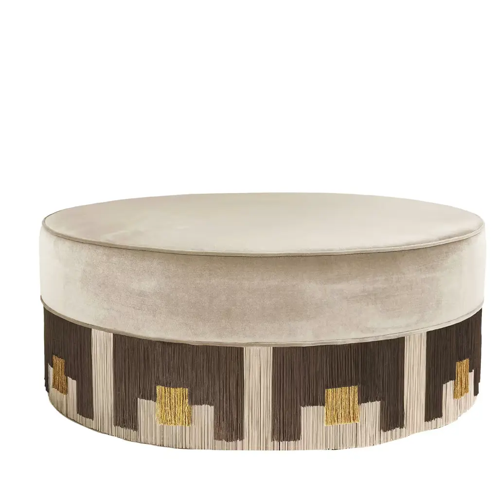 Exotic scenarios come to mind when admiring this round beech pouf from the Mali Collection. The array of lurex and viscose fringes offered in a combination of beige and black with orange accents outlines an intriguing tribal-style pattern counterbalanced in its visual impact by the solid warm-beige velvet covering the seat. Please contact the Concierge for available variants. Each bespoke piece is stamped on the bottom of the pouf’s lining and personally signed, numbered, and dated by designer.