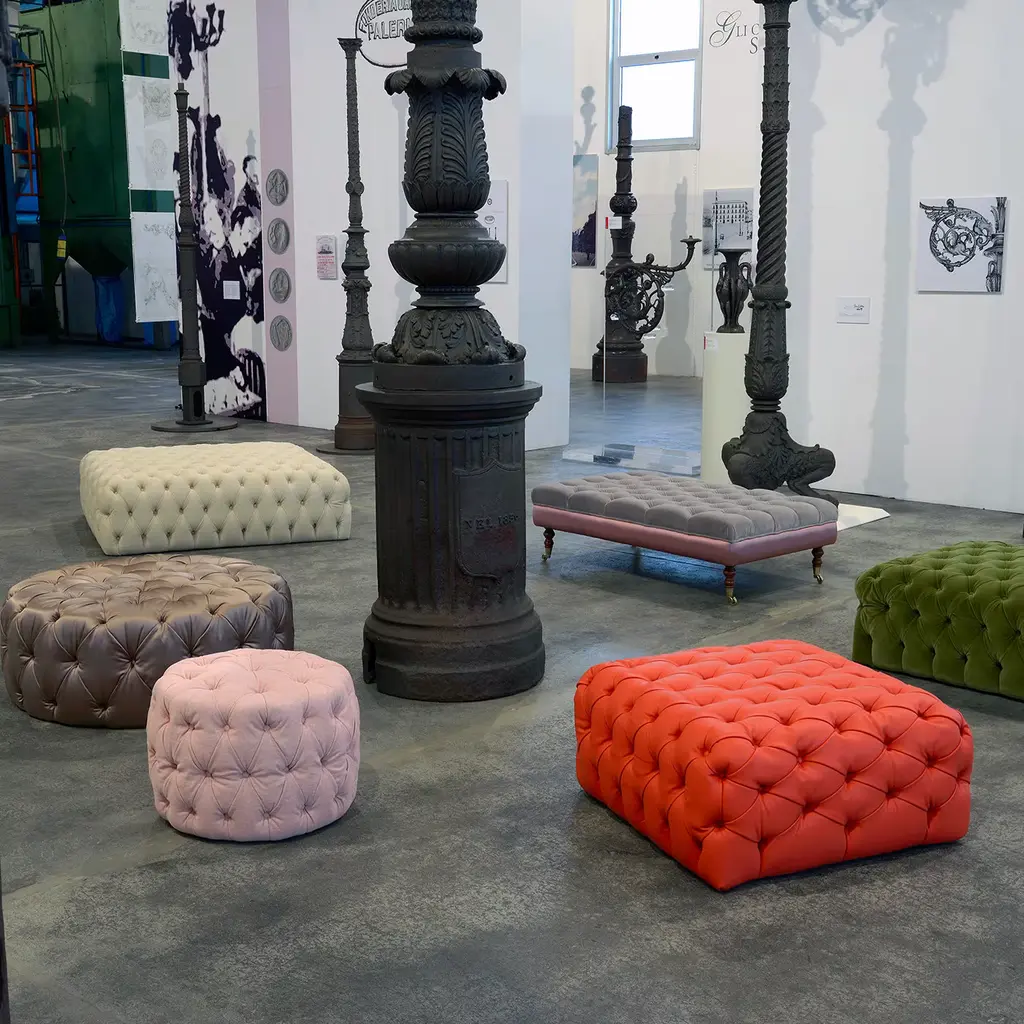 Playing a leading role in the living room, where it becomes a central island to display art books and trays, or in front of a sofa to offer a welcoming seat for guests, this precious pouf is as elegant as it is functional. The plywood and fir frame, padded with multi-density polyurethane, boasts a hunter green Dacron upholstery with an exquisite tufted work. The recessed feet are in PVC.