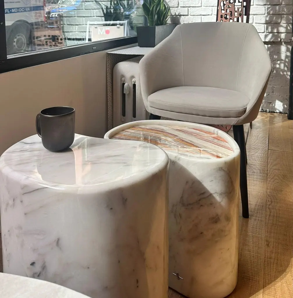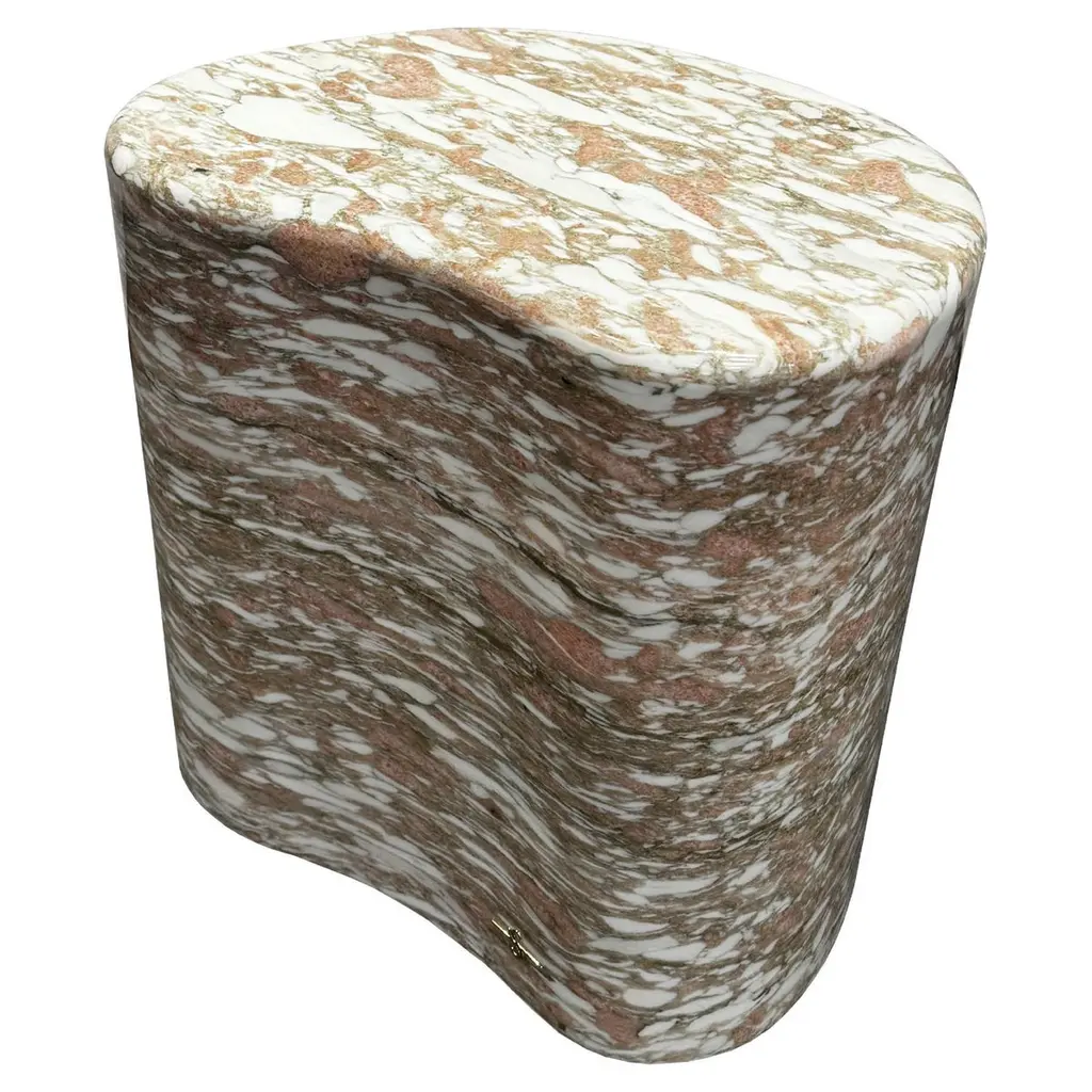 Marble Pouf Table by Euromarmi StoreDimensions: D 40 x W 33 x H 45 cm.Materials: Calacatta marble, Picasso Onyx.Founded by Angela Stiuso, Euromarmi Store was born from the experience and dedication that the stone processing has passed down from generation to generation.Each creation carries with it the legacy of centuries of Italian craftsmanship and meticulous manufacturing enhanced in every single process, in perfect balance between tradition and innovation. Our fine materials, manual skills, and passion are the assets that guide Euromarmi Store in the production of inimitable objects, creating a rare and magical identity with timeless elegance.Our wide range of products offers a wide choice that ranges from furnishing accessories to objects, from mineralogy to natural stone jewelry. In addition, we offer a highly specialized design service for the planning and construction of interiors and exteriors, using highly technological machinery capable of satisfying every personalized request.Production strictly follows sustainability principles, adopting practices aimed at reusing and enhancing resources. We are committed to maximizing the value of each material treated, ensuring that nothing loses its intrinsic value. This ethical approach translates into a responsible production cycle, aligned with the highest standards of environmental sustainability.