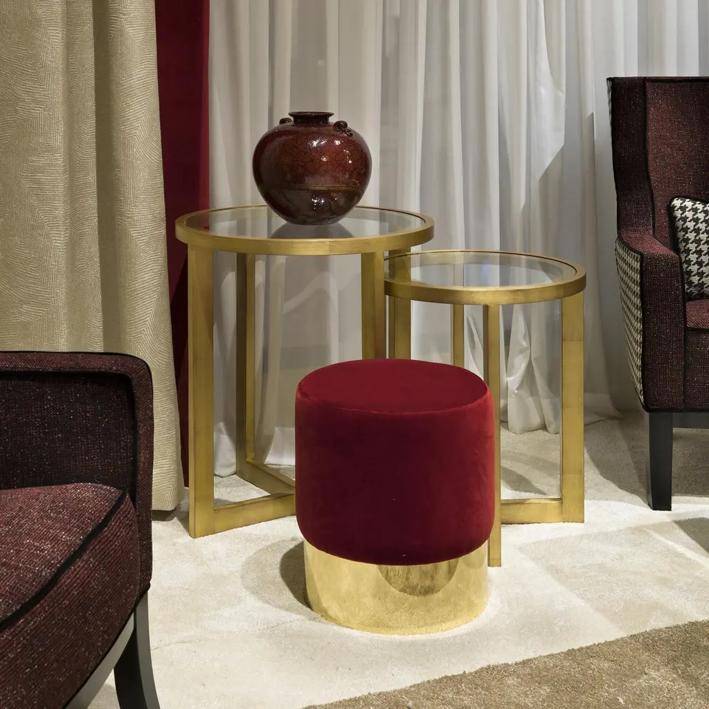 A piece that is sure to make a statement in a Classic or modern decor, this pouf is also a versatile object of functional decor that can be used as elegant stool in an entryway or extra seating in a living room. The cylindrical silhouette features a brass base, whose smooth surface and warm glow complements the velvet upholstery of the top and sides, with its luxurious red hue.