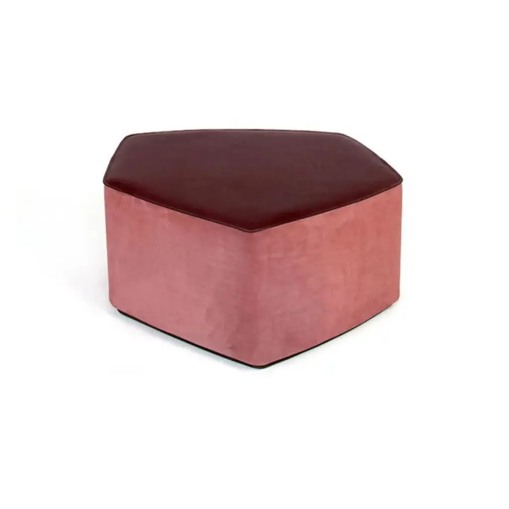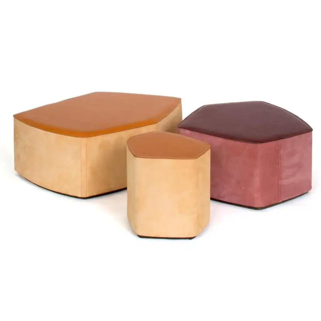 Medium Pouf in Vegetable Leather, Suede & Poplar Plywood by Oscar Maschera Dimensions: D 75,5 x W 83 x H 35 cm. Materials: Vegetable leather, suede, and poplar plywood. Our work is research: we give our fantasy free rein when experimenting and manipulating an object in leather. The researcher proceeds and invents. Given a road, it goes all the way along it, back and forth, and then begins to visit its surroundings. It is the same for us. We explore the leather: creating corners, cutting edges, and joining the parts. Every object is an invention, because it is a stage in the research, and never the endpoint of the production. Like footprints in the sand, our objects represent a story made up of different chapters. Every element of this story, every collection, has its own independent life. Foglia Couture, Caballito Blanco, Miroirs et Tapis, Bombo, Stecco, Isole, Pouf!, Caballito Blanco#Blanco. Every name in this sequence is a step, a track, a memory. But what better expresses the idea of our project is the whole set of collections, the direction that they all take as one, like a slipstream along the coast. Inventing as a job is first and foremost a pleasure. Combining the materials, folding the lines, choosing the colours, modelling, and constructing. And above all, simplifying, letting the objects be free to invent a new space, observing how they come to modify what they are next to: a room, a place, the everyday routine. Imagination creates a horizon. The designs are sensed in an ideal world. The next step, the one that allows you to see the images composed in the objects, is the heart of our work. Experience concretizes what is initially imagined, and all our production represents this operation.