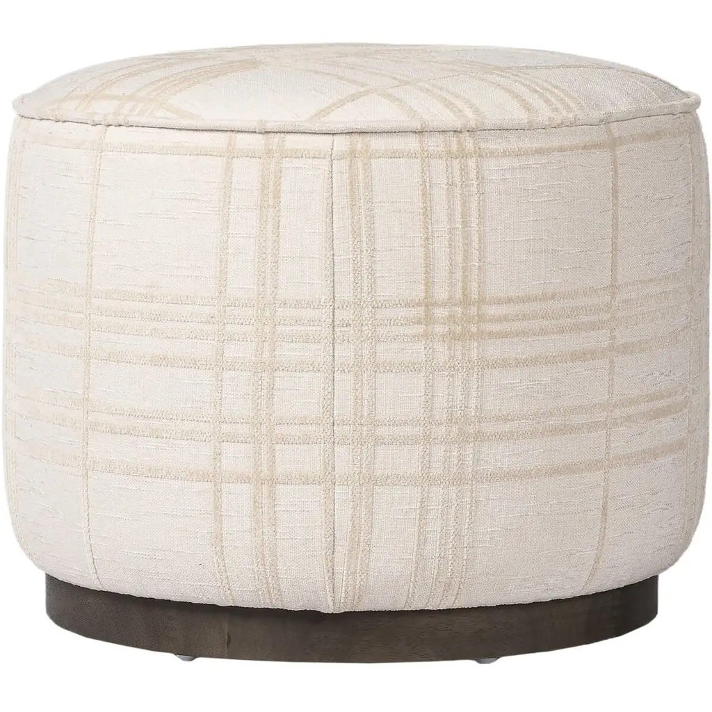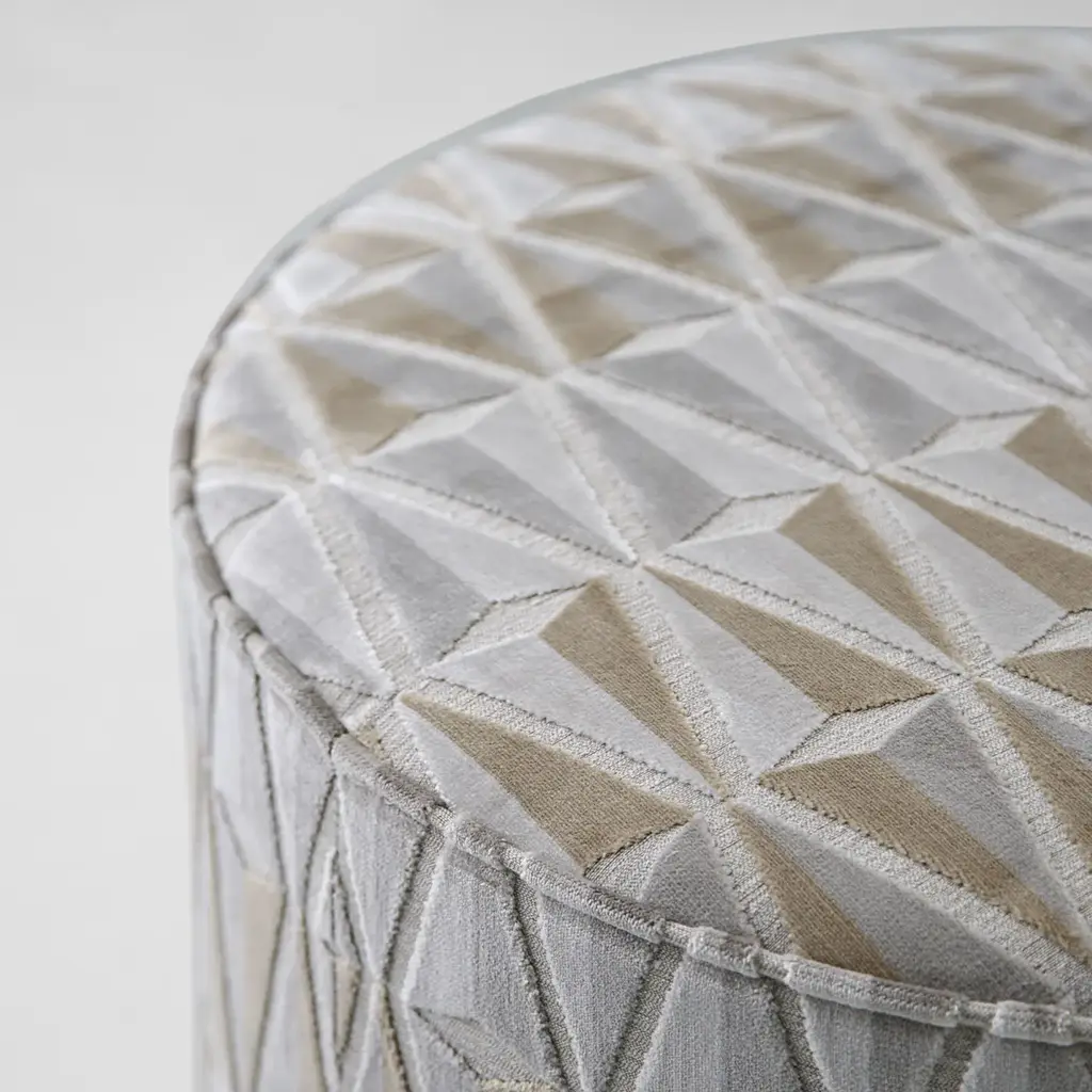 An extensive geometric-inspired motif lends this pouf's fabric cover a striking visual and tactile appeal. Coupled with a sturdy beech plinth base embellished with a patinated bronze finish, the inner core is crafted of limewood and generously stuffed with foam padding lined with thermo-regulated fiber and sealed by elastic belts. A refined addition to neutral-toned modern decors.