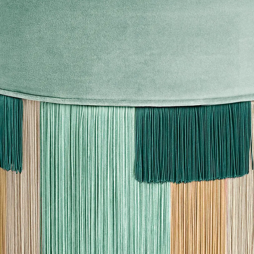 This neat pouf is entirely made in Italy and built with top-notch materials. Its top has comfortable synthetical padding and mint upholstering while, the base, is in painted beech wood. This pouf is characterized by an order of fringes of multiple colors and lengths which constitutes an amazing multilevel pattern. Each bespoke piece is stamped on the bottom of the pouf’s lining and personally signed, numbered, and dated by designer.