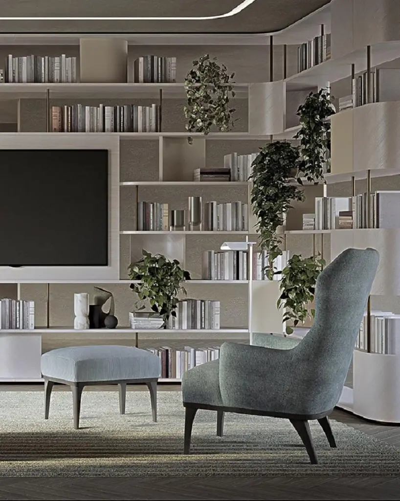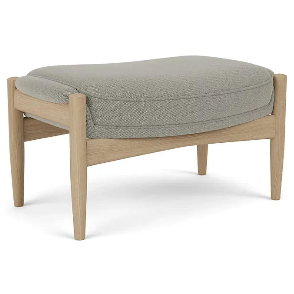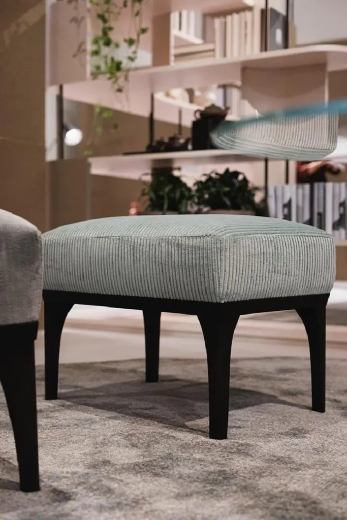 Pouf combined with the Relax armchair, internal wooden structure, polyurethane padding in different densities, solid wood feet in dark Tay shade, also available in Canaletta walnut. Upholstery available in various fabrics, leather and Nabuk.