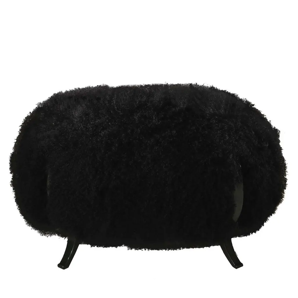 Part of a series of poufs that are strikingly unique and elegant object of functional decor, this pouf is a superb addition to a modern or rustic home. It can double as a bench to add extra seats to any room in the house or be a comfortable footrest to prop in front of an armchair or sofa. Its structure is in bronze with curved feet in a dark finish that matches the black color of the Mongolia fur that luxuriously upholsters the plush pillow. Other available colors are white and brown. Designed by Carlo Rampazzi.