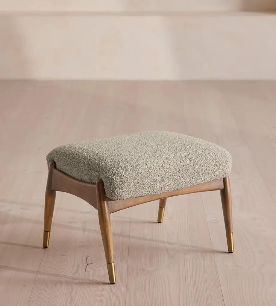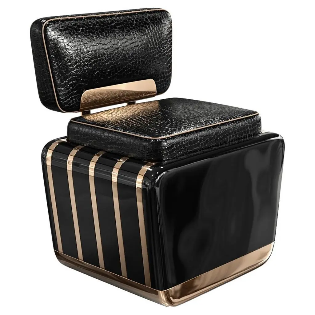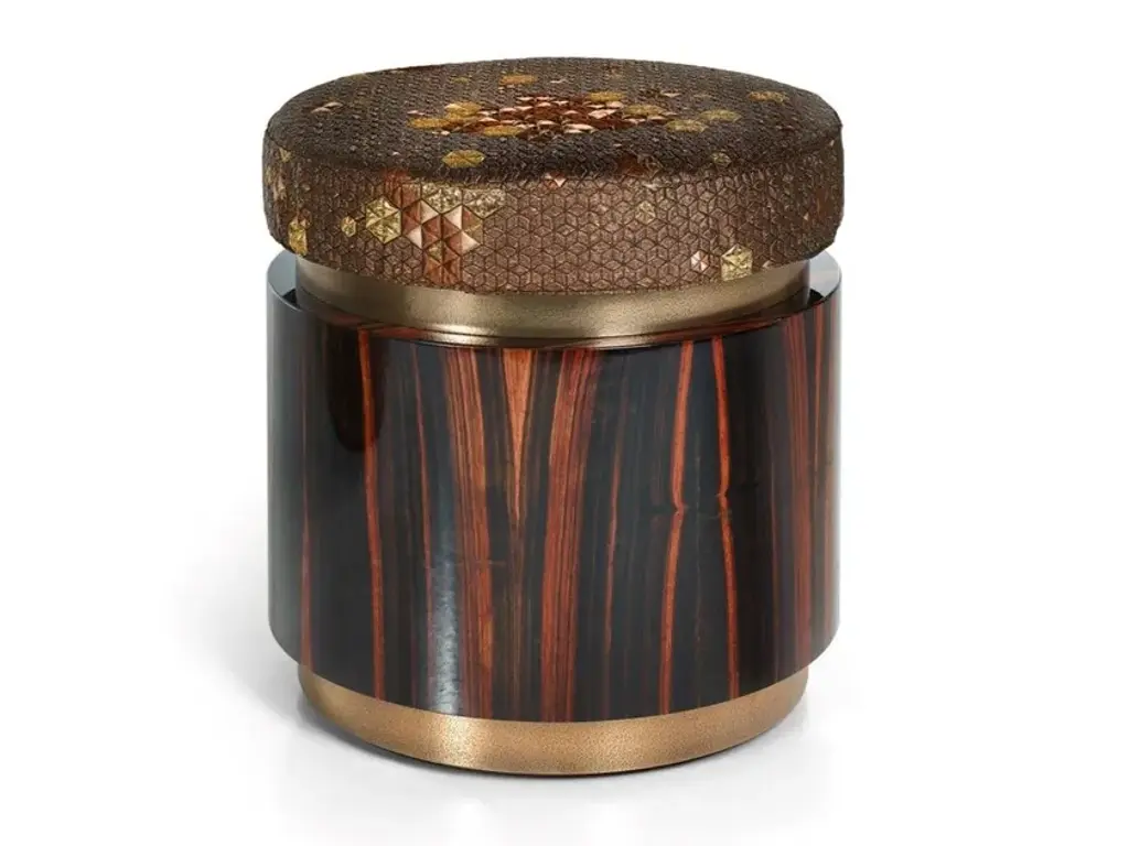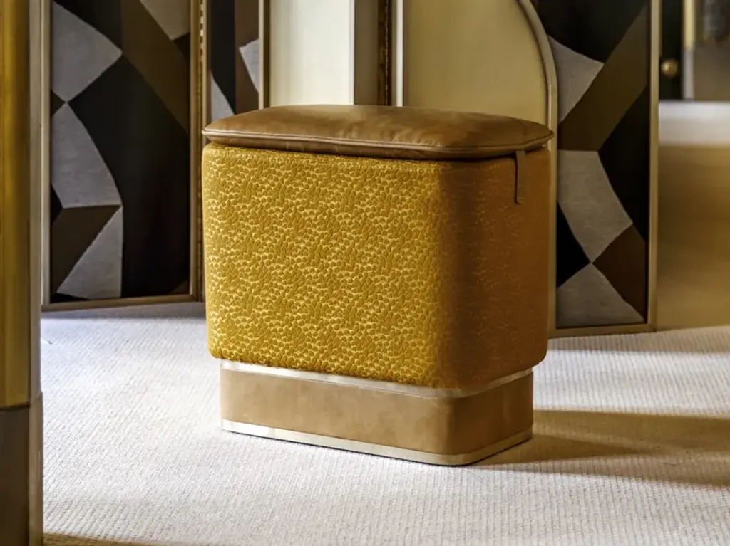 Montpensier footstools are independent and audacious, they can’t sit still and often end up dotted around the room so they can meet up later around the sofa.Available in rectangular or round versions, these improvised seats play on their superposition of leather and Ecaille de Chine fabric with its delicate textures that catch the light.Solid wood structure. Brass strapping. Cushion upholstered in leather or fabric.Exists in two versions:Leather and Lelièvre Paris Nugget Chinese tortoises hell fabric.Leather and Lelièvre Paris fabric Katmandou.PREMIERACTE is the reflection of a French-style art of living, showcasing strong savoir-faire and ‘Couture’ detailing. Planned as a set for a luxurious suite, the furniture creations, designed on the principle of an all-enveloping double skin, invite relaxation and immerse us in exclusive universe. PREMIERACTE is designed by Atelier Tristan Auer, Wilson Associates, produced and edited by Red Edition and set-dressed by Lelièvre Paris