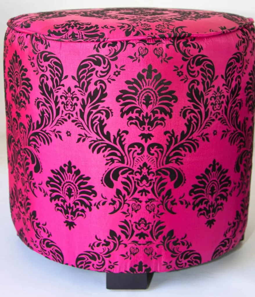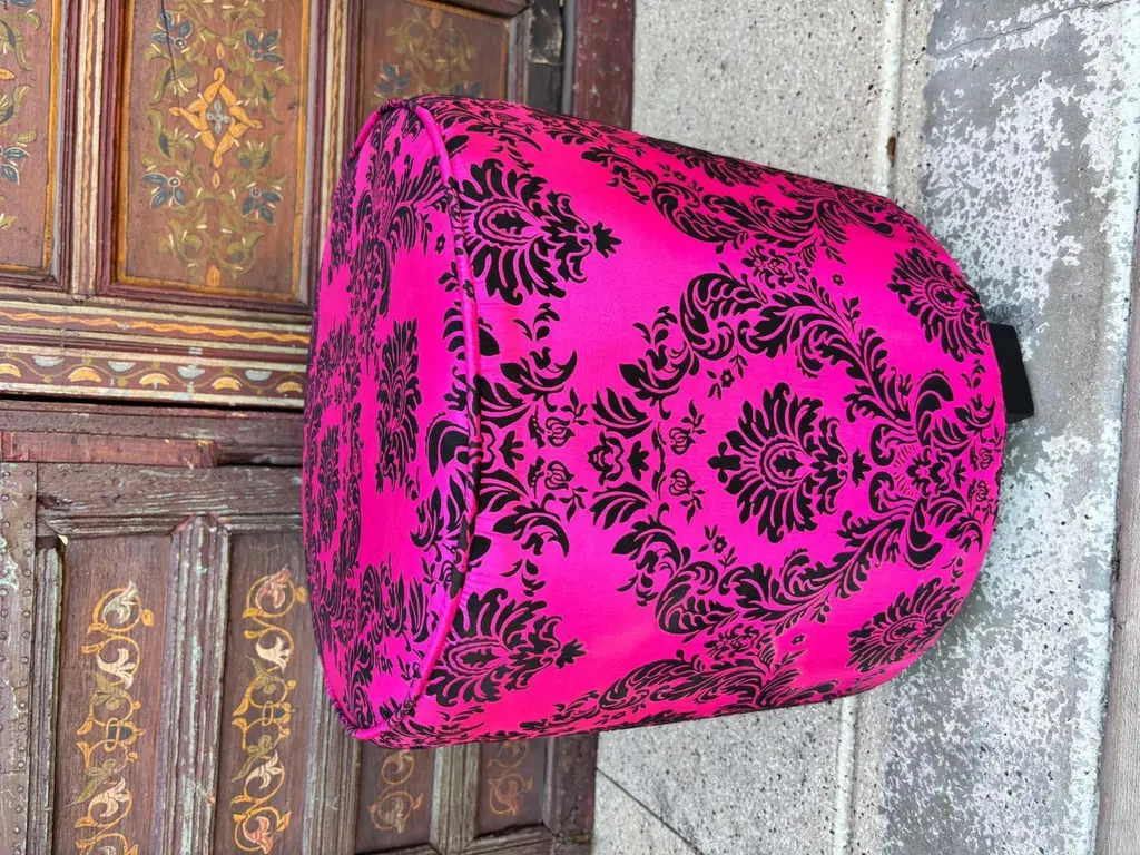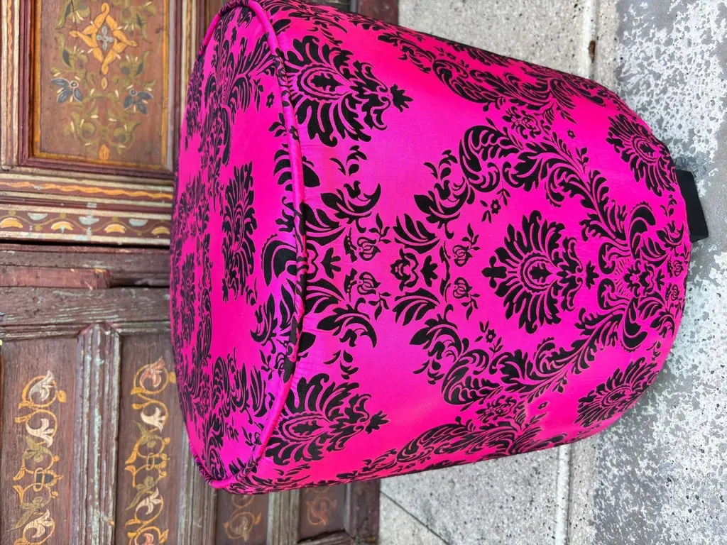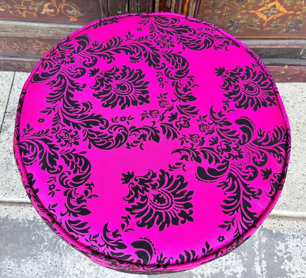 1960s Moroccan Art Deco Style Fuchsia and Black Velvet Pouf Ottoman Boho Chic Vanity StoolA bold and glamorous Moroccan round ottoman or vanity stool in vivid fuchsia pink with black velvet damask upholstery, featuring a raised floral taffeta texture. This striking piece channels both 1960s hippie chic and Hollywood Regency glamour, making it a perfect statement accent for eclectic and bohemian-inspired interiors.Lightweight and versatile, this pouf hassock can serve as an upholstered footstool, vanity seat, or even a stylish pull-up side table. Its compact form makes it ideal for use in designer living rooms, party settings, or children’s rooms, where its vibrant color and portability shine.Crafted in the Art Deco revival style with a Moroccan twist, the piece evokes the luxurious spirit of Maison Jansen and the playful elegance of Jean Royère designs.Dimensions: Available upon request.Condition: Vintage, with wear consistent with age and use.Multiple poufs available—perfect for collectors, decorators, and those seeking boho-chic Moroccan accents to elevate their space.Measures: Size is 18 inches diameter x 18 inches height. The weight 10 lbs.