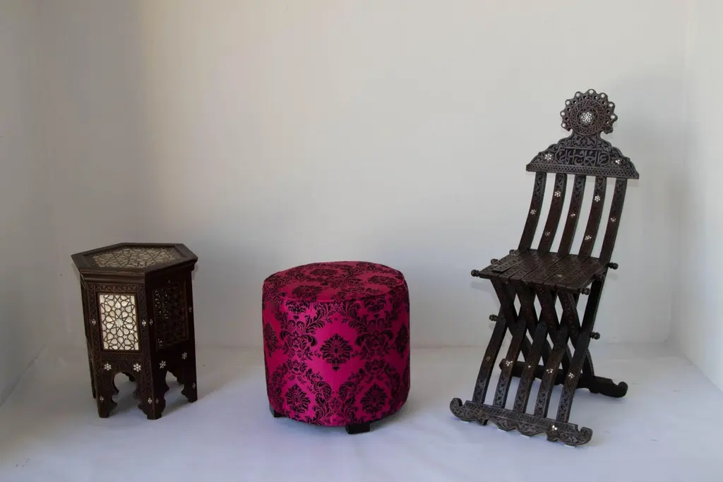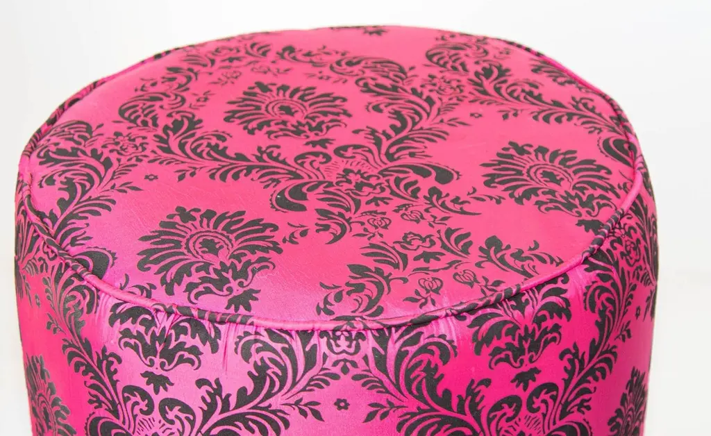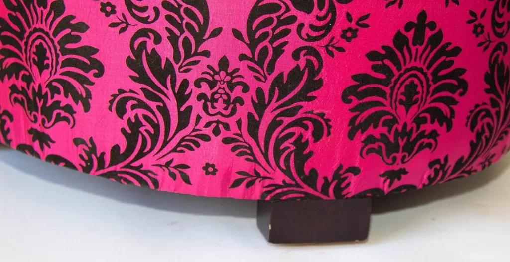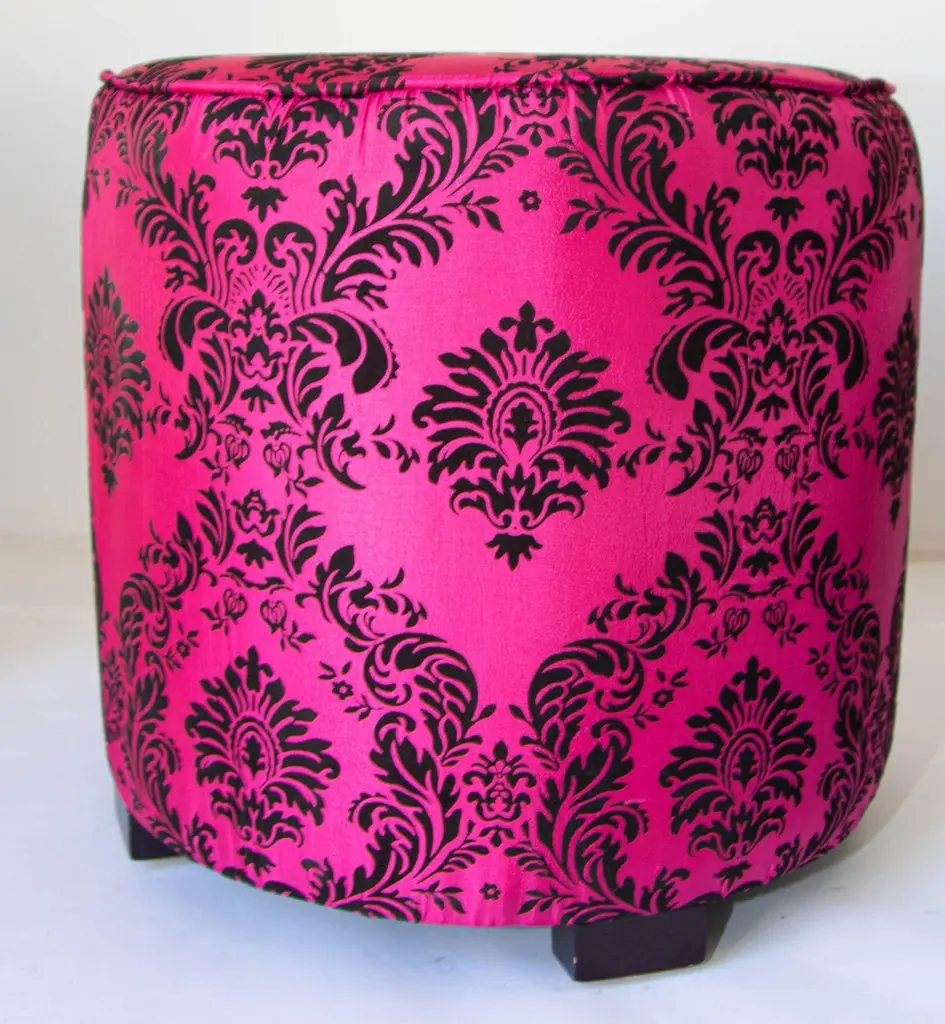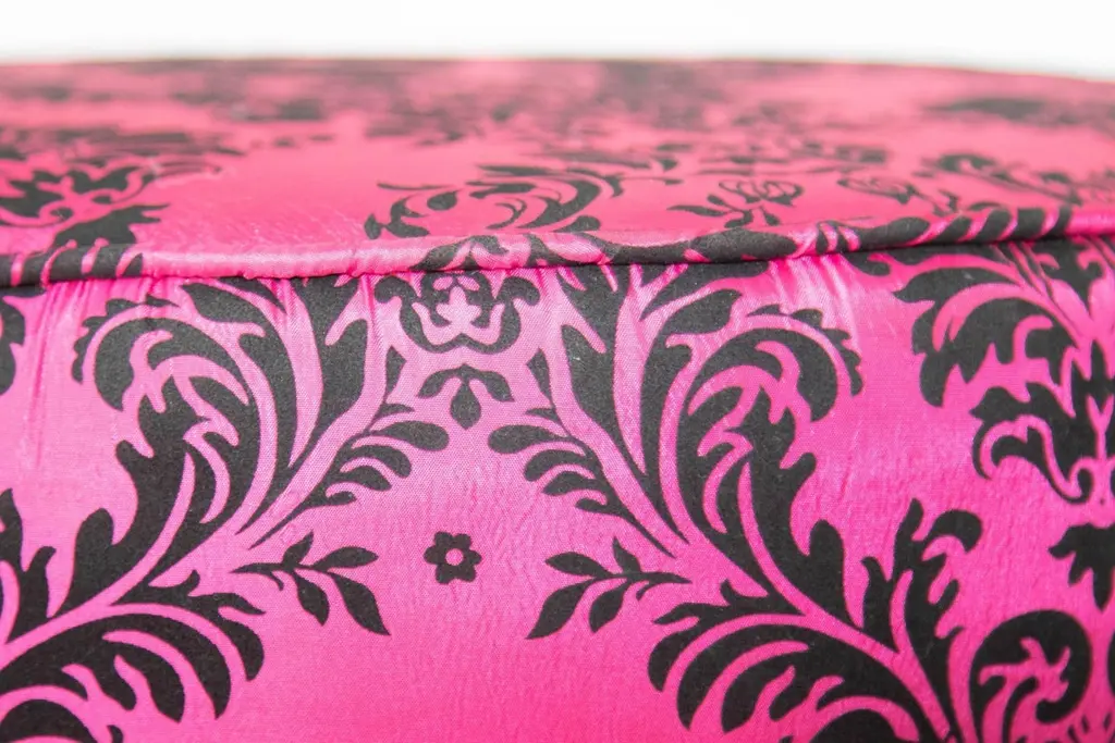 1960s Moroccan Art Deco Style Fuchsia and Black Velvet Pouf Ottoman Boho Chic Vanity StoolA bold and glamorous Moroccan round ottoman or vanity stool in vivid fuchsia pink with black velvet damask upholstery, featuring a raised floral taffeta texture. This striking piece channels both 1960s hippie chic and Hollywood Regency glamour, making it a perfect statement accent for eclectic and bohemian-inspired interiors.Lightweight and versatile, this pouf hassock can serve as an upholstered footstool, vanity seat, or even a stylish pull-up side table. Its compact form makes it ideal for use in designer living rooms, party settings, or children’s rooms, where its vibrant color and portability shine.Crafted in the Art Deco revival style with a Moroccan twist, the piece evokes the luxurious spirit of Maison Jansen and the playful elegance of Jean Royère designs.Dimensions: Available upon request.Condition: Vintage, with wear consistent with age and use.Multiple poufs available—perfect for collectors, decorators, and those seeking boho-chic Moroccan accents to elevate their space.Measures: Size is 18 inches diameter x 18 inches height. The weight 10 lbs.