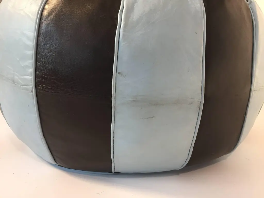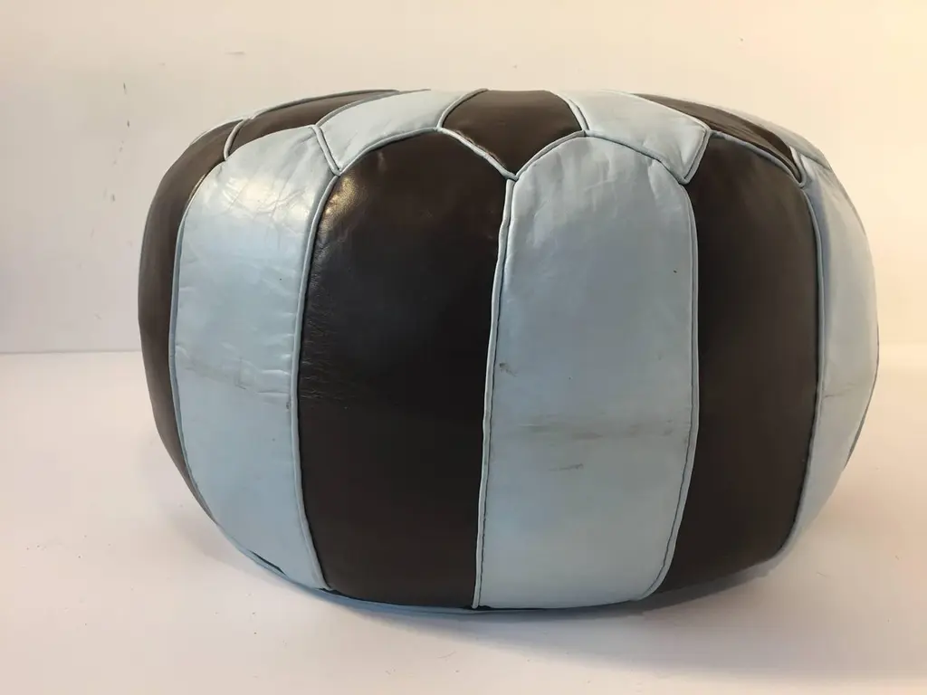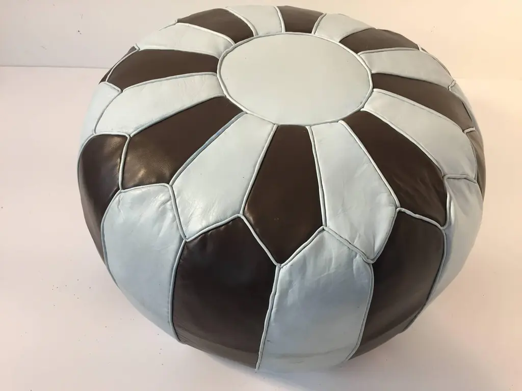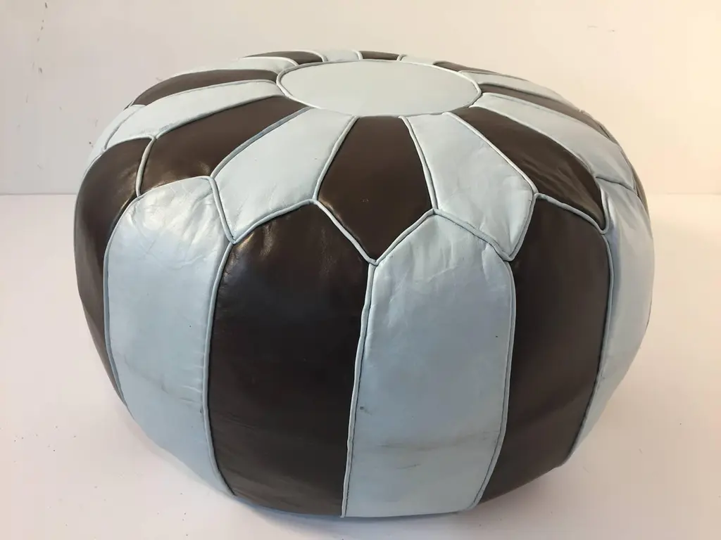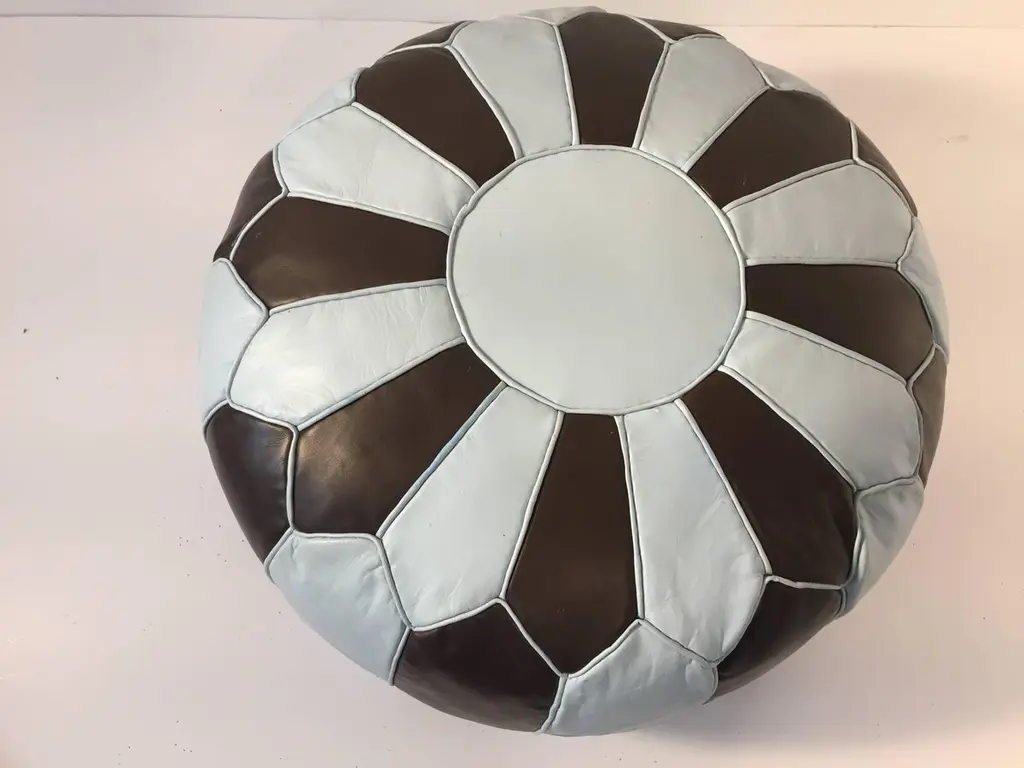 Moroccan blue and brown round leather pouf hand tooled in Marrakesh, Morocco. Handcrafted by skill Moroccan artisans.A pair is available, price is for one.Size is 21 in. diameter x 12 in. height.