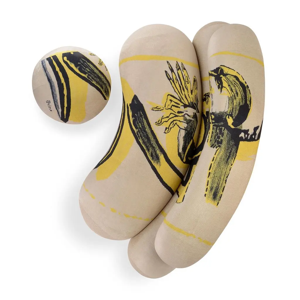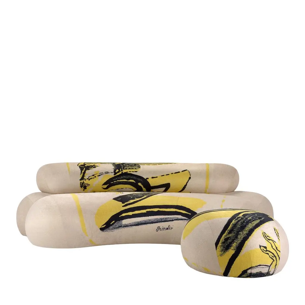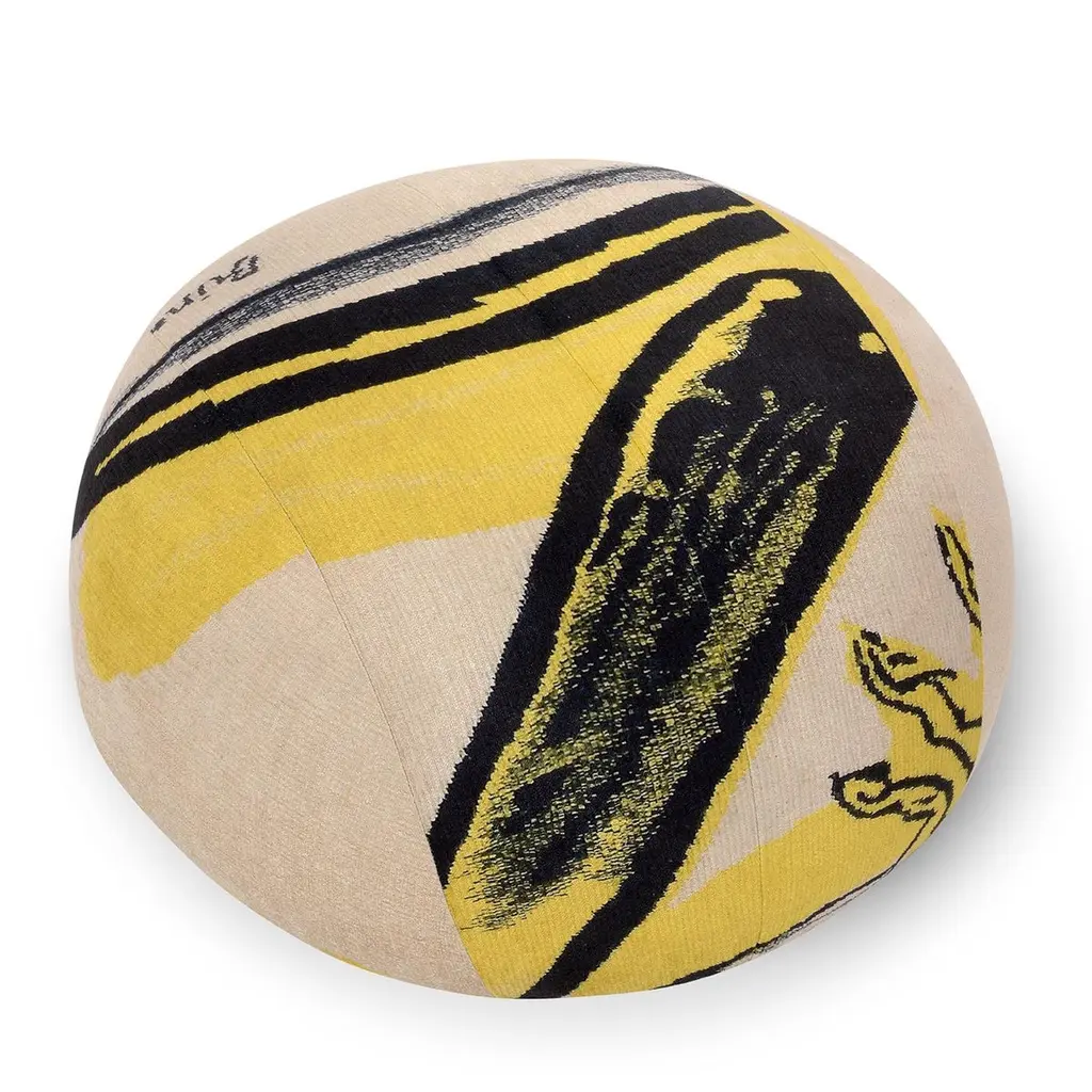 This unique piece, created exclusively for Edit Napoli 2024, is upholstered with the distinctive signs and colors of a one-of-a-kind tapestry by master Remo Brindisi. Made with variable-density, deformable polyurethane foam and a 100g Dacron® fiber layer, it covers a multi-layered wood frame with elastic straps. The pouf features hidden metal feet, offering a sleek and modern design. This fusion of craftsmanship and art creates a functional yet artistic piece.