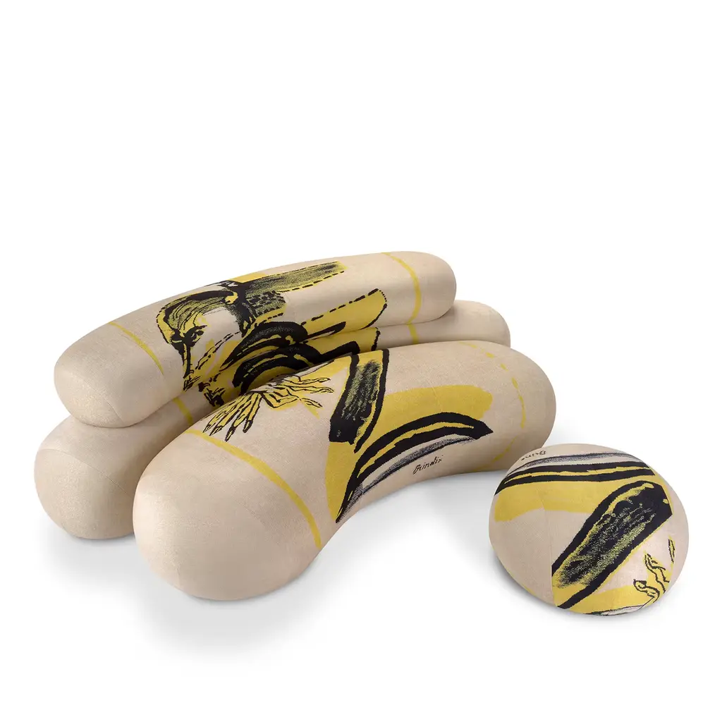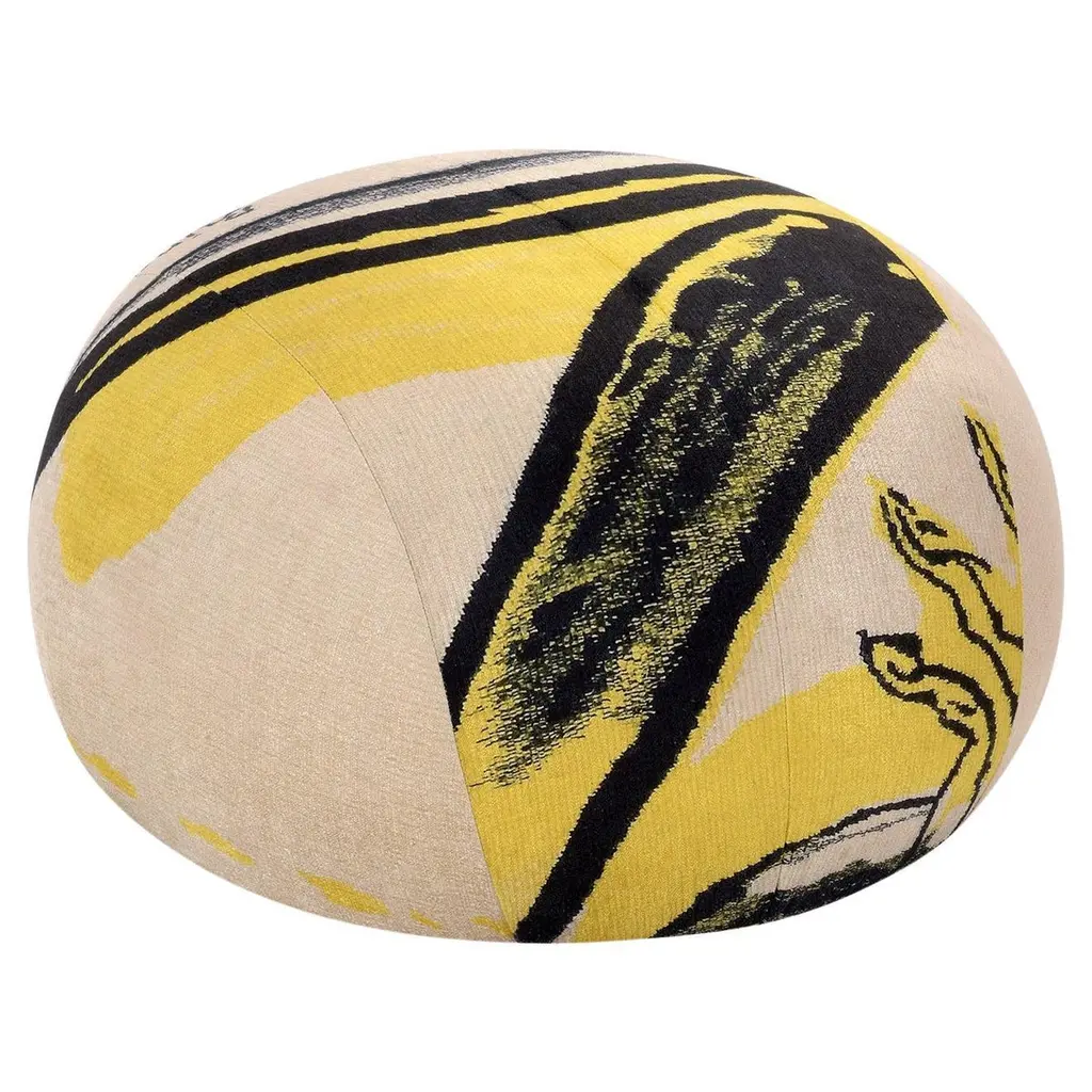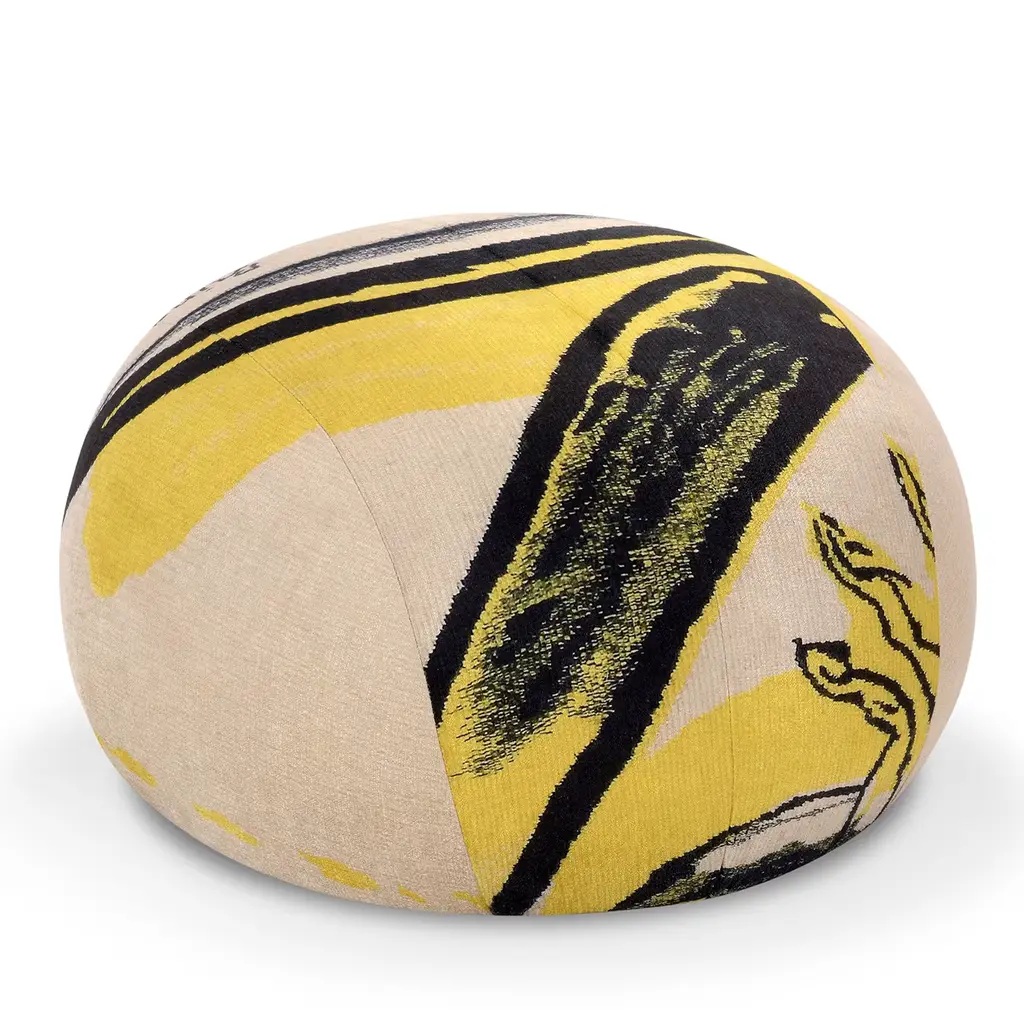 This unique piece, created exclusively for Edit Napoli 2024, is upholstered with the distinctive signs and colors of a one-of-a-kind tapestry by master Remo Brindisi. Made with variable-density, deformable polyurethane foam and a 100g Dacron® fiber layer, it covers a multi-layered wood frame with elastic straps. The pouf features hidden metal feet, offering a sleek and modern design. This fusion of craftsmanship and art creates a functional yet artistic piece.