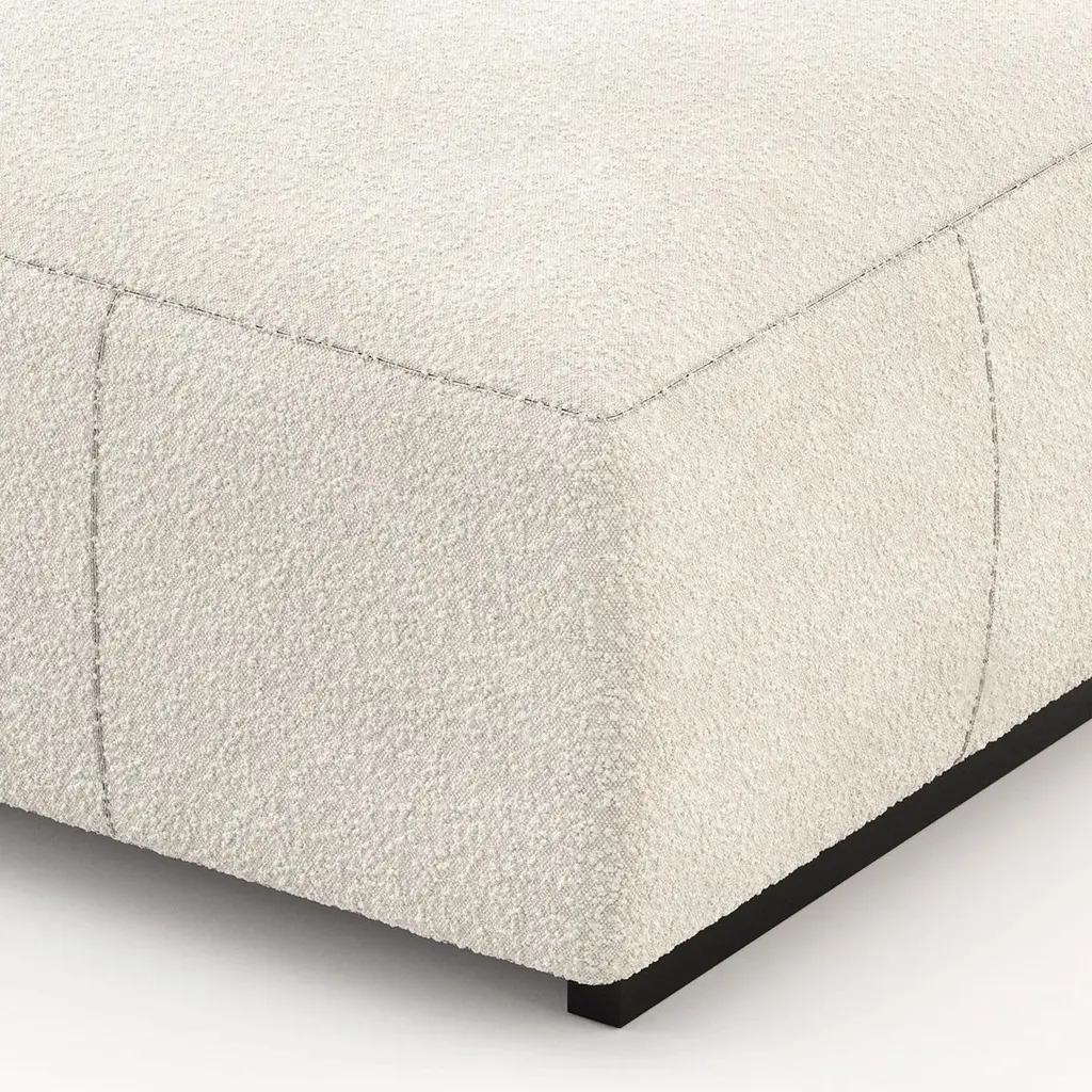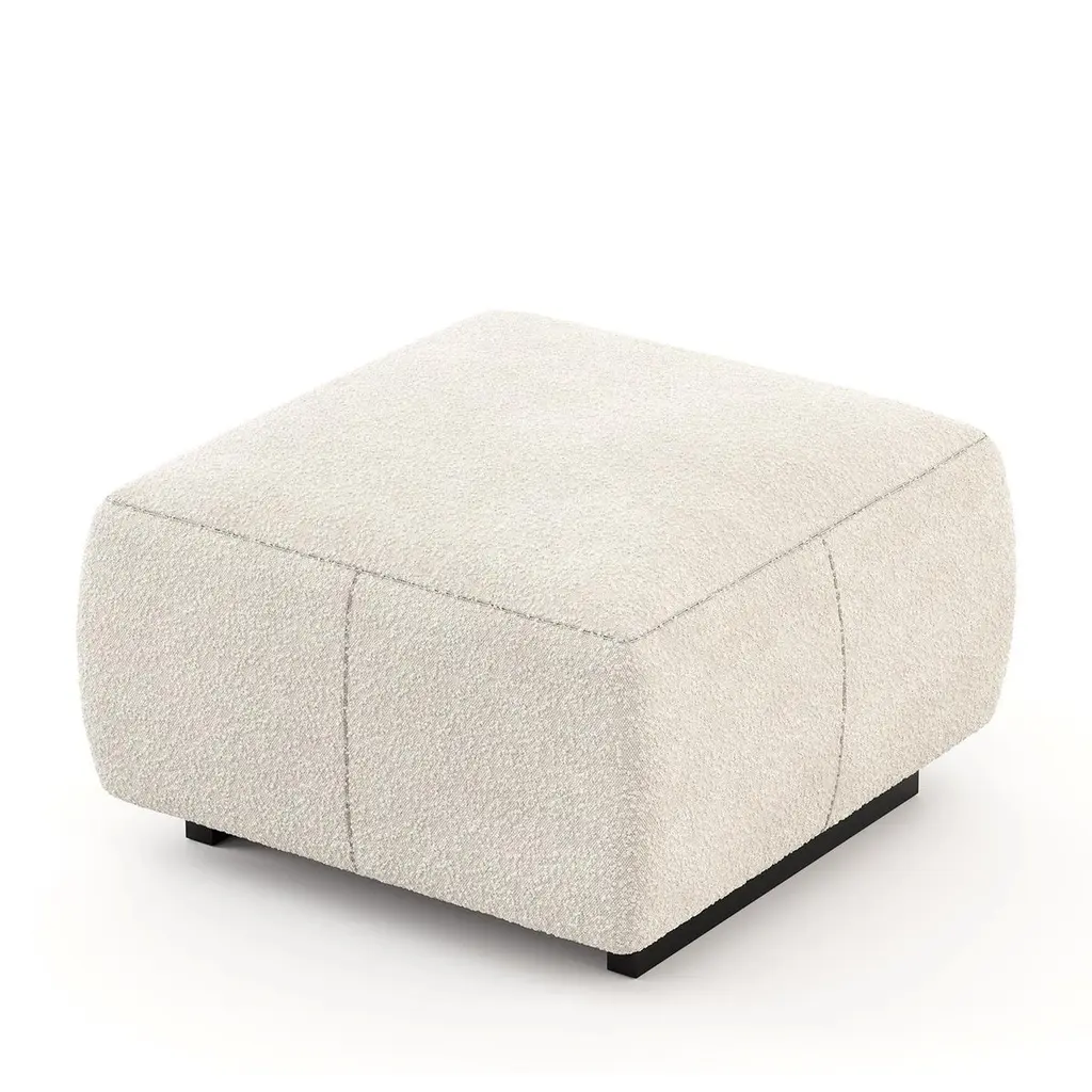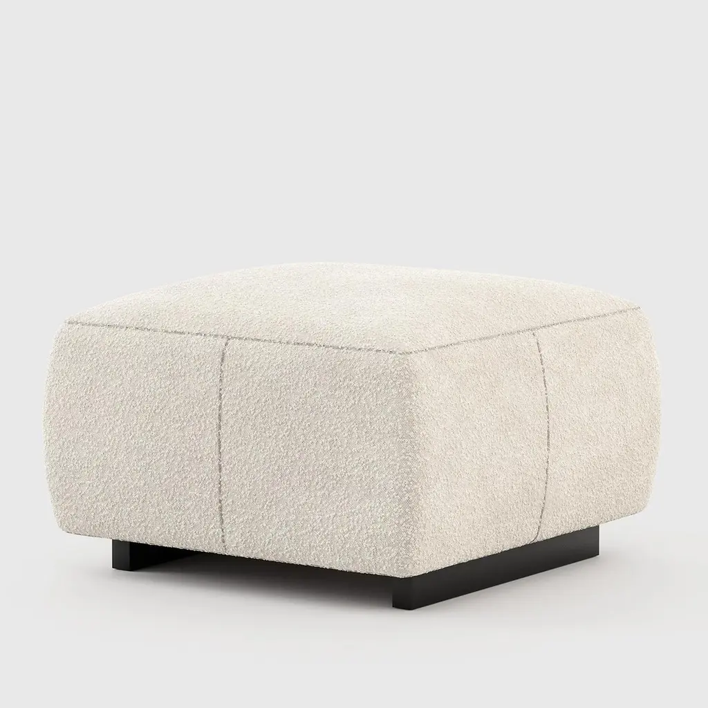 Pouf Nucci with wooden structure, upholstered andcoverd with white pearled fabric and with 2 feet basein blackened steel.Also available with other fabrics or leather, on request.
