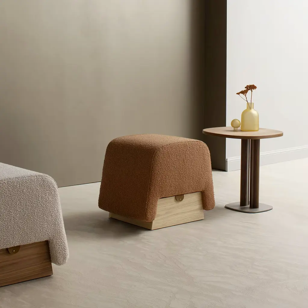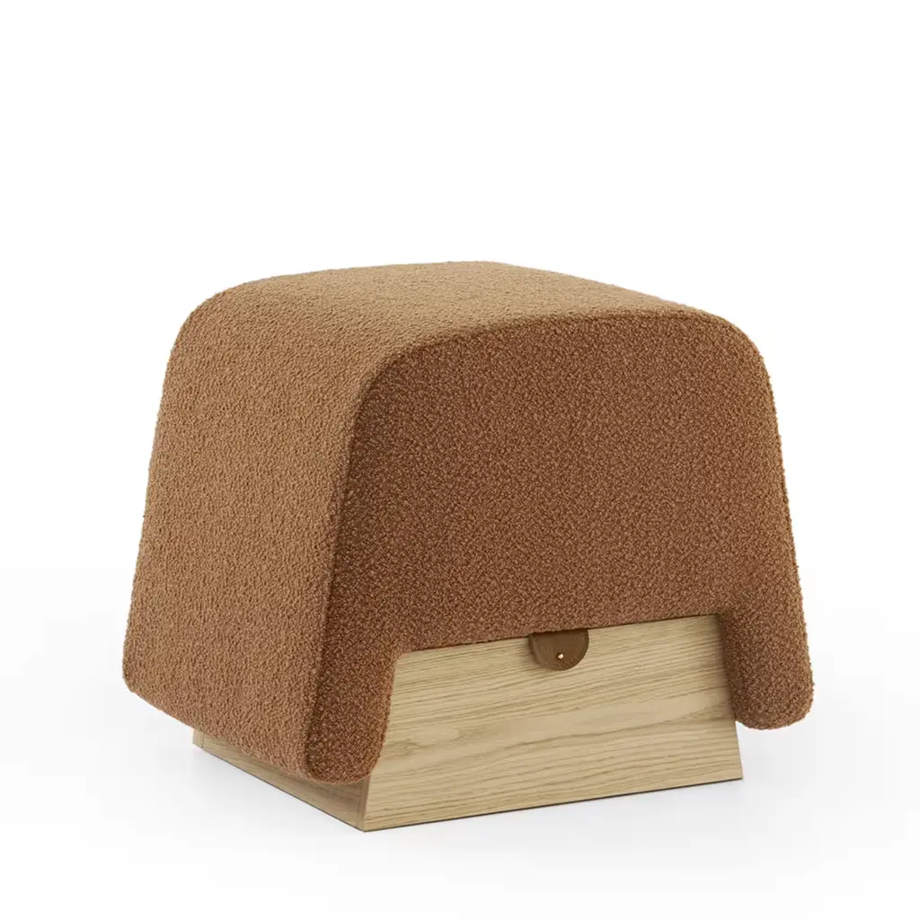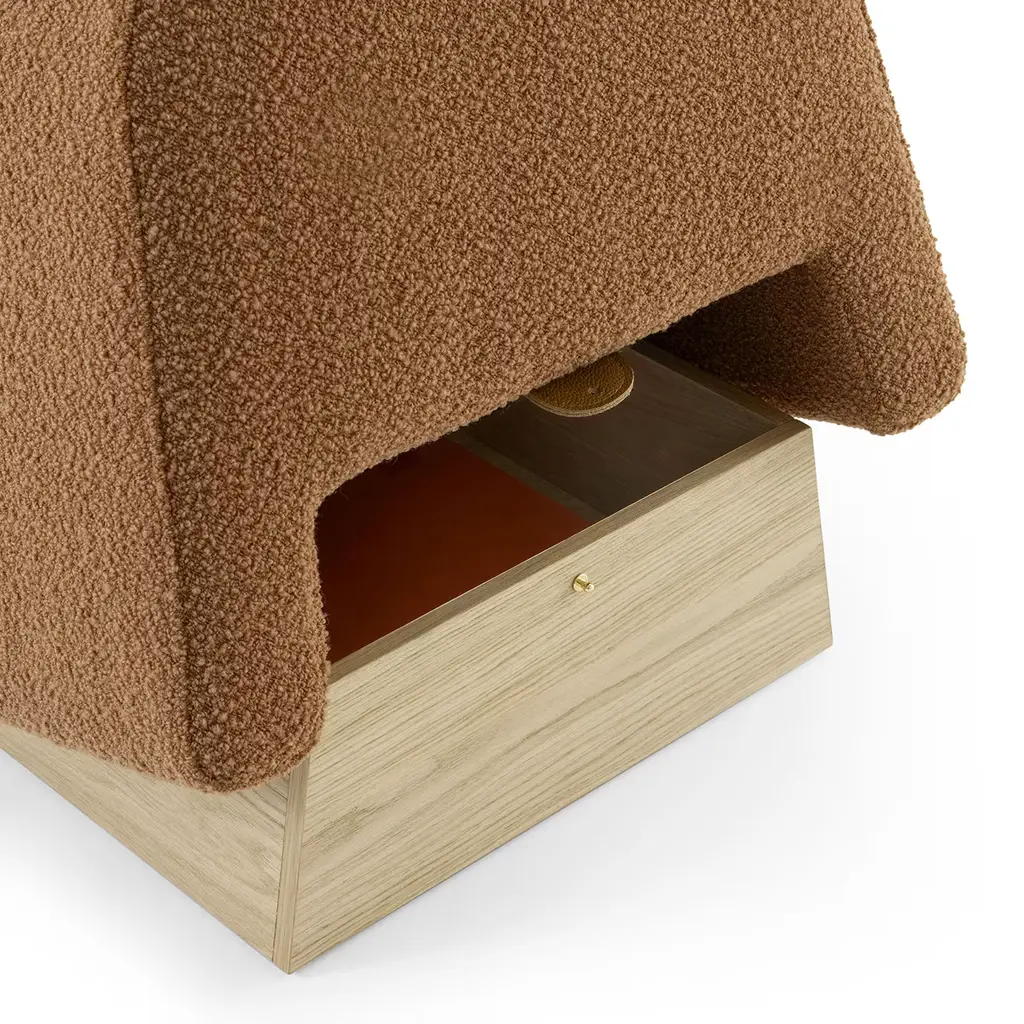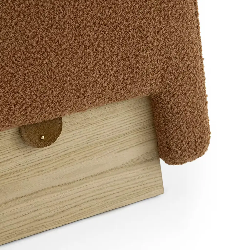 Crafted with attention to detail, this pouf features high-density rubber foam padding upholstered in luscious Caramel bouclé fabric. Accentuated by a chic Cognac leather strap closure, it boasts a practical storage compartment housed within a Natural Oak veneer MDF base. A testament to artisanal finesse and functional elegance, this piece adds a touch of sophistication to any living space, seamlessly blending luxury with practicality.