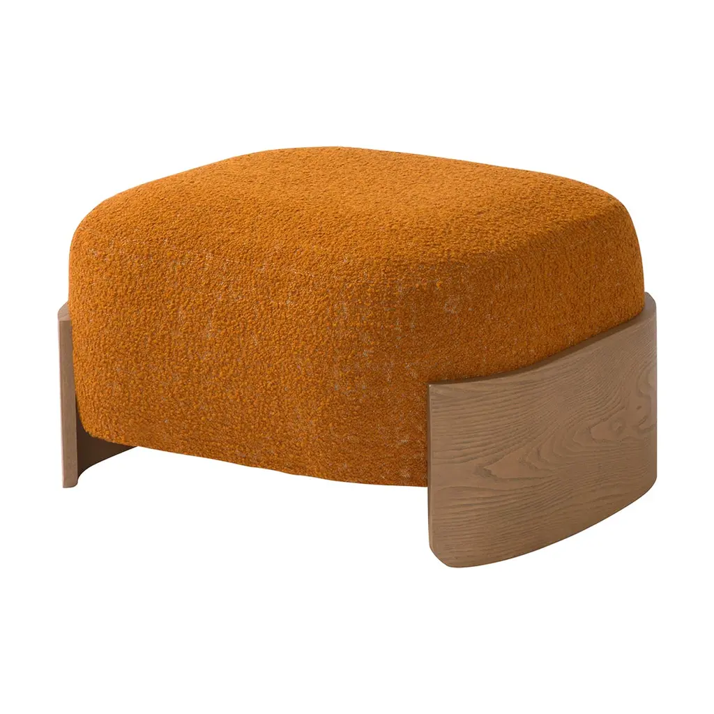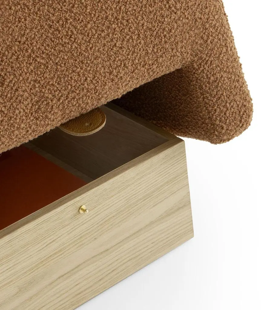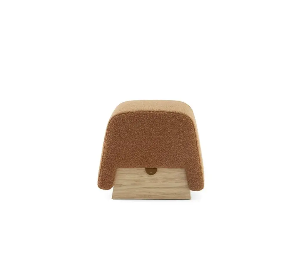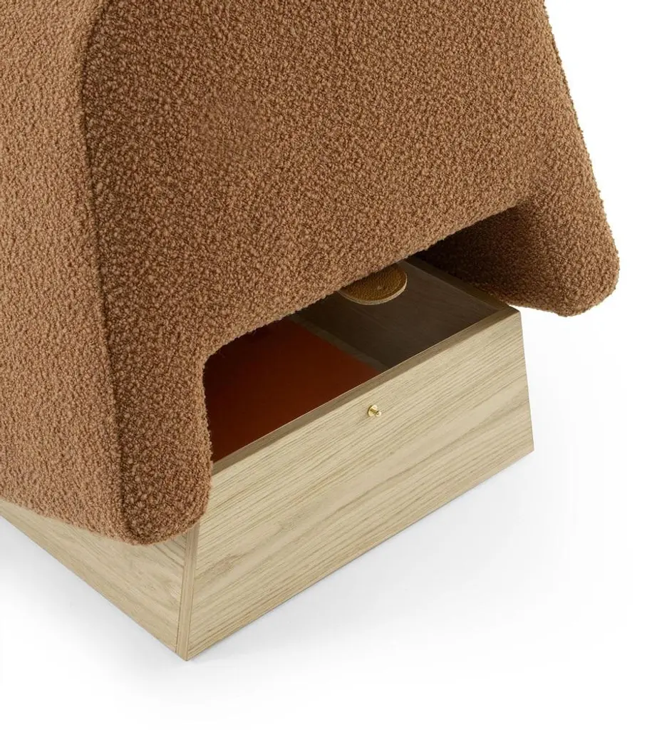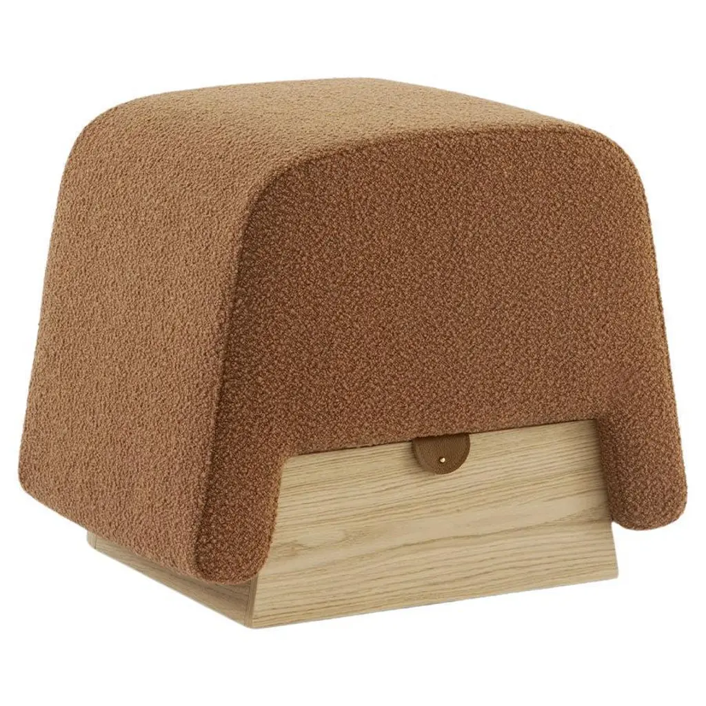 Onigiri pouf by morica design dimensions: d 40 x w 52 x h 43 cm. Materials: oak, caramello bouclé wool, cognac leather. Pouf with high-density rubber padding, upholstered in bouclé wool fabric, with a genuine leather closure handle. Storage compartment in mdf veneered real wood. The spark of an idea began with three brothers, moreno, riccardo, and carlo, and the desire to provide genuine