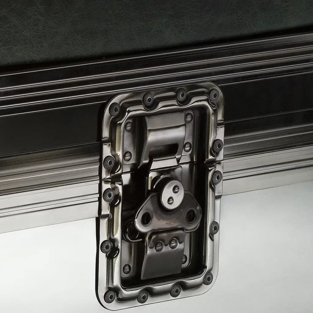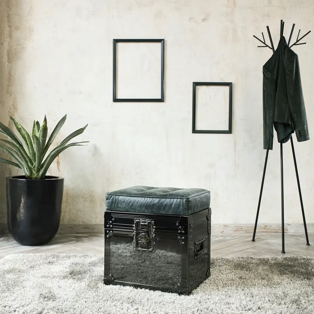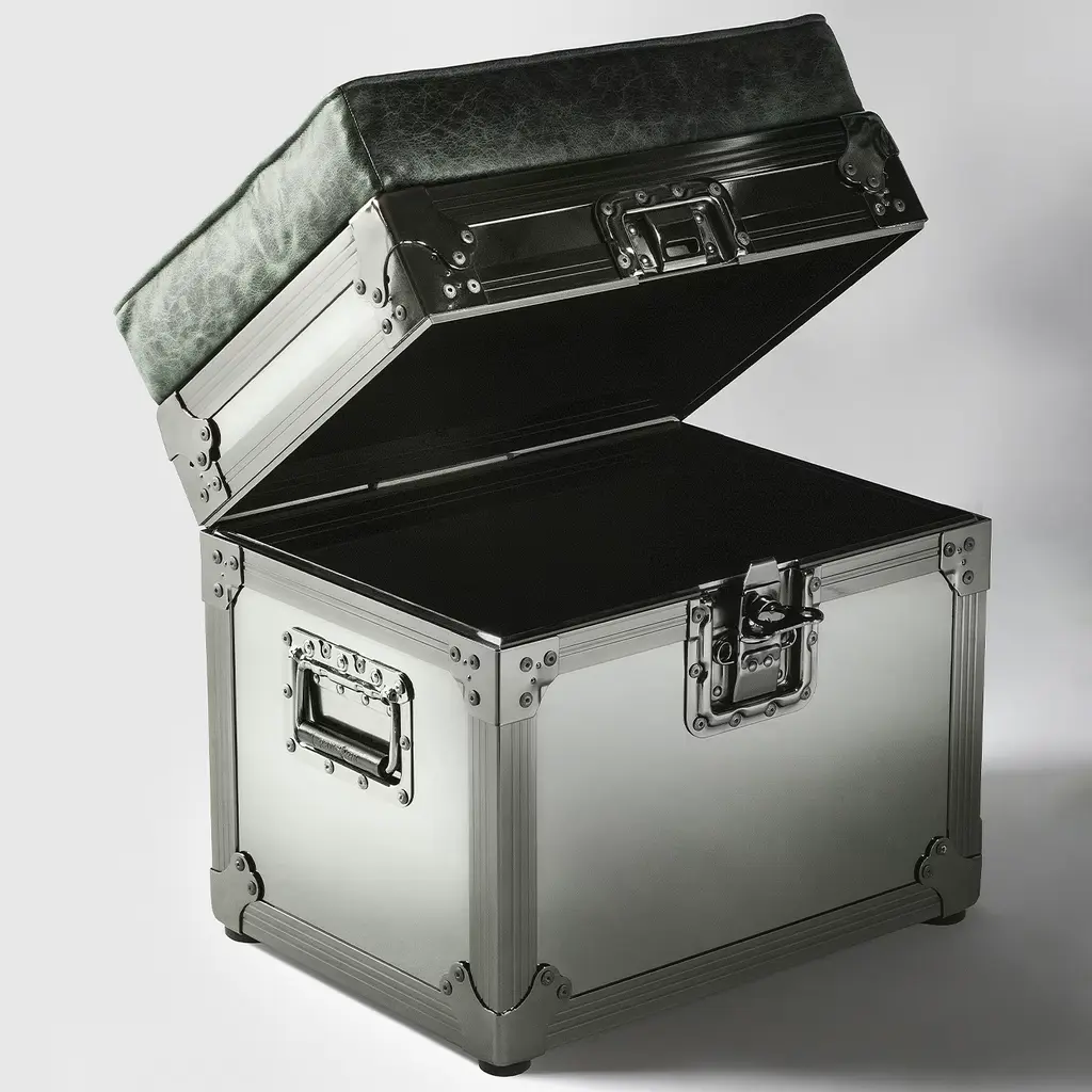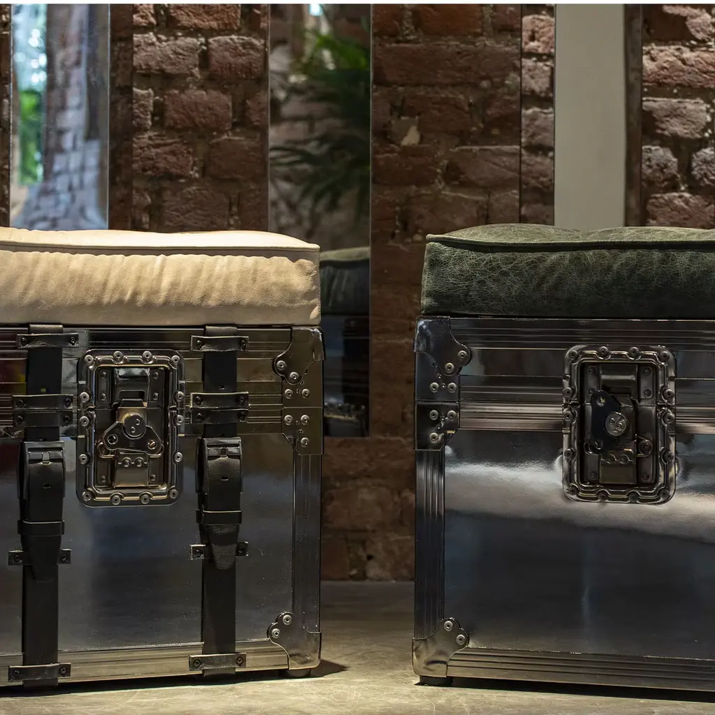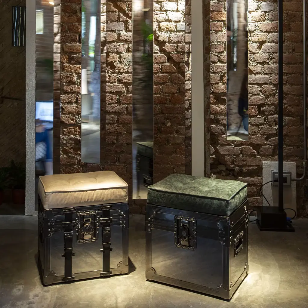 A pouf trunk, with a 90° opening for storage. The exterior has mirrors and chrome plating of the steel profiles. The seat is upholstered with leather, including the bottoms. The internal part is upholstered in leather.