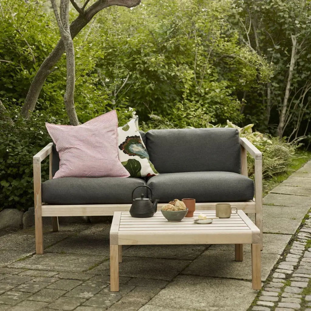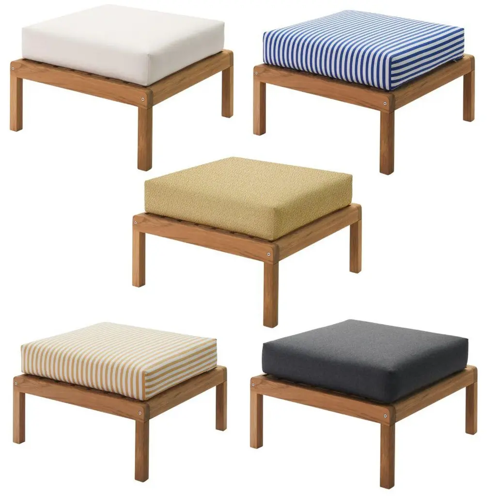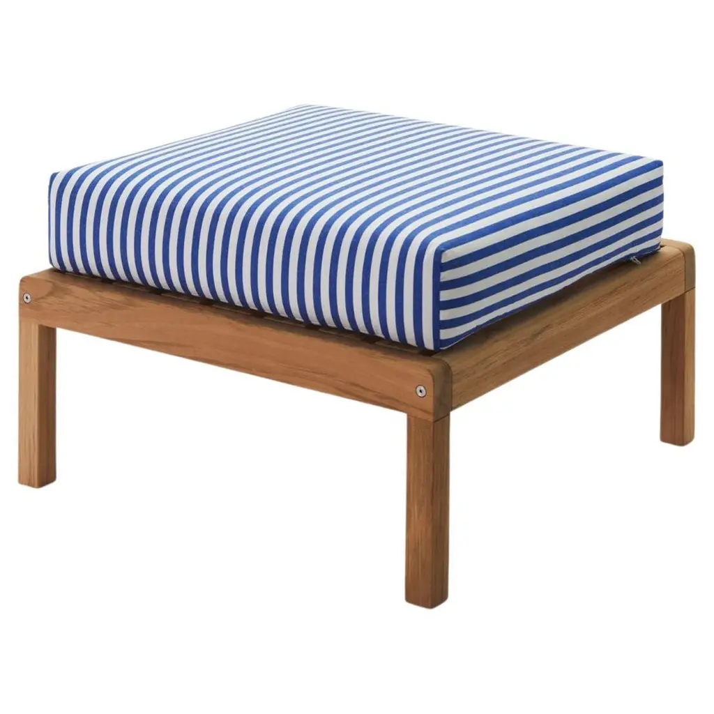 Outdoor 'Virkelyst' pouf in teak and ash fabric for SkagerakSkagerak was founded in 1976 by Jesper and Vibeke Panduro, who took inspiration from their love of Scandinavian design and its rich tradition. The brand emphasizes sustainability by using responsibly sourced materials and production methods that minimize waste and reduce environmental impact. Each piece of handcrafted furniture is designed to age with grace and last for generations.Virkelyst is a series of modern outdoor furniture with the seating comfort of indoor furniture. The simple wooden 100% FSC Certified Teak frame strikes a contrast with the thick, soft cushions. Able to withstand wind and weather, the upholstery fabrics are Oeko-Tex certified and extremely color and lightfast as well as water and dirt-repellent and even mildew-resistant. The cushion dries quickly even after heavy downpour, as the foam has an open-cell structure that allows both water and air to pass through. Fabricated to the exacting standards of Skagerak using the highest quality materials available.Price per item. Available to order in unlimited quantities with fabric colors of honey yellow, papyrus, ash, charcoal, white, golden yellow stripes and sea blue stripes. Also available as a chair, 2-seater or 3-seater sofa - please see our separate listings. This listing is for the 'Virkelyst' pouf with ash fabric.In stock lead time 2-3 weeks. Out of stock lead time can be an additional 3-4 weeks, or longer. Lead times and stock availability are subject to change at any time and without notice. Please inquire for current lead times prior to placing time sensitive orders.Made to order.All sales final.