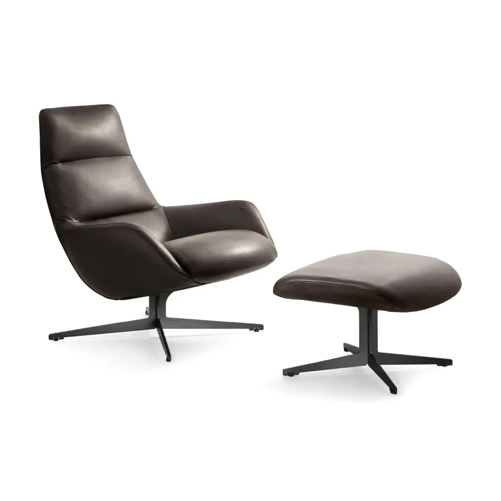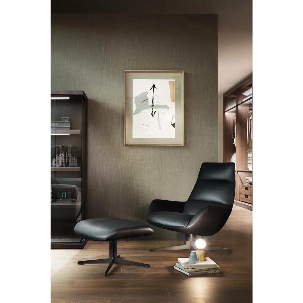 The Padded Pouf Ottoman by Lema is designed by Christophe Pillet, and the sophisticated Lady Jane Bergère features bold lines that are inspired by the 1950s. This versatile, elegant, and comfortable piece has a mechanism that allows the chair to rotate 360° and works perfectly in domestic spaces. To ensure maximum relaxation, the bergère has a matching padded pouf footrest with a bronze metal structure.