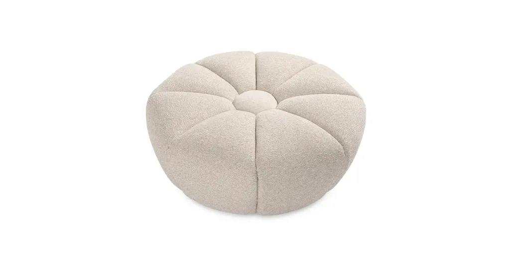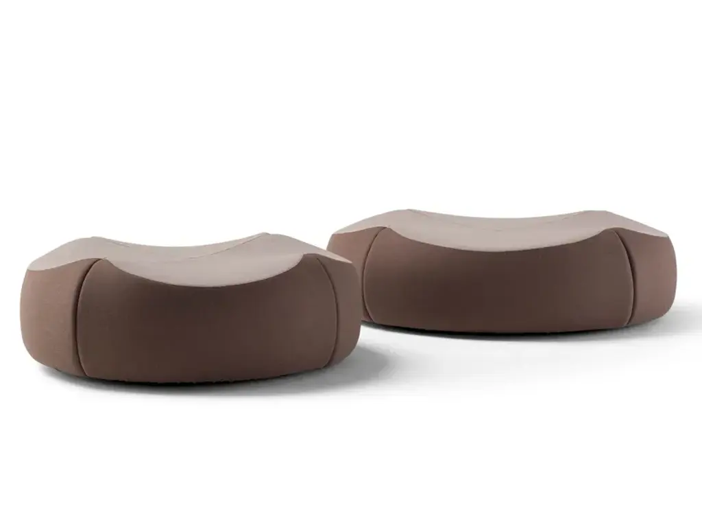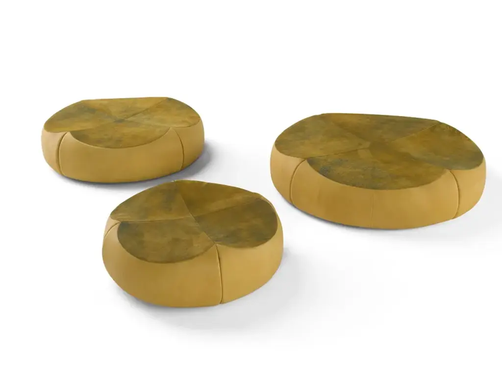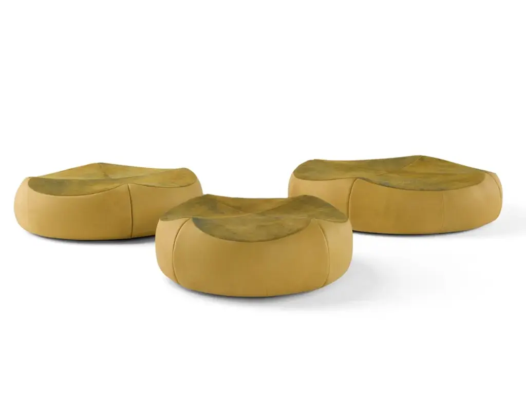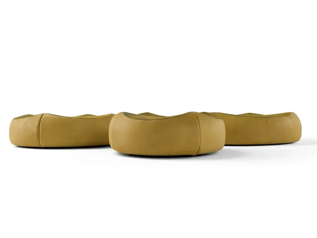 Panis is a round pouf available in leather or fabric.SEAT: polyurethane foam, density 35 kg/m0The iconic image of the large loafs, a veritable local cult, becomes thus the inspiration for a line of upholstery with generous, soft shapes that can be declined in all possible configurations. To tell more immediately the essence of the project are the cuts, which geometrize the enveloping shapes of the collection, to remember precisely the cuts made on the dough of the bread of Altamura and that, with leavening, determine the classic shape. The swift and essential lines, though never severe, that shape the entire collection create an evident link between design, nature and ancestral knowledge.