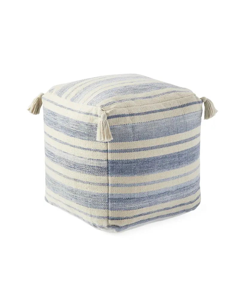 We always adore the simplicity of a good stripe. Beautifully handwoven from weather-friendly materials, this pouf is right at home on a deck or patio, but we also love it indoors. Oversized tassels adorn each corner for added texture and a bit of fun.