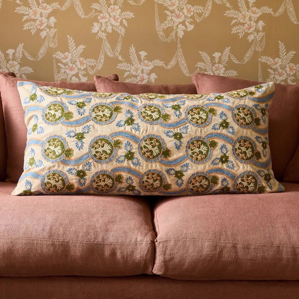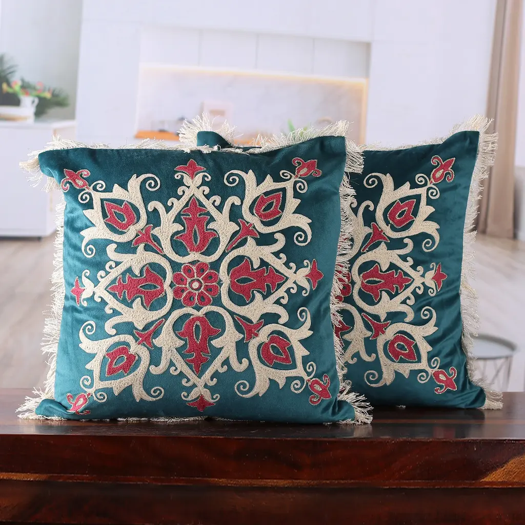 Imbued with an opulent flair, this sophisticated ottoman will make for an exquisite accent to a traditional, mid-century modern, or contemporary interior. Comprised of two square-shaped cushions with rounded edges enhanced with a red cordon on the profile, it is deftly handcrafted and upholstered with velvet and refined striped fabric, completed with lavish pompoms.