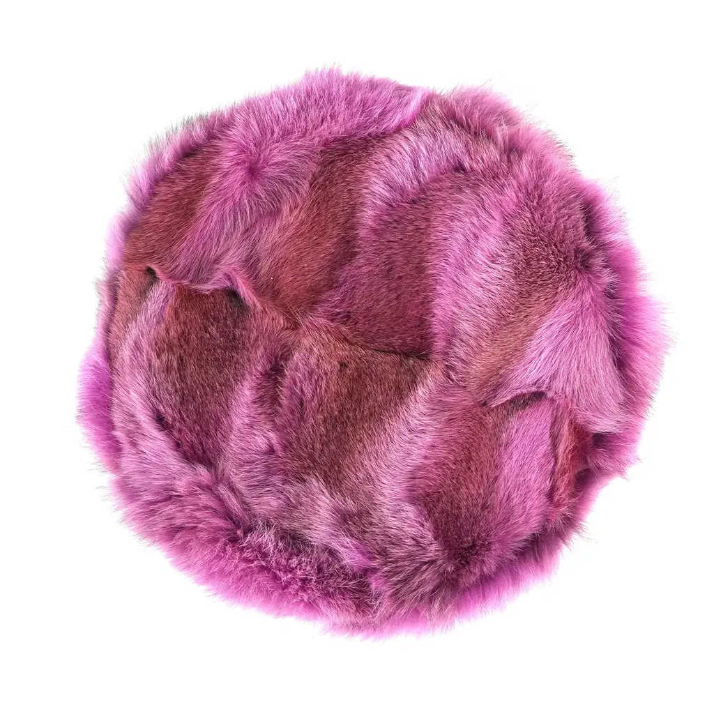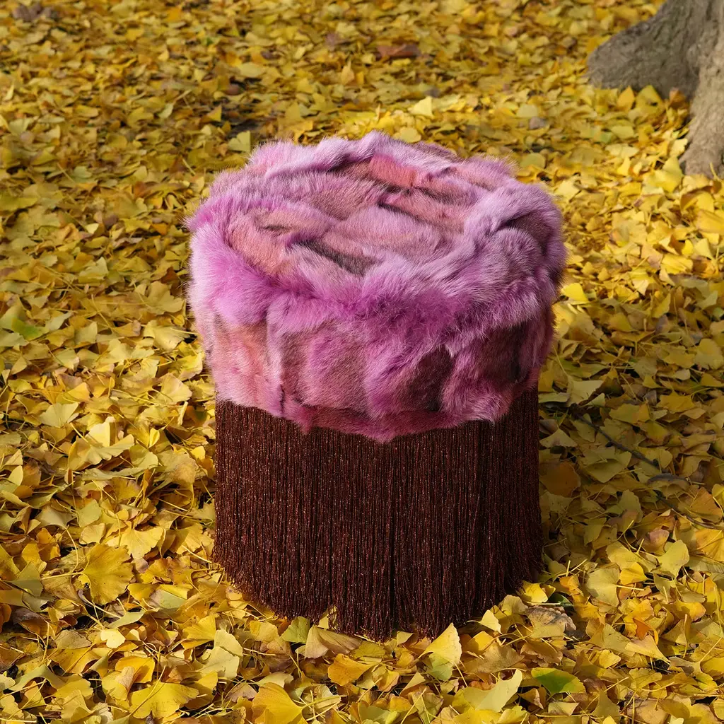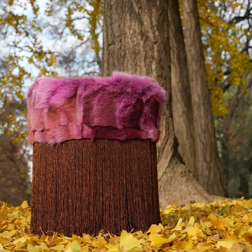 Lorenza Bozzoli Couture presents a limited-edition collection characterized by an extremely soft design, eclectic and distinctly retro. The new Fur Collection offers the Couture iconic pieces in a furry version with colours inspired by the seventies and sophisticated fur upholstery that emphasize the enveloping and smooth shapes for a cocoon effect. Pouf in patchwork of fuxia coyote fur, warm and soft, with brown lurex fringes. Structure and legs in beech wood. Limited edition of 10 pieces. Each bespoke piece is stamped on the bottom of the pouf’s lining and personally signed, numbered, and dated by designer.