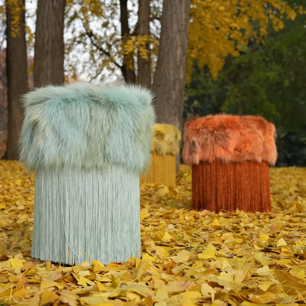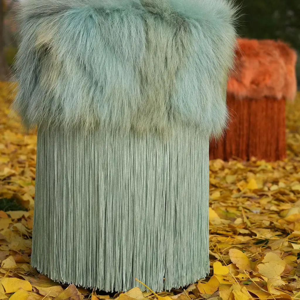 Lorenza Bozzoli Couture presents a limited-edition collection characterized by an extremely soft design, eclectic and distinctly retro. The new Fur Collection offers the Couture iconic pieces in a furry version with colours inspired by the seventies and sophisticated fur upholstery that emphasize the enveloping and smooth shapes for a cocoon effect. Pouf in patchwork of teal tiffany coyote fur, warm and soft, with teal tiffany fringes. Structure and legs in beech wood. Limited edition of 10 pieces. Each bespoke piece is stamped on the bottom of the pouf’s lining and personally signed, numbered, and dated by designer.
