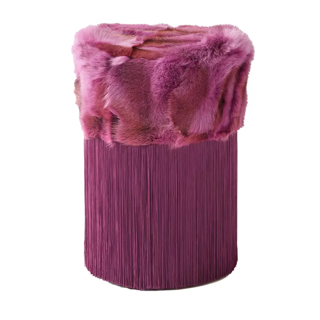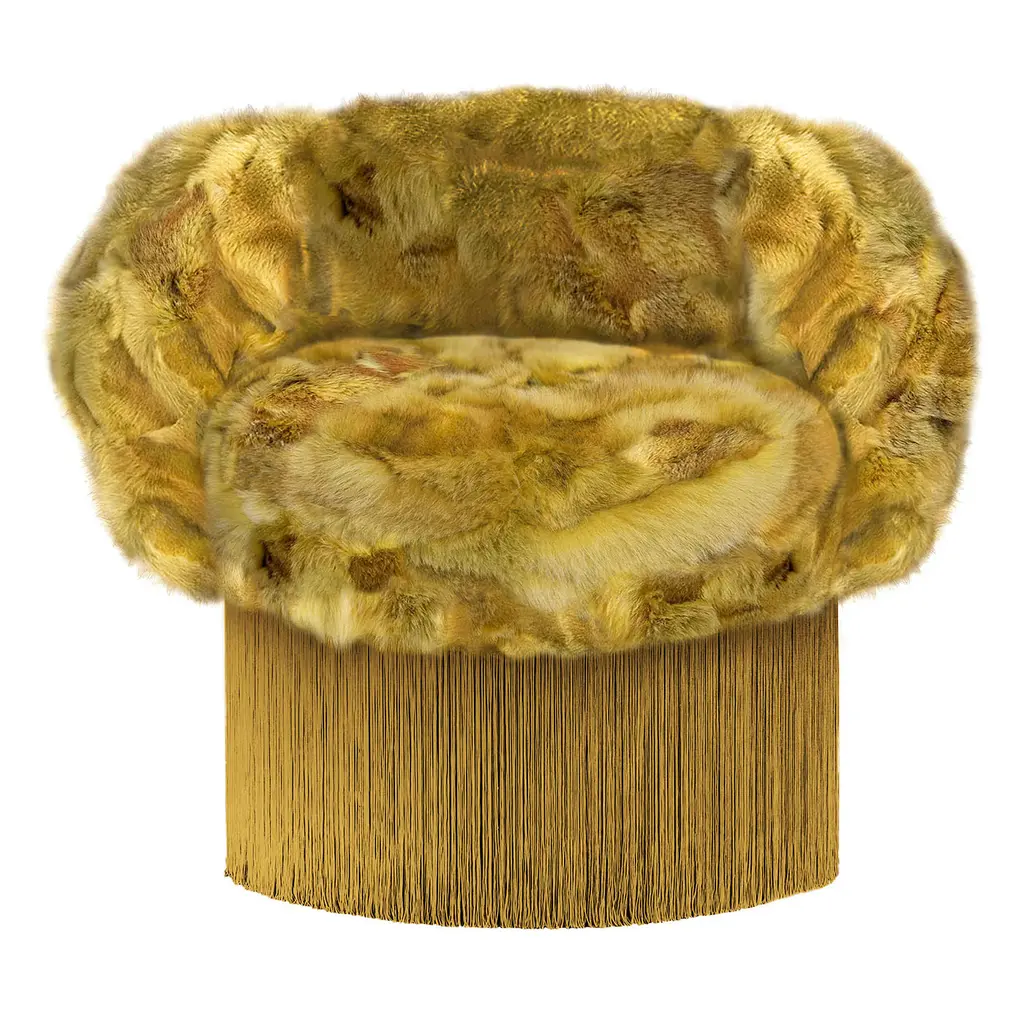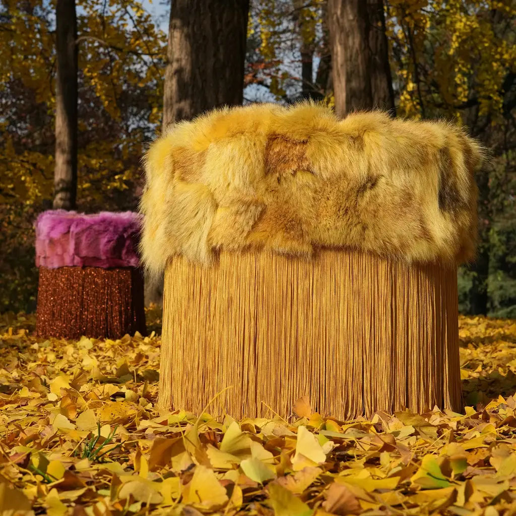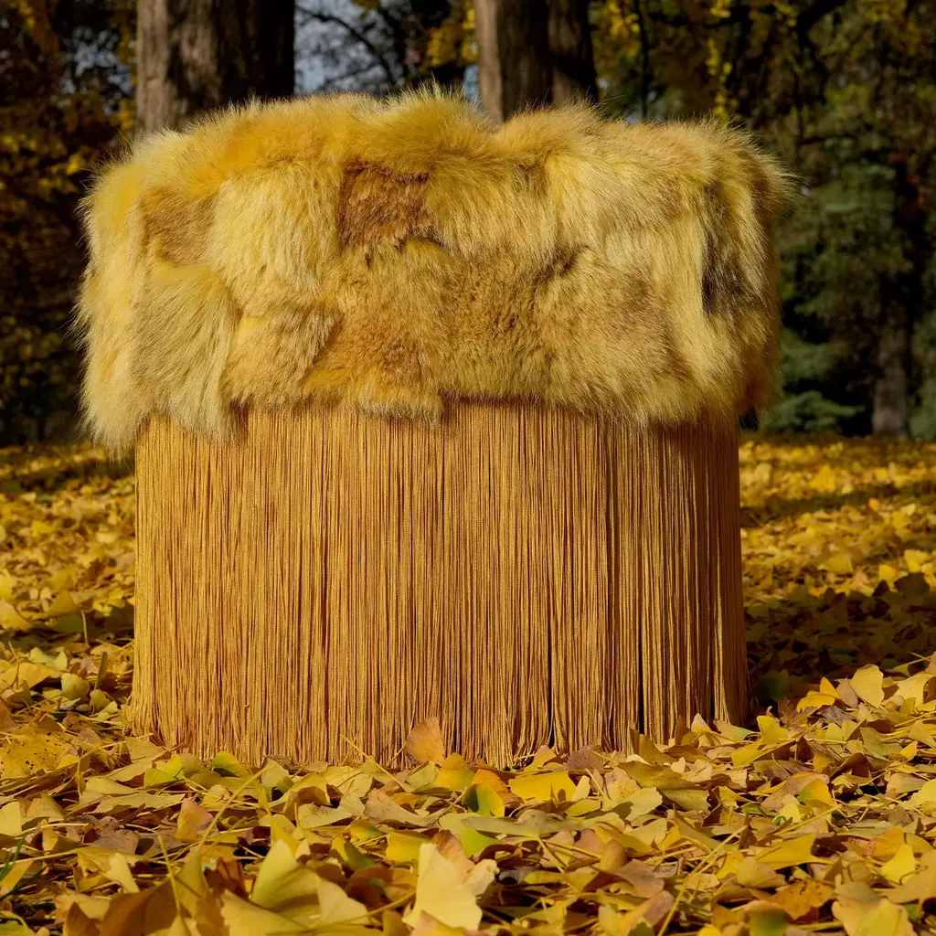 Lorenza Bozzoli Couture presents a limited-edition collection characterized by an extremely soft design, eclectic and distinctly retro. The new Fur Collection offers the Couture iconic pieces in a furry version with colours inspired by the seventies and sophisticated fur upholstery that emphasize the enveloping and smooth shapes for a cocoon effect. Pouf in patchwork of yellow coyote fur, warm and soft, with yellow fringes. Structure and legs in beech wood. Limited edition of 10 pieces. Each bespoke piece is stamped on the bottom of the pouf’s lining and personally signed, numbered, and dated by designer.