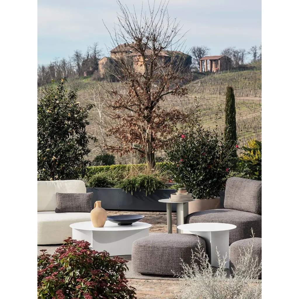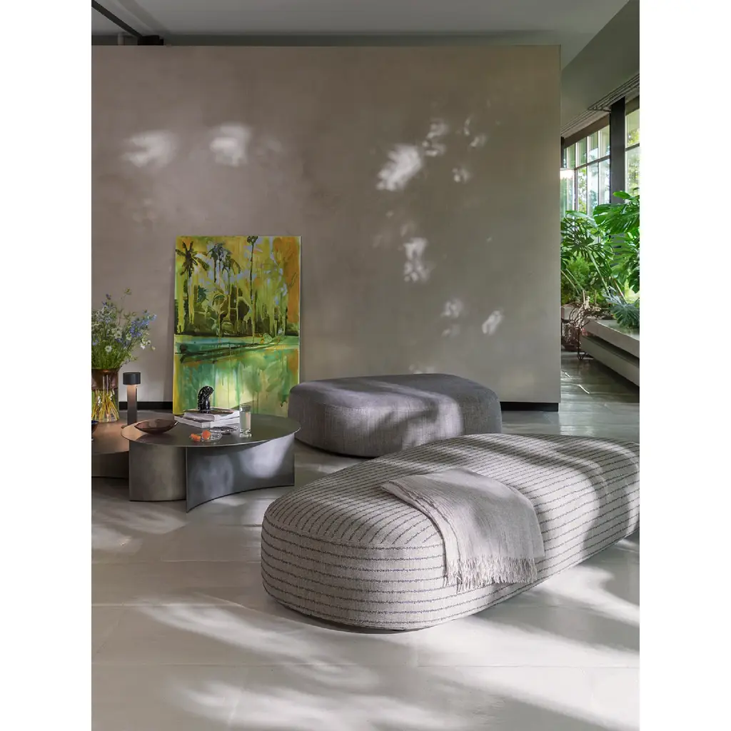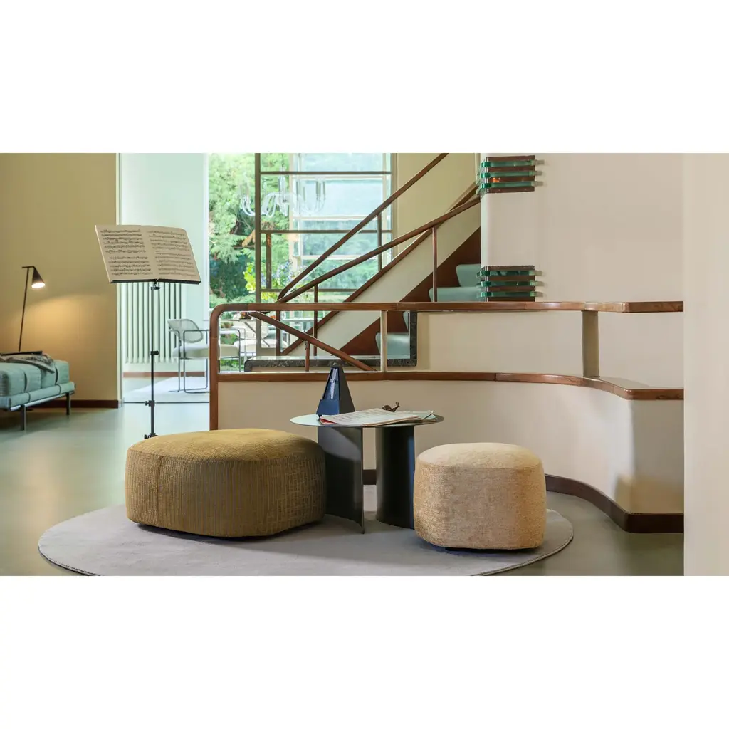 Introducing the Flou Moon Round Padded Table Pouf, a luxurious addition to any room. With its eye-catching asymmetrical stitching and variety of diameters and fabrics, this pouf is both functional and stylish. Accessorize with detachable trays for a stable surface, or use the cleverly-designed metal tray for added versatility. The perfect blend of form and function, this pouf is a must-have for any sophisticated space.