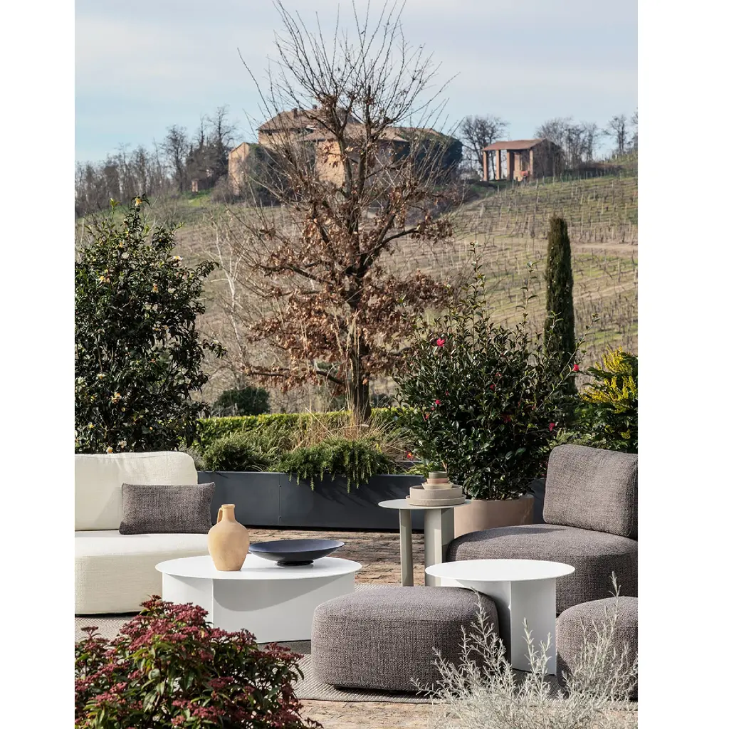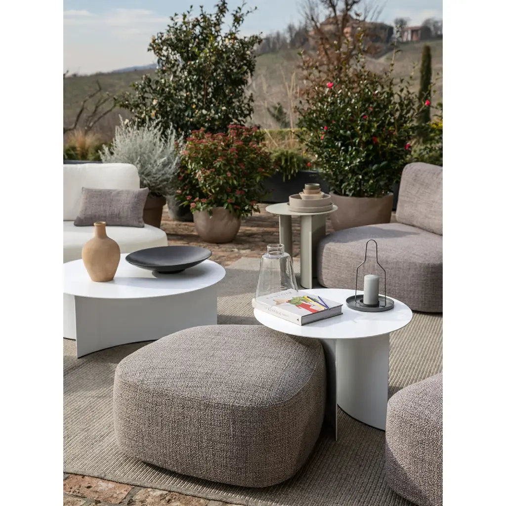 Introducing the Flou Moon Round Padded Table Pouf, a luxurious addition to any room. With its eye-catching asymmetrical stitching and variety of diameters and fabrics, this pouf is both functional and stylish. Accessorize with detachable trays for a stable surface, or use the cleverly-designed metal tray for added versatility. The perfect blend of form and function, this pouf is a must-have for any sophisticated space.
