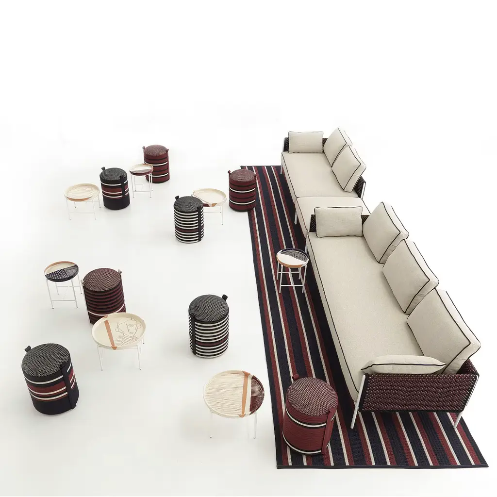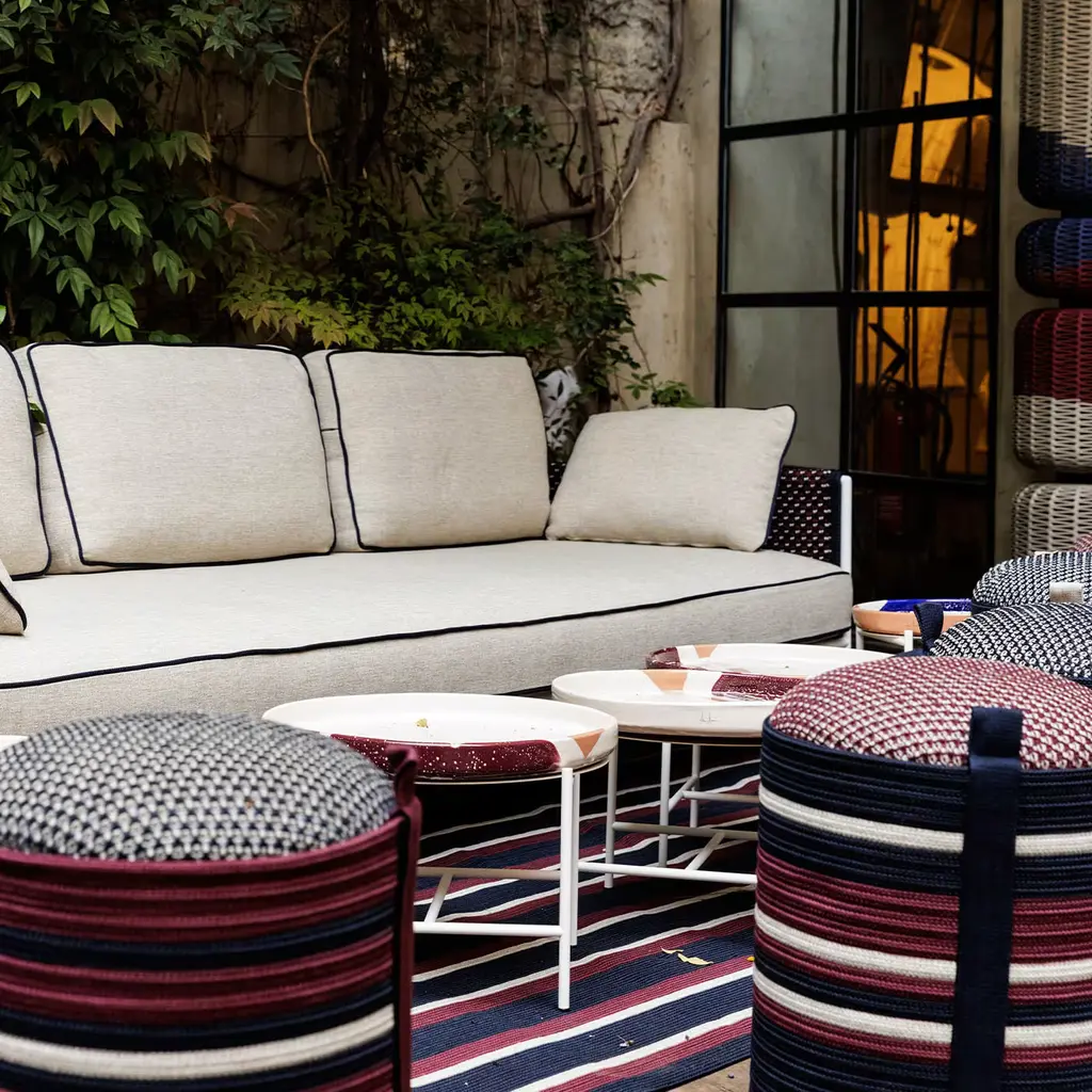 The shape of this pouf exudes sleek and approachable allure. It is the perfect combination of comfort and style. Entirely handmade in Italy with the outer part main material using stitched braids of different colors. Padded made with a special technique of knitting using only selected materials ensuring its durability and versatility.