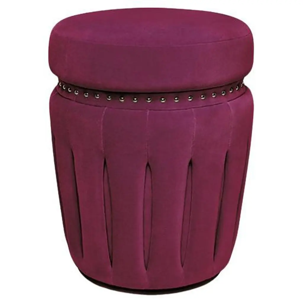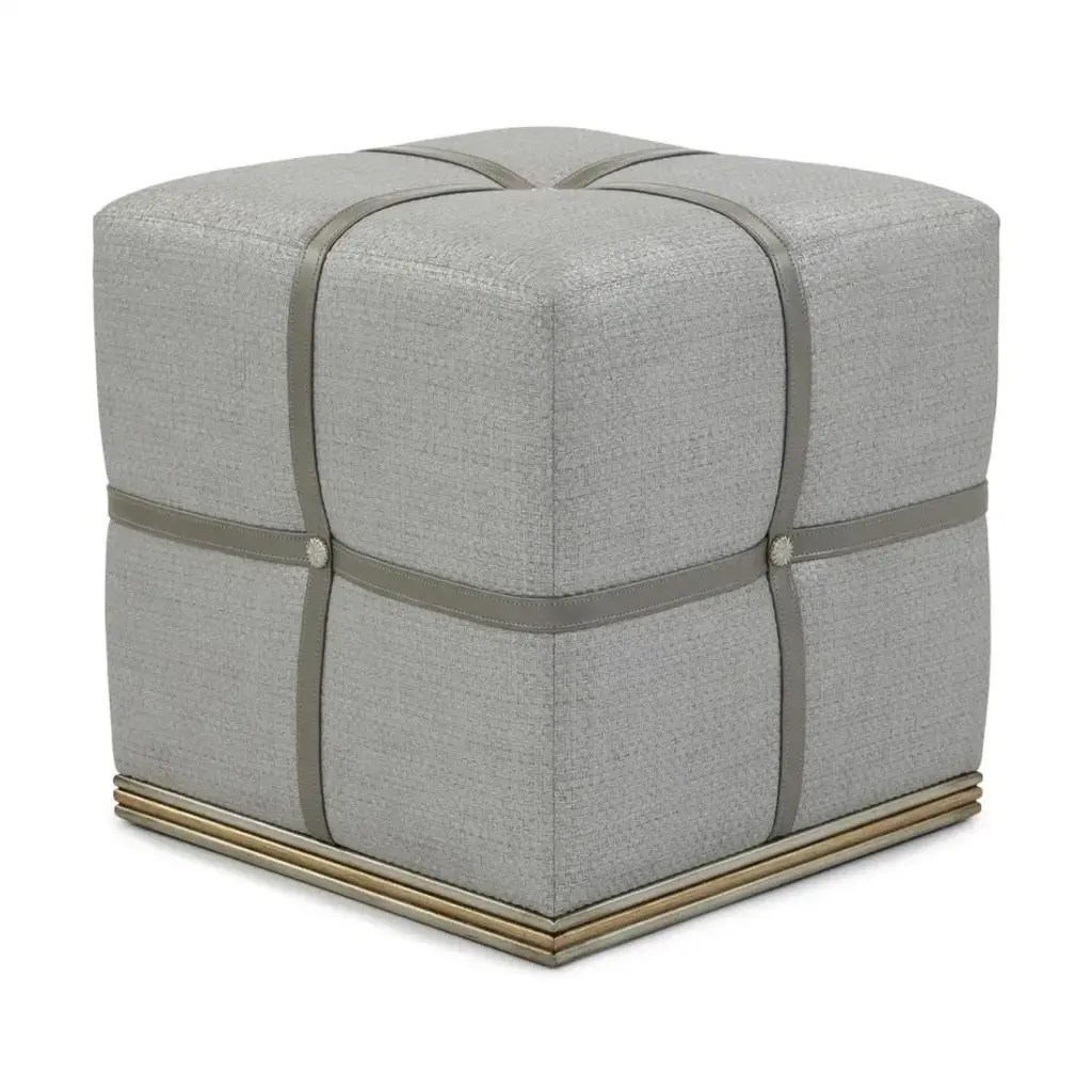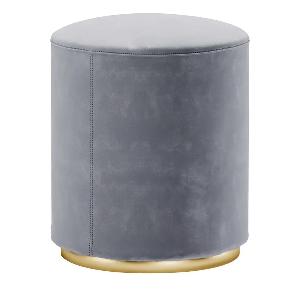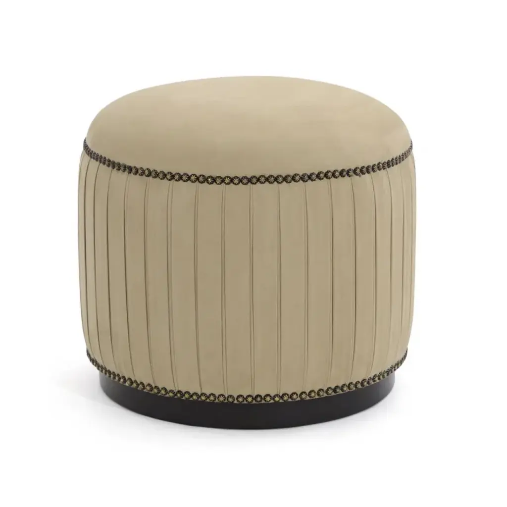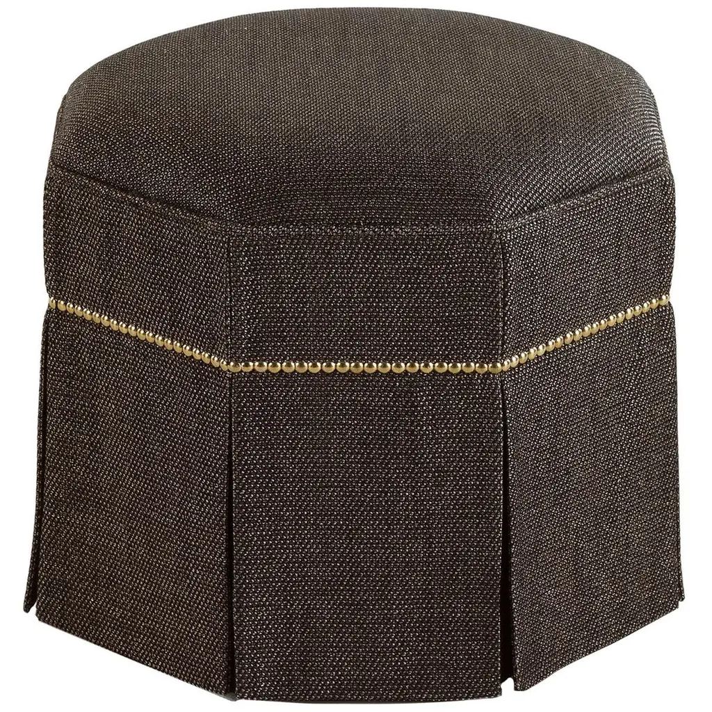 This elegant pouf will be a precious addition to a classic decor. Either to add extra seat in a living room or a sophisticated accent in a bedroom or powder room, this piece will enrich the look of any space, thanks to its elegant silhouette and comfortable cushion. The frame is in solid wood and the top is covered with a hypoallergenic polyurethane, upholstered with a rich, dark brown fabric. The skirt at the bottom is accented with a golden metal rim.