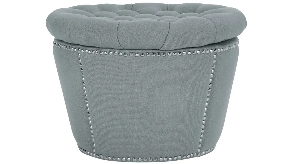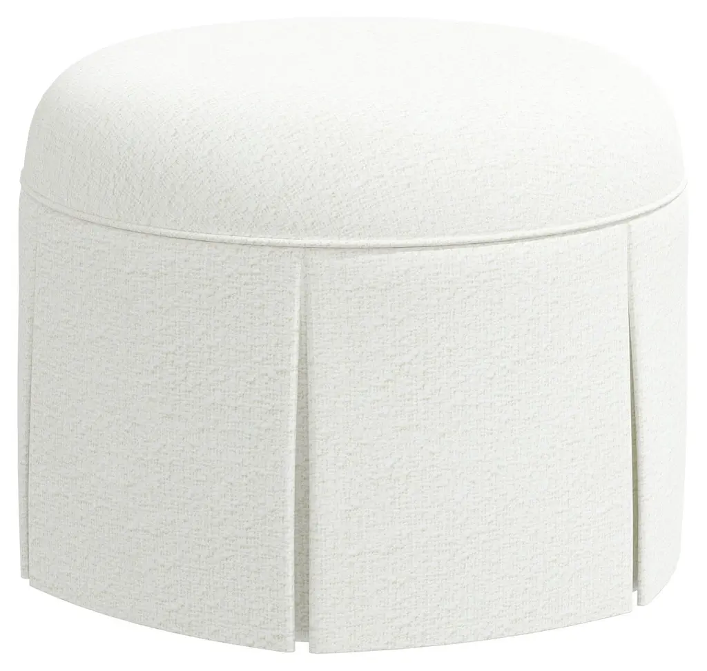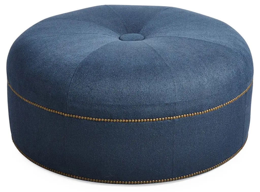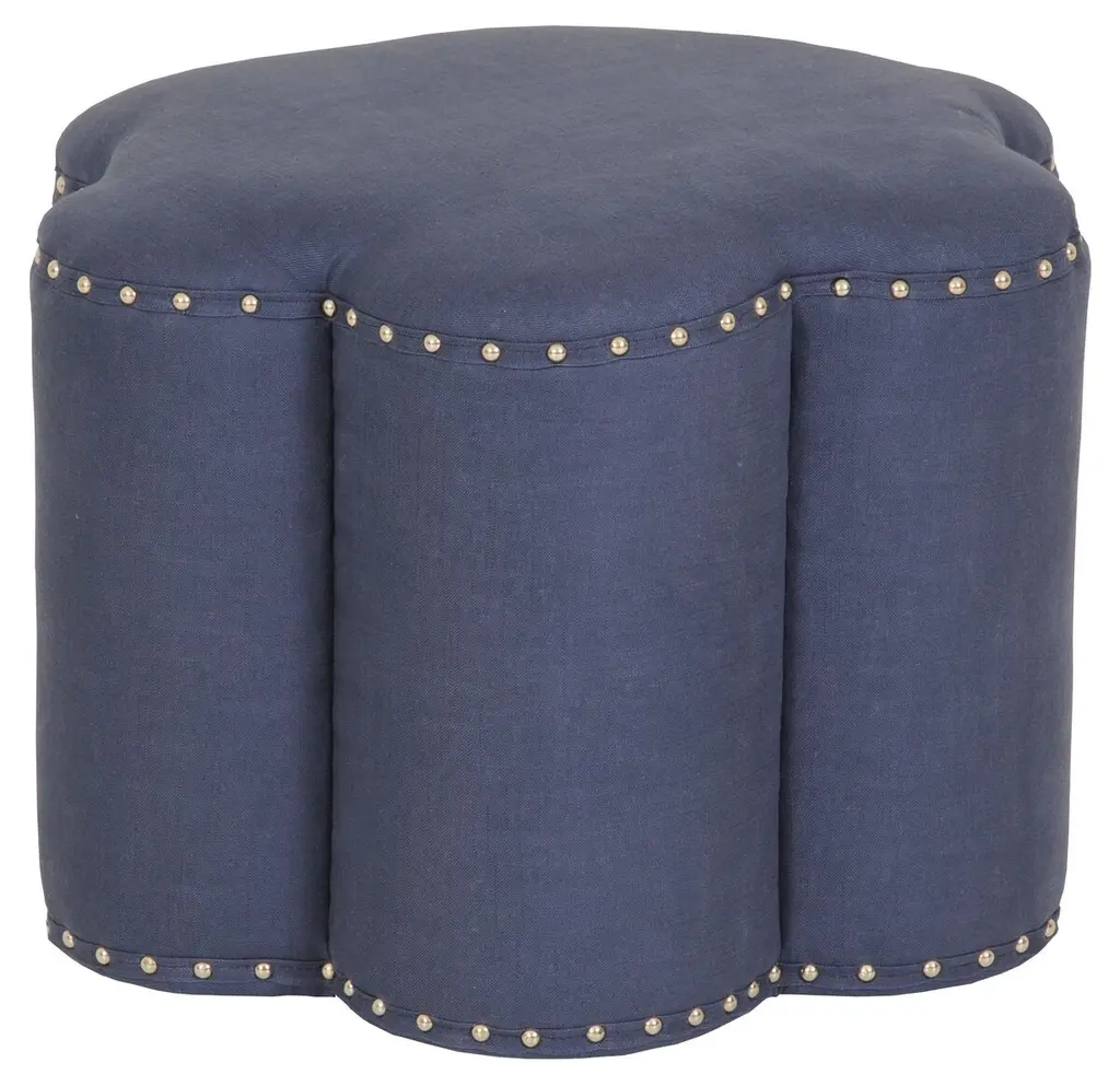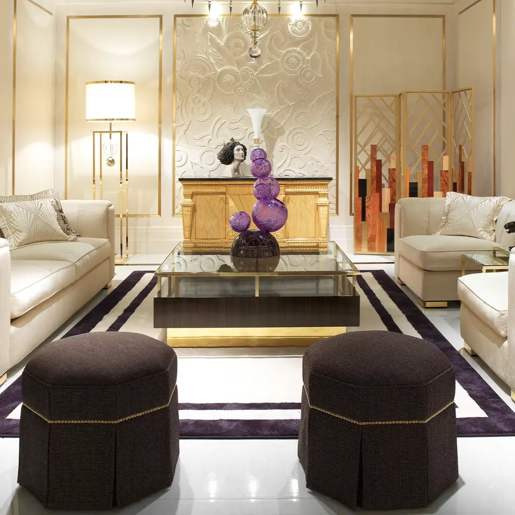 This elegant pouf will be a precious addition to a classic decor. Either to add extra seat in a living room or a sophisticated accent in a bedroom or powder room, this piece will enrich the look of any space, thanks to its elegant silhouette and comfortable cushion. The frame is in solid wood and the top is covered with a hypoallergenic polyurethane, upholstered with a rich, dark brown fabric. The skirt at the bottom is accented with a golden metal rim.