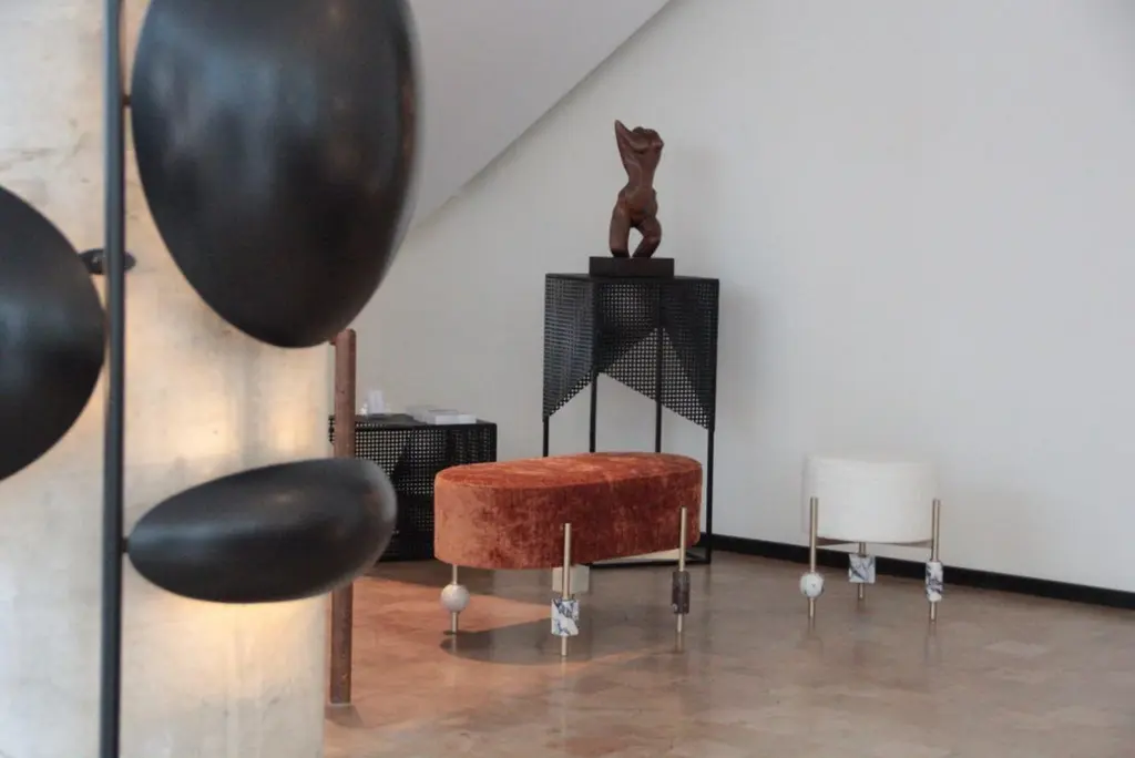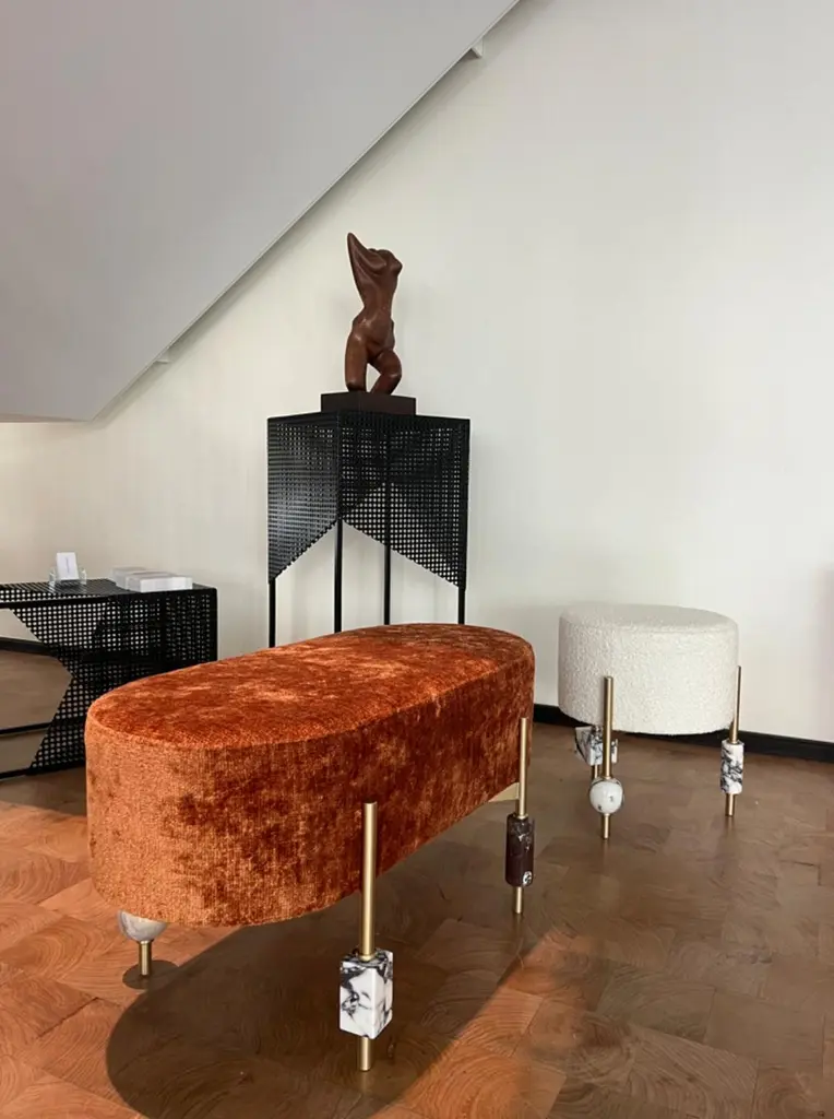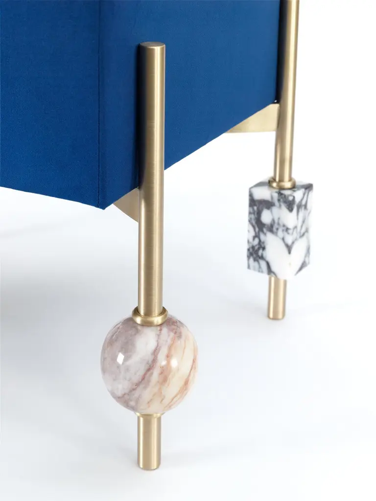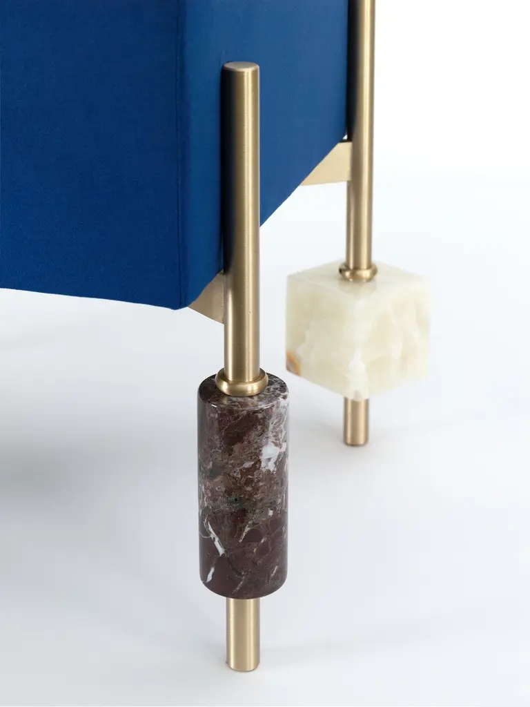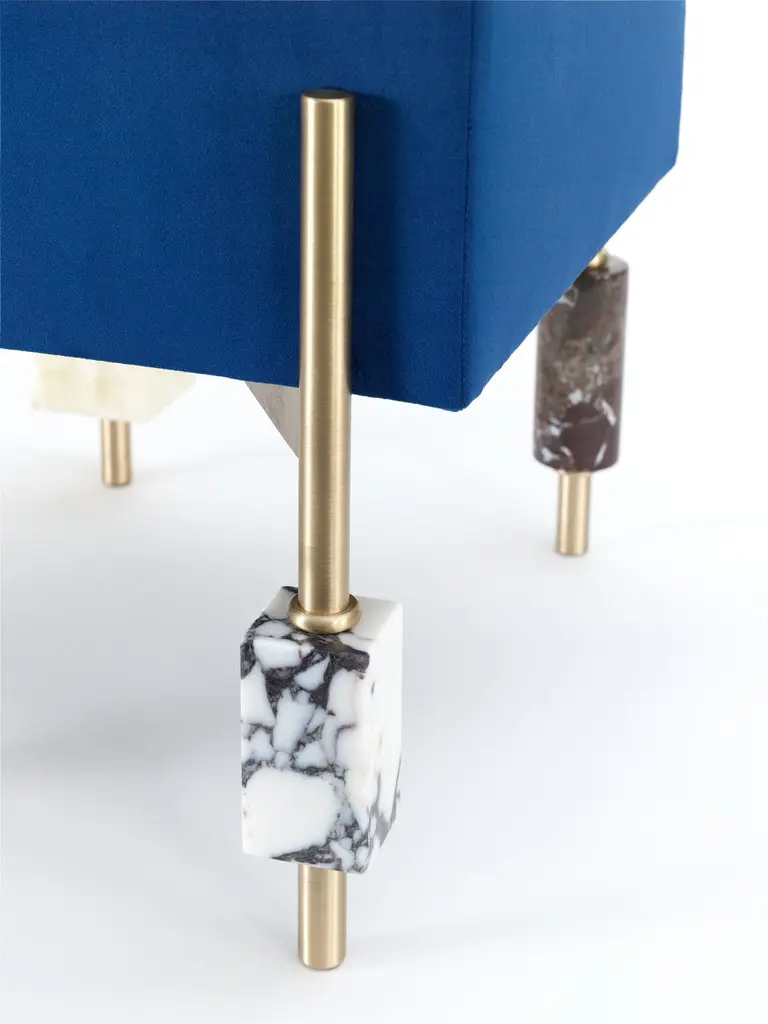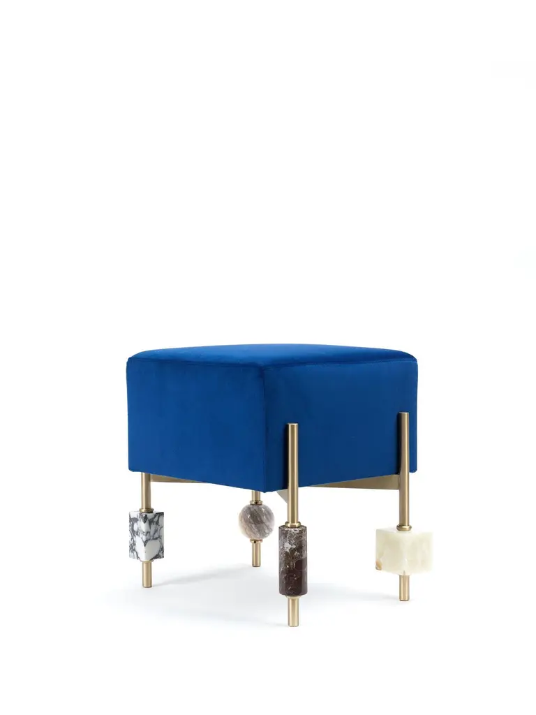 Plato pouf no 2 by Yasemin ToygarDimensions: W 40 x D 40 x H 46 cmMaterials: satin brass, marble and onyx, blue velvet fabricPlato CollectionInspired by the geometric still life, Plato explores and defies the boundaries of sensory experience of furniture through its evocative forms and colours.Yasemin ToygarBorn in Istanbul, Yasemin was born into the arts. In a city that hosted three empires, it was undoubtedly her environment as a child that inspired her life track into becoming a designer. Yasemin was always fascinated by the human body and its sensory relations in the field of built environment. Subsequently, her desire to create unique spatial experiences brought her to London to study Architecture.Yasemin’s constant search for sensory meaning in everyday objects inspired her to experiment with colours, textures and structures on her own – and so the brand was born. Her designs reflect the harmony of contrasts – softness and rigidity, abstract and material, lightness and heaviness – through the use of materials such as marble, onyx, brass, velvet and through thoughtful colour combinations that evoke countless emotions. Yasemin believes furniture should be reflecting one’s personal perception of the world, therefore customisation is at the heart of the brand. Each piece is hand-crafted in a small artisanal atelier in Istanbul; thus, each piece is unique in its own essence.