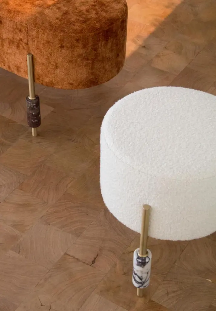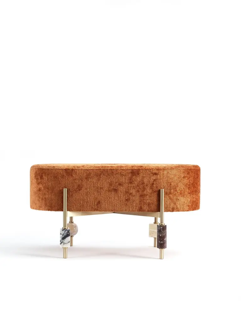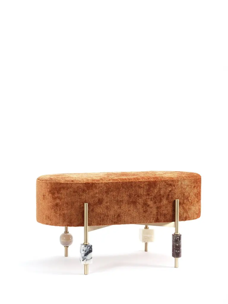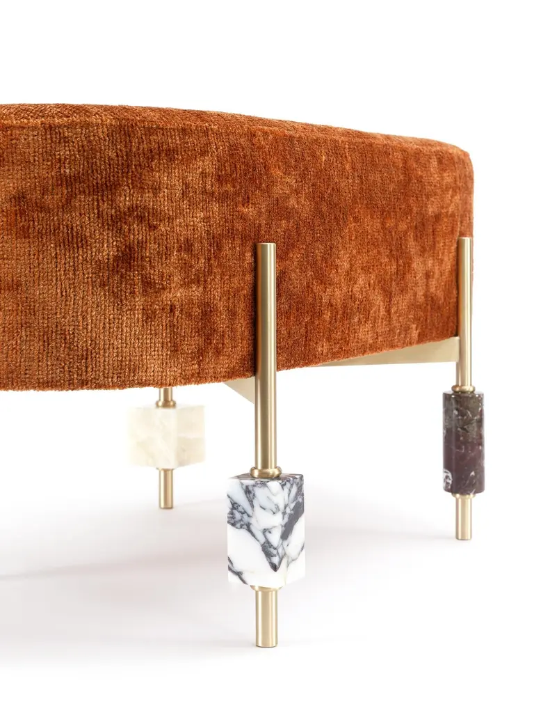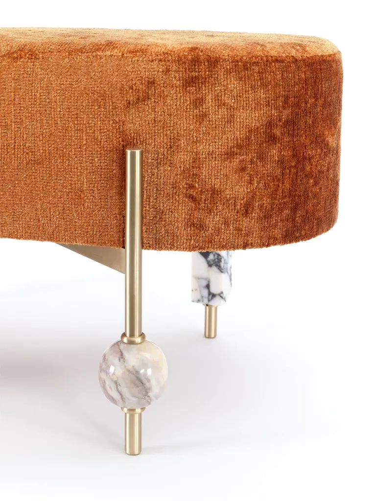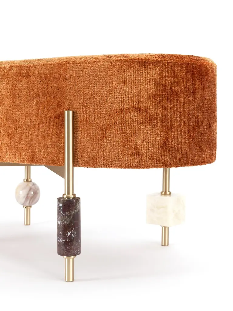 Plato Pouf No 3 by Yasemin Toygar.Dimensions: W 92 x D 40 x H 46 cmMaterials: Satin Brass, marble and onyx, orange velvet fabric.Plato CollectionInspired by the geometric still life, Plato explores and defies the boundaries of sensory experience of furniture through its evocative forms and colours.Yasemin ToygarBorn in Istanbul, Yasemin was born into the arts. In a city that hosted three empires, it was undoubtedly her environment as a child that inspired her life track into becoming a designer. Yasemin was always fascinated by the human body and its sensory relations in the field of built environment. Subsequently, her desire to create unique spatial experiences brought her to London to study Architecture.Yasemin’s constant search for sensory meaning in everyday objects inspired her to experiment with colours, textures and structures on her own – and so the brand was born. Her designs reflect the harmony of contrasts – softness and rigidity, abstract and Material, lightness and heaviness – through the use of materials such as marble, onyx, brass, velvet and through thoughtful colour combinations that evoke countless emotions. Yasemin believes furniture should be reflecting one’s personal perception of the world, therefore customisation is at the heart of the brand. Each piece is handcrafted in a small artisanal atelier in Istanbul; thus, each piece is unique in its own essence.