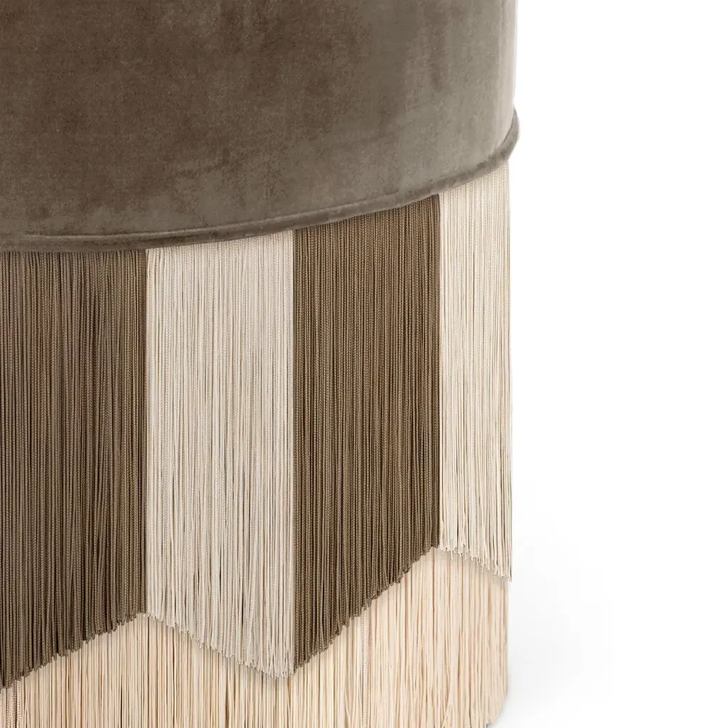 The Plissé Pouf, a stunning addition to any living space, features a velvet finish in brown and grey tones. With a diameter of 50 cm, this pouf effortlessly serves as a versatile accent piece, ideal for both additional seating and decorative purposes. The unique Plissé pattern showcases an essential design, characterized by an overlapping fringe motif that creates a captivating pleated effect, adding dynamic movement and a light ambiance to the room. The neutral tones harmoniously blend into various decor styles, making it a timeless choice for modern interiors. Each bespoke piece is stamped on the bottom of the pouf’s lining and personally signed, numbered, and dated by designer.