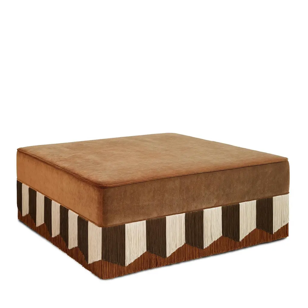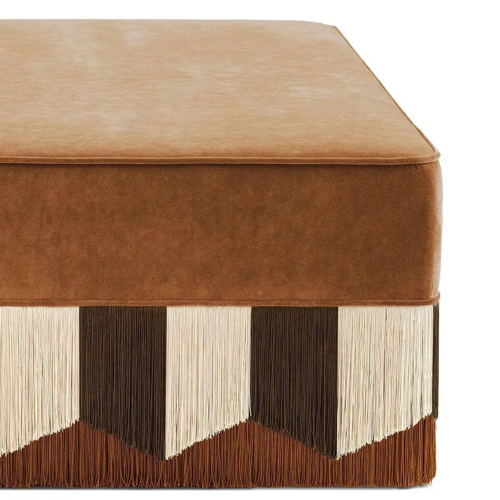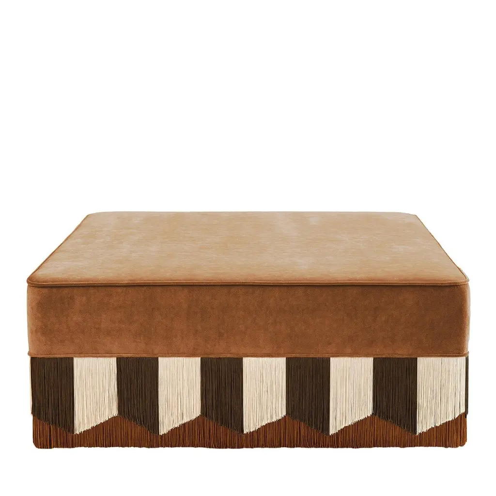 The Plissé Square Cognac and Brown Velvet Pouf brings a sophisticated, three-dimensional expression to the signature Plissé pattern. Measuring 95 x 95 cm (37.4 x 37.4 inches) with a height of 38 cm (15 inches), this generously sized pouf offers ample seating for up to three people or serves as a stylish surface for books, magazines, or decorative trays when placed in front of a sofa. Upholstered in luxurious cognac and brown velvet, the design embraces a refined aesthetic, enriched by a harmonious blend of three complementary tones. The overlapping fringe motif mimics a pleated effect, adding movement and lightness while enhancing the timeless elegance of this functional and versatile piece. Each bespoke piece is stamped on the bottom of the pouf’s lining and personally signed, numbered, and dated by designer.