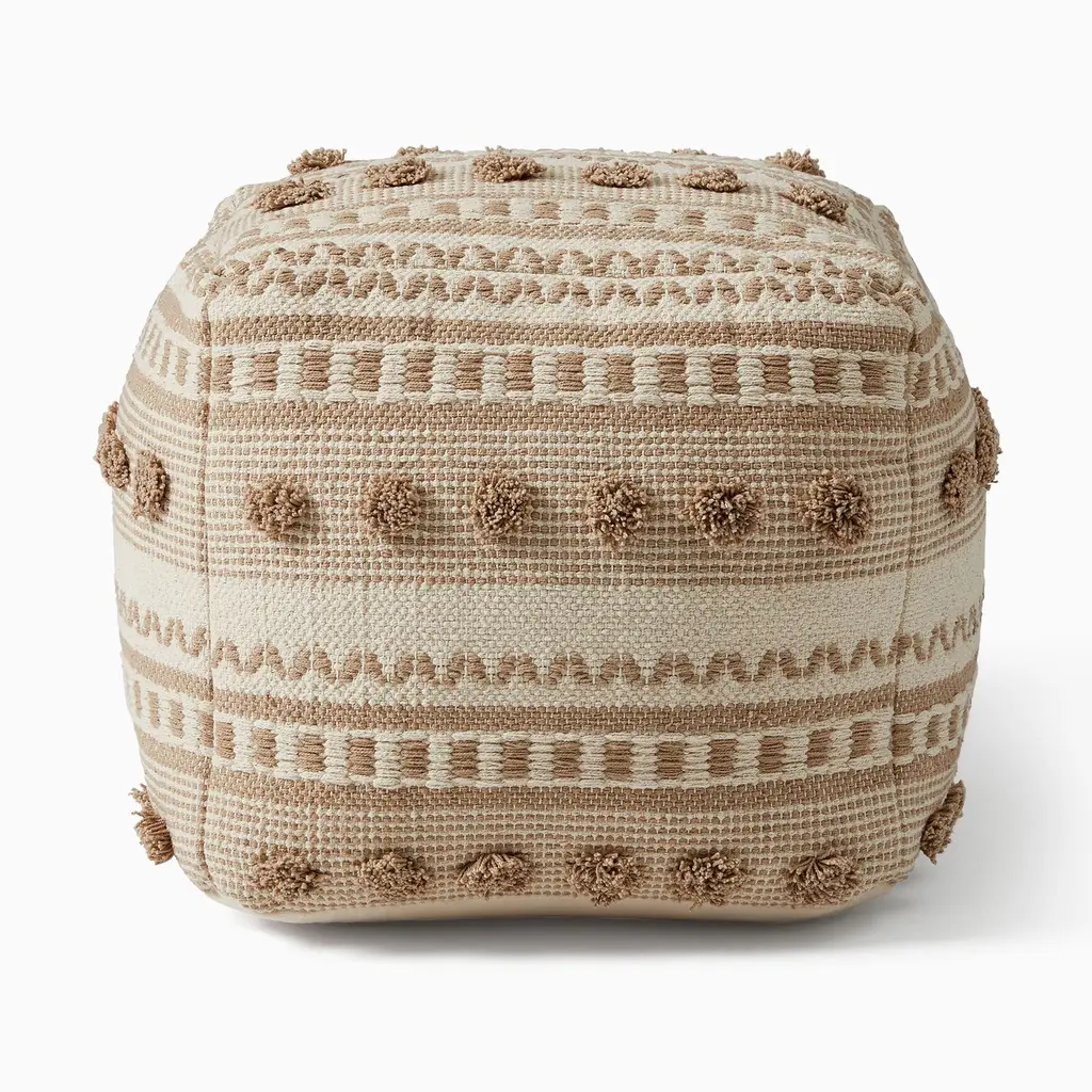 Pom poms for a charming finishing touch. Made from a soft and durable wool cotton blend. Works as extra seating or a makeshift table. Crafted in a Fair Trade Certified™ facility.