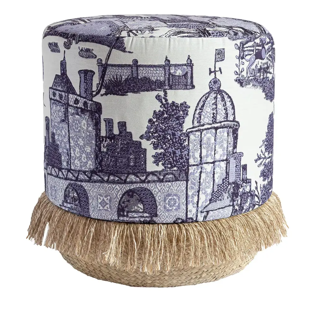A clever synthesis of classic and pop design influences defines this glamorous pouf, which will bring a refreshing touch to a modern living room or bedroom. A bubblegum-pink fabric envelops the rounded base, standing in neat contrast with Toile de Jouy upholstery, by Toile Society, in black and white covering the cylindrical seat. The contour between the two is emphasized by thin golden trimming. Check available color variants with the Concierge.
