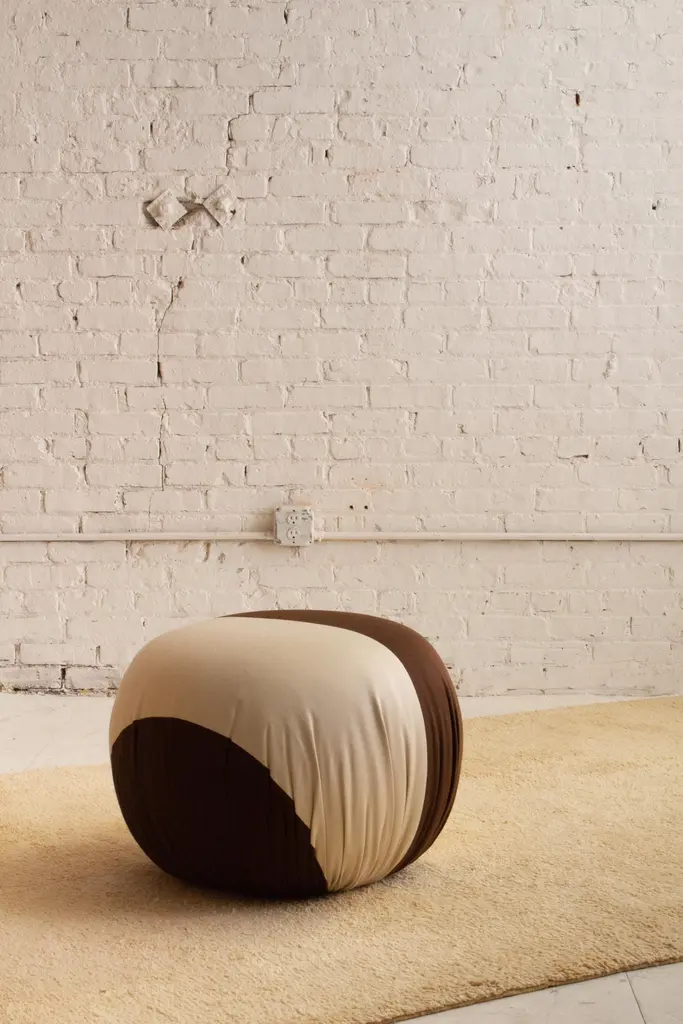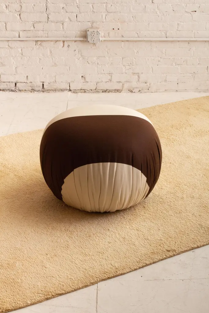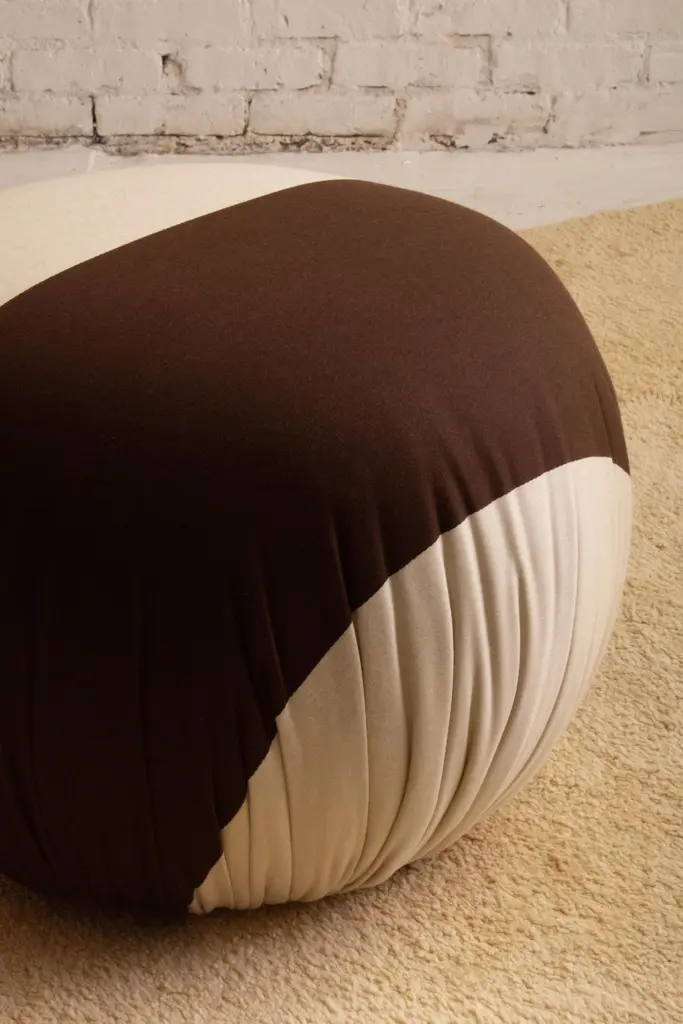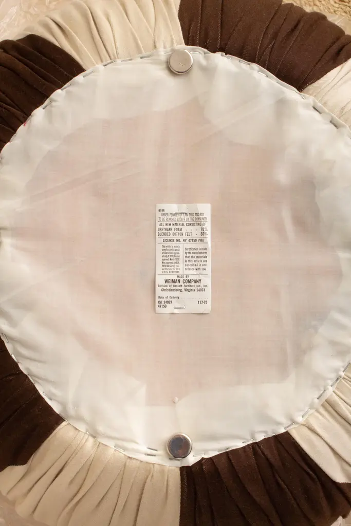 A post modern pouf ottoman by Weiman. Newly reupholstered in a cream and brown striped jacquard. Two available, sold separately.