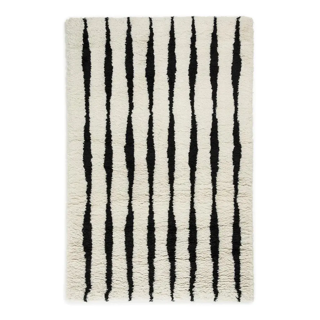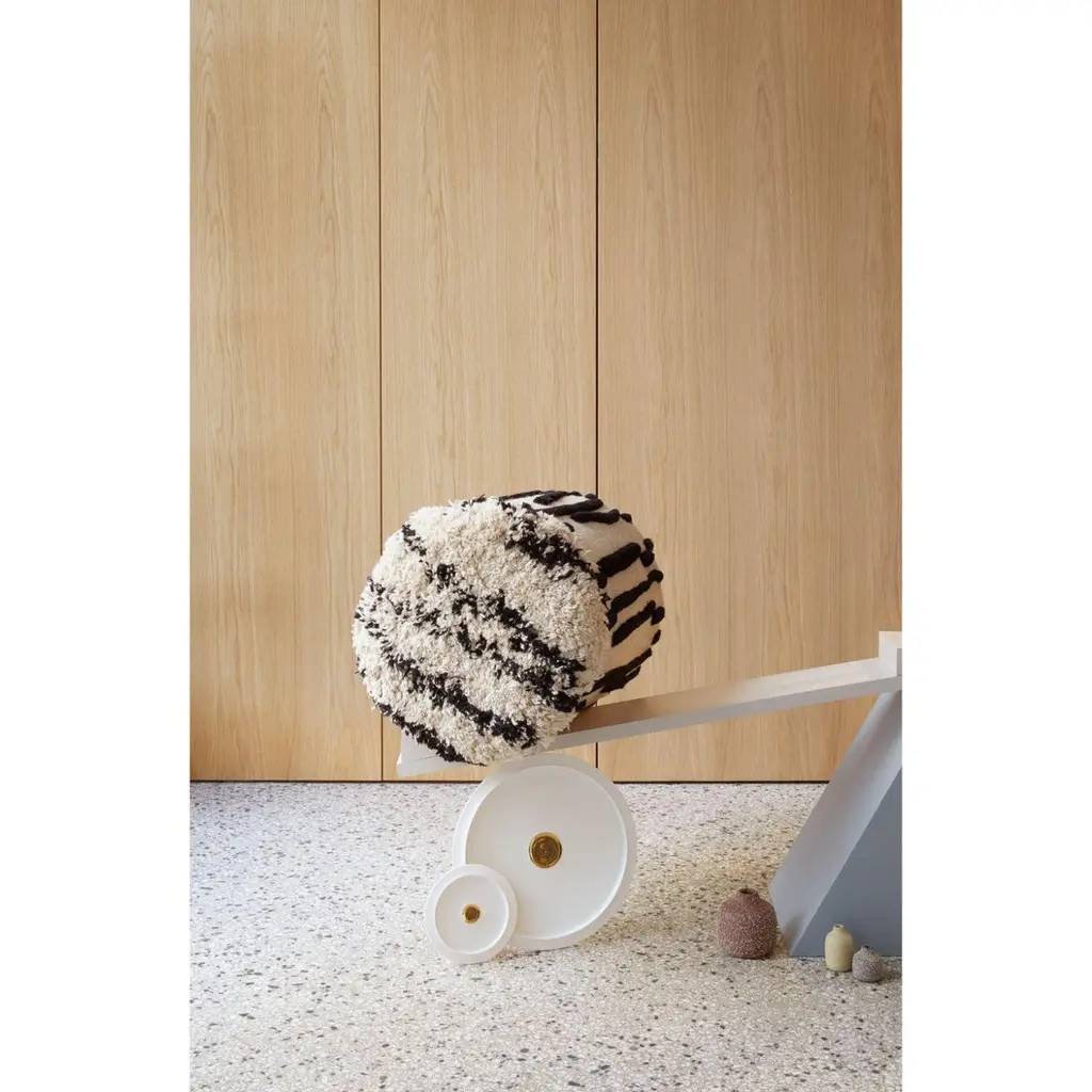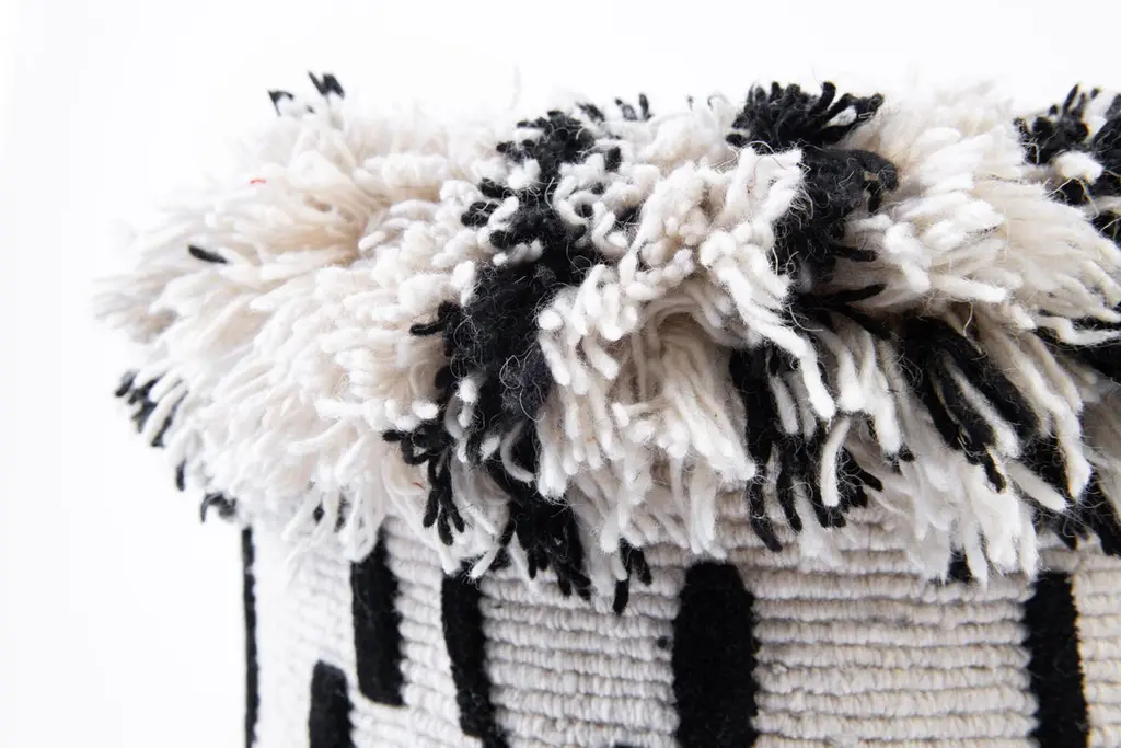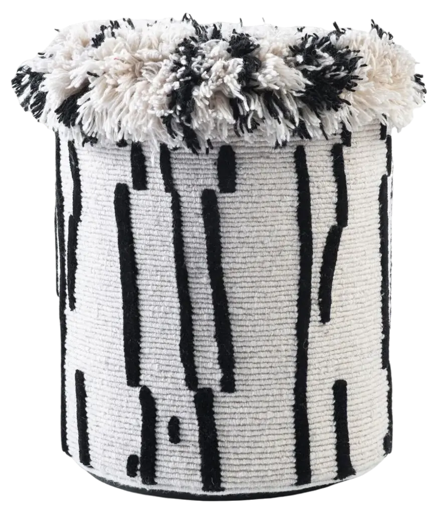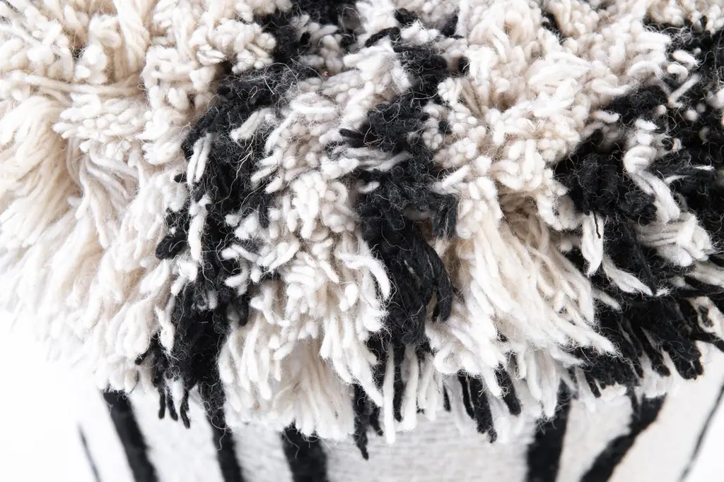 Pouf Charaktere Cuno by Lyk CarpetDimensions: Ø 46 x H 60 cm.Materials: 100% tibetan highland-wool, new pure hand-combed and hand-spun wool, natural vegetable-dyed wool, 100 knots per square inch.Hand-knotted, manual techniques and pot-dying makes every Lyk Carpet unique, slight variations in size & tone is possible. Please contact us.CUNO POUF The combination of different knotting techniques and the special language of form that characterize the designs of designer Mareike Lienau distinguish, make up the sculptural quality of her pouf series. The newly created objects are characterized by exciting contrasts and a strong presence.The pouf Cuno, for example, is reduced to a noble black and white in combination with differently differently knotted wool surfaces in the foreground. The white surface is looped, combined with longer black knotted black knotted threads and then cut into shape. This gives the pouf the appearance of a elements - giving the impression of artificial tree bark - and the fluffy seat a four-dimensional feel. four-dimensional feel that can be felt and seen.Mareike Lienau designs carpet objects and unique carpets for her label Lyk Carpet, which are hand knotted in Nepal. Her mission is to reinterpret craft and to bring it closer to young people. The superficial functionality of the She tries to radically question the superficial functionality of the carpet. Away from the rectangle Mareike wants to positive, lustful and imaginative the form & the craft, the material new, unseen and exaggerated show.Her approach asks: ‘What is contemporary about craft?‘ ,“Many people don’t really relate to products anymore. Mass production has led to today’s throwaway society. I want to contribute to raising people’s awareness, prompting them to think about products: how they are made and the resources involved; to generate values. I decided to do this through supporting the preservation of a cultural heritage, and by designing authentic objects. Contemplating and experiencing this artistic craft leads to new insights and points of view and enriches communication.With my textile posters and Pouf_Characters for example I am inviting people to ac- quaint themselves with a value creation chain, and to think about global responsibility.“