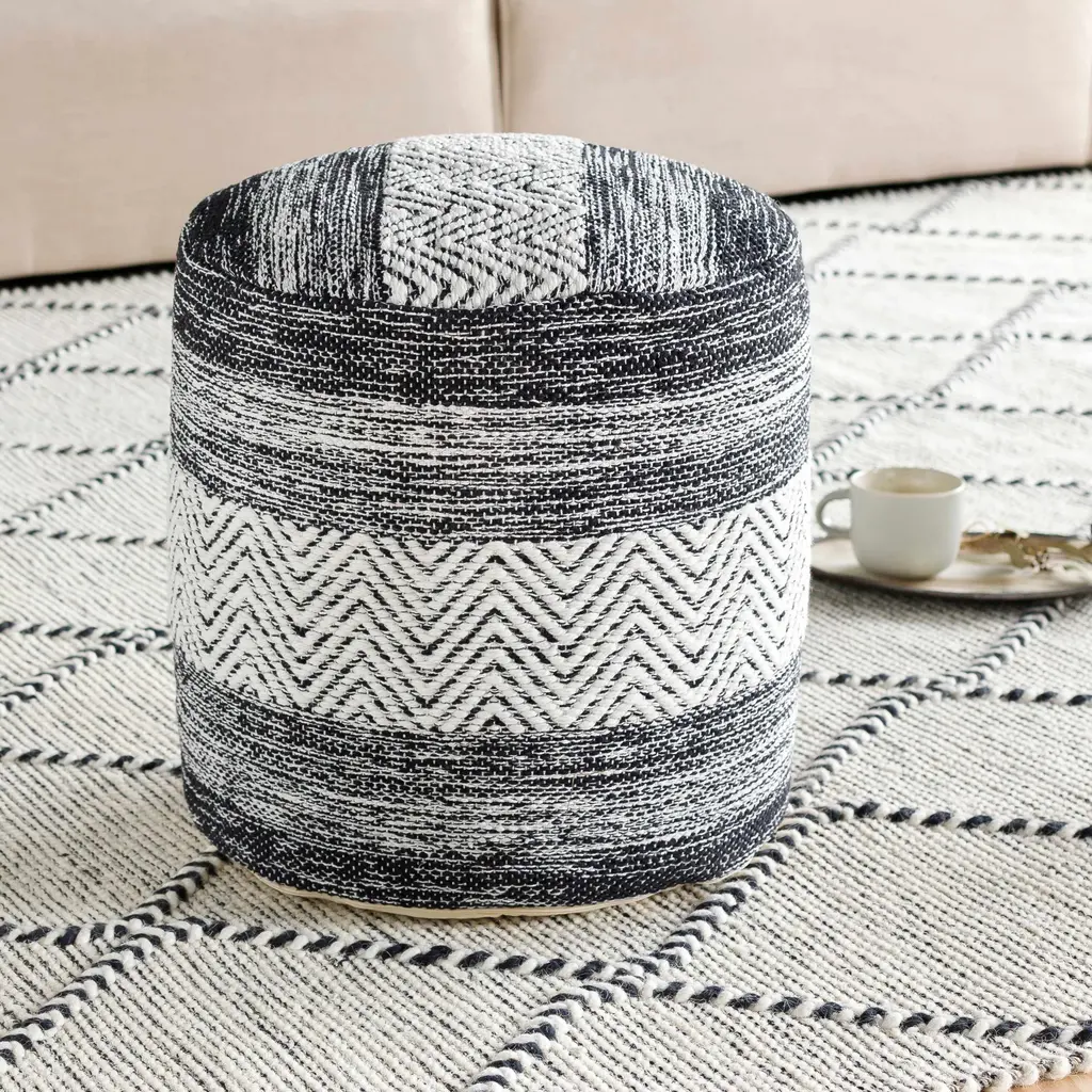 Introducing the Pouf-Denim Blue Beige Braided Jute Fiber Cotton Blend, a versatile and stylish addition to any room. This round pouf features a traditional design with a mix of white, denim, dark blue, tan, dark brown, and teal colors. Perfect for bedrooms and living rooms, it combines comfort and functionality in a compact size.