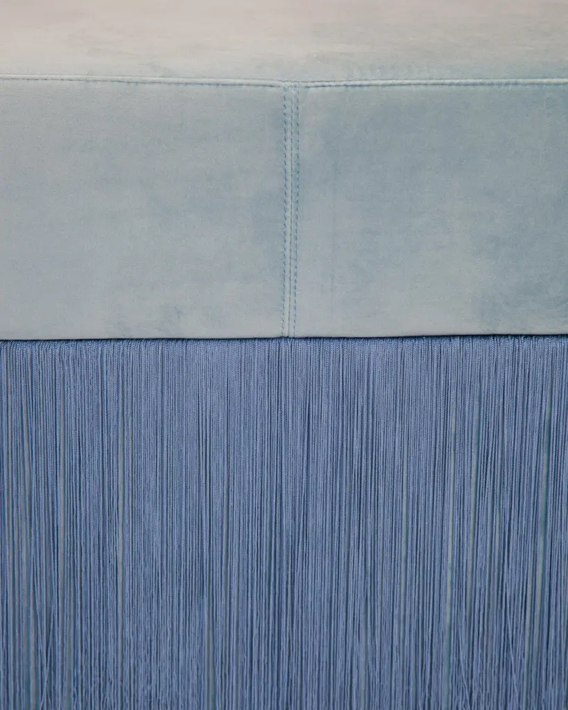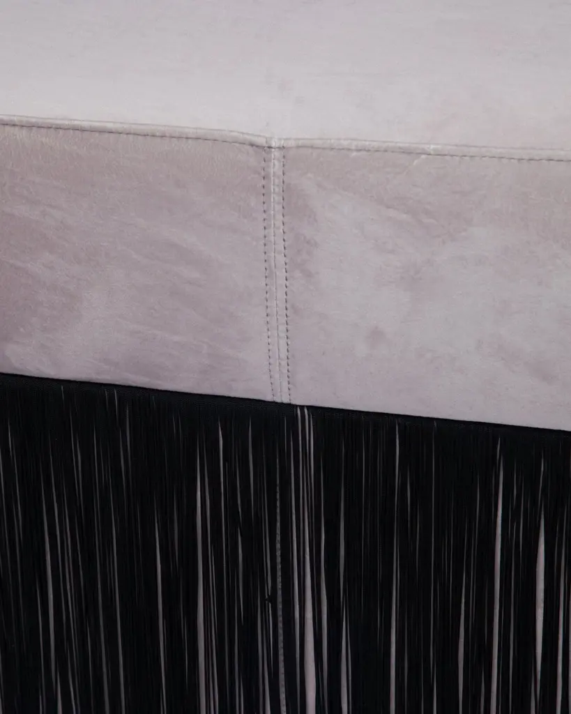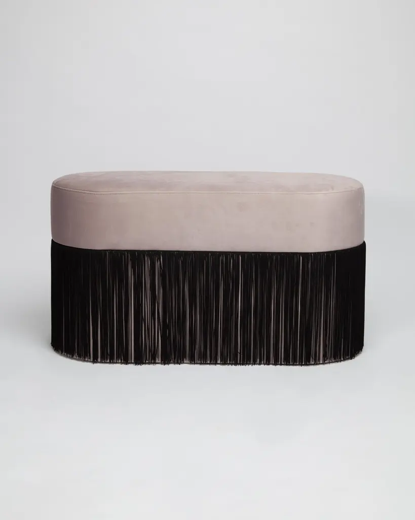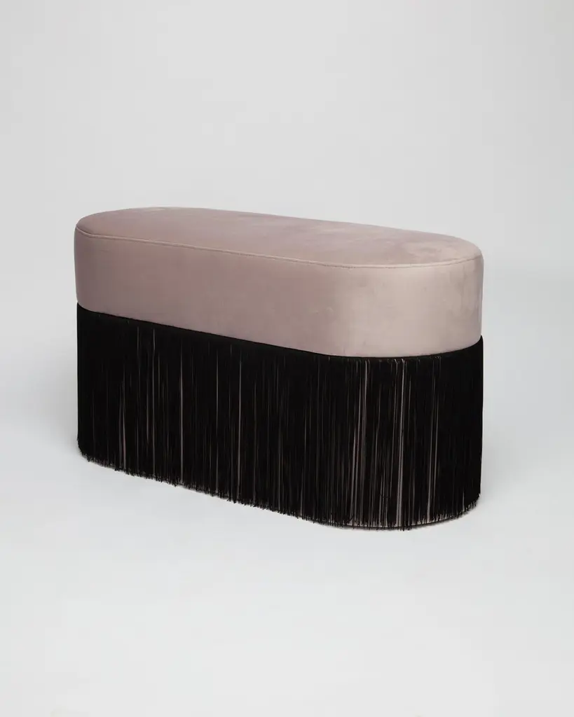 Pouf Pill L Contemporary Sculptural Pouf with Velvet and Fringes by HoutiqueDimensions: H 45 x 80 x 35 cmMaterials: Velvet upholstery and 30cm fringesPill Pouf LArt-deco style pouf with wood structure and velvet fabric.2 fiber-board discs of 16mm, joined by wooden tufts.Upholstery Velvet 100% polyester with backing. 345 gr/m. 50000 Martindale cycles.TEAD foam with fibre-covered.Designed by Houtique. Made in Spain.All of our products are original designs.We only use high quality raw materials.All components follow international safety standards.2 Years warranty in production failures.HoutiqueExotic rhythms, champagne toasts and velvet words. We were dancing when we found a sign that said "back to the future" and so we followed it. The sign took us here, to a sexy, luxe and fun dimension.We keep on dancing, we won't stop.