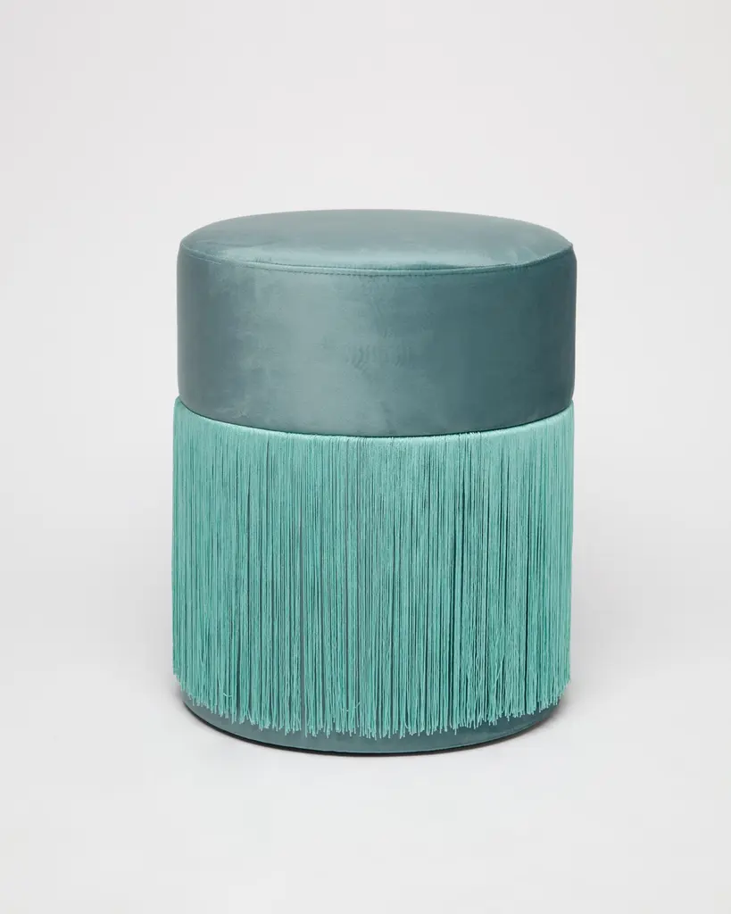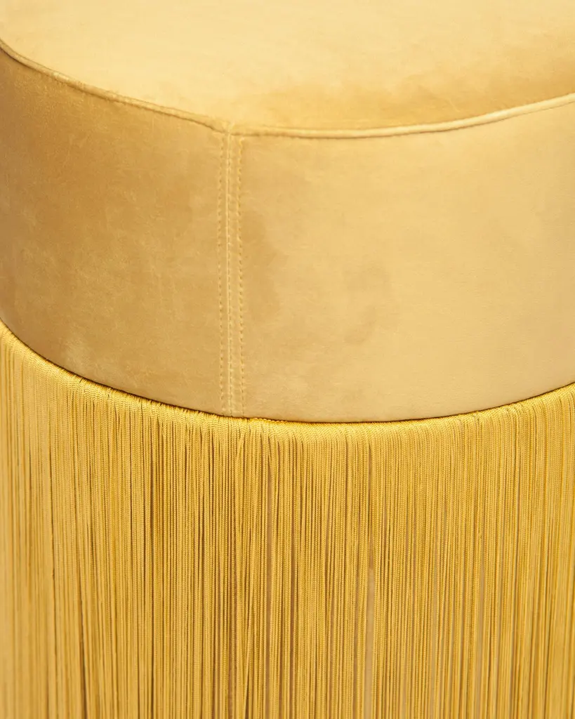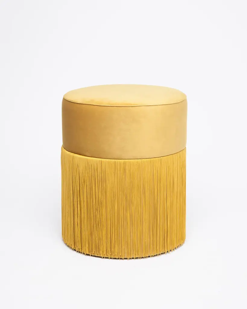 Pouf Pill S Contemporary Sculptural Pouf with Velvet and Fringes by HoutiqueDimensions: H 45 x D 35 cmMaterials: Velvet upholstery and 30cm fringesPill Pouf SArt Deco style pouf with wood structure and velvet fabric.2 fiber-board discs of 16mm, joined by wooden tufts.Upholstery Velvet 100% polyester with backing. 345 gr/m. 50000 Martindale cycles. TEAD foam with fibre-covered.Designed by Houtique. Made in Spain.All of our products are original designs.We only use high quality raw materials.All components follow international safety standards.2 years warranty in production failures.HoutiqueExotic rhythms, champagne toasts and velvet words. We were dancing when we found a sign that said "back to the future" and so we followed it. The sign took us here, to a sexy, luxe and fun dimension.We keep on dancing, we won't stop.