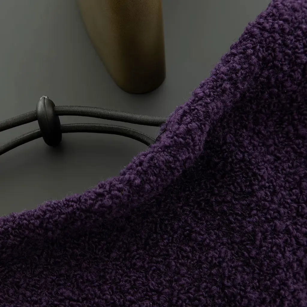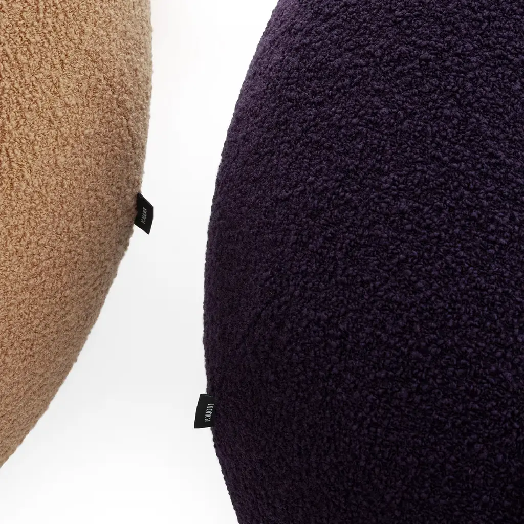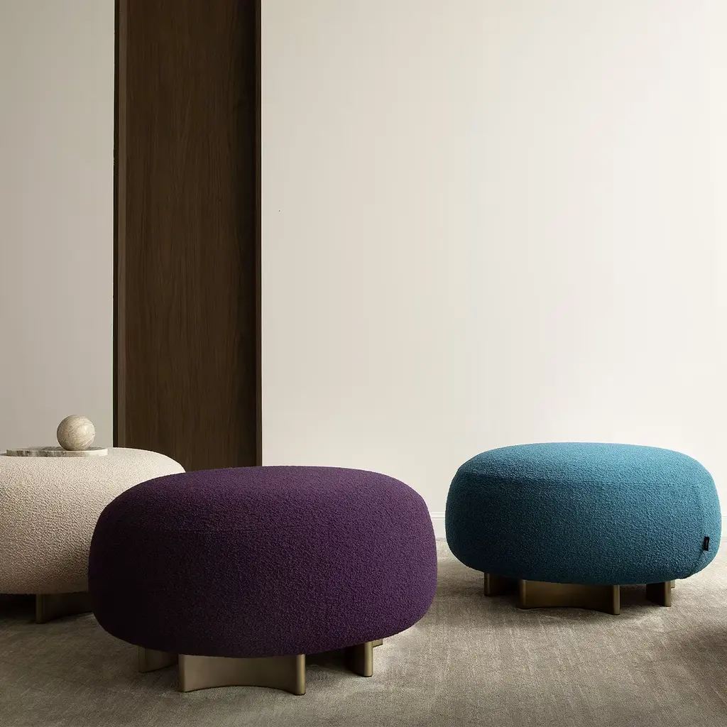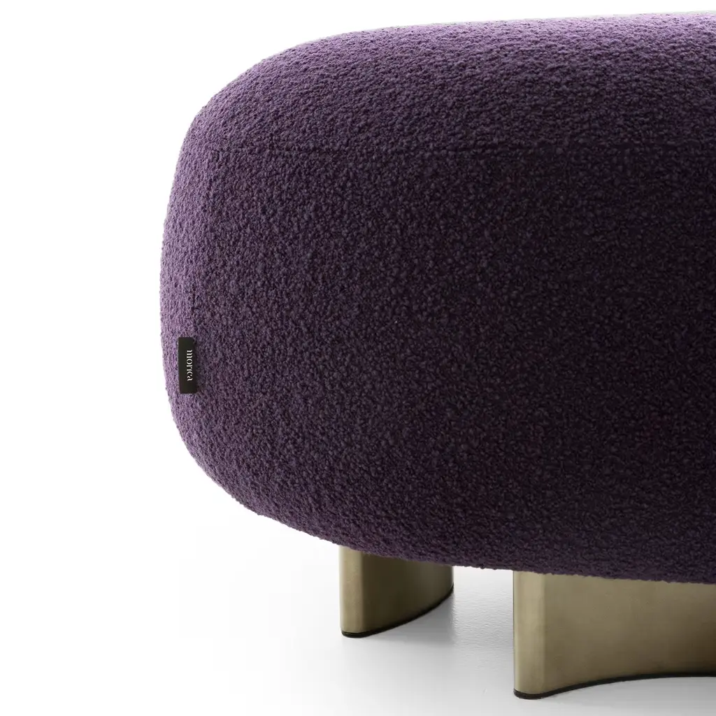A symphony of comfort and elegance, this pouf features a high-density foam seat enveloped in a rich, purple bouclé fabric. The fully removable cover ensures easy maintenance, while the curved MDF base, lacquered in a sophisticated Oxidized Bronze, adds a touch of modern artistry. This pouf captivates with its luxurious texture and bold color, creating a striking focal point that harmonizes style and function in any contemporary living space.