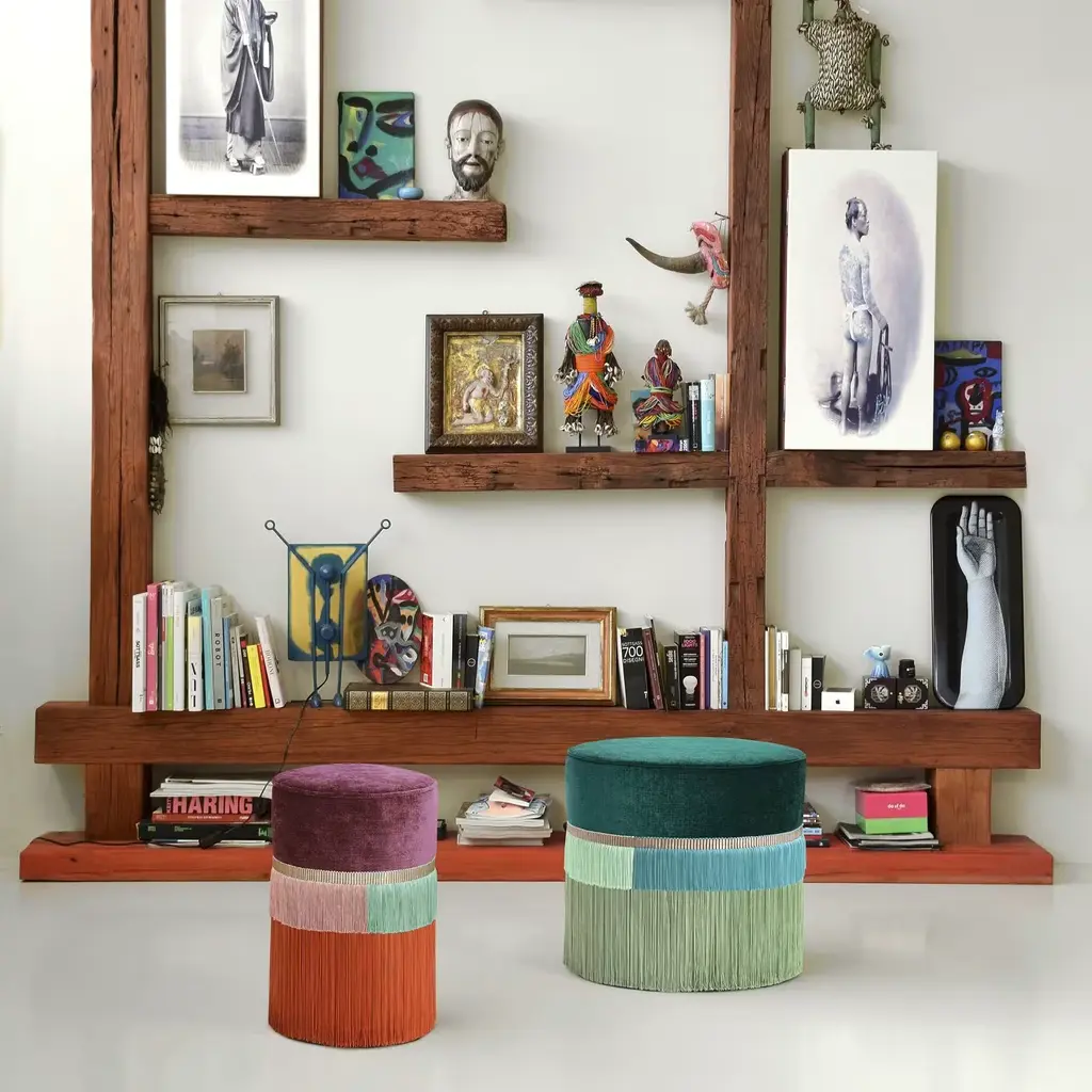 This colorful pouf differs by others thanks to the use of the viscose fringes of different colors and lengths. This choice creates a unique design on this item that is characterized by a multicolor line-like shape. Its base is in painted beech wood padded with synthetic material and upholstered with superior purple velvet 100% trevira. This pouf is completely made in Italy. Each bespoke piece is stamped on the bottom of the pouf’s lining and personally signed, numbered, and dated by designer.